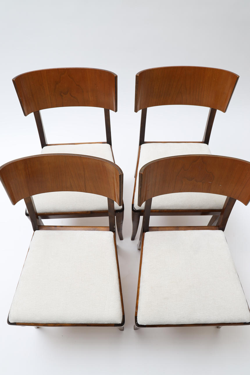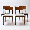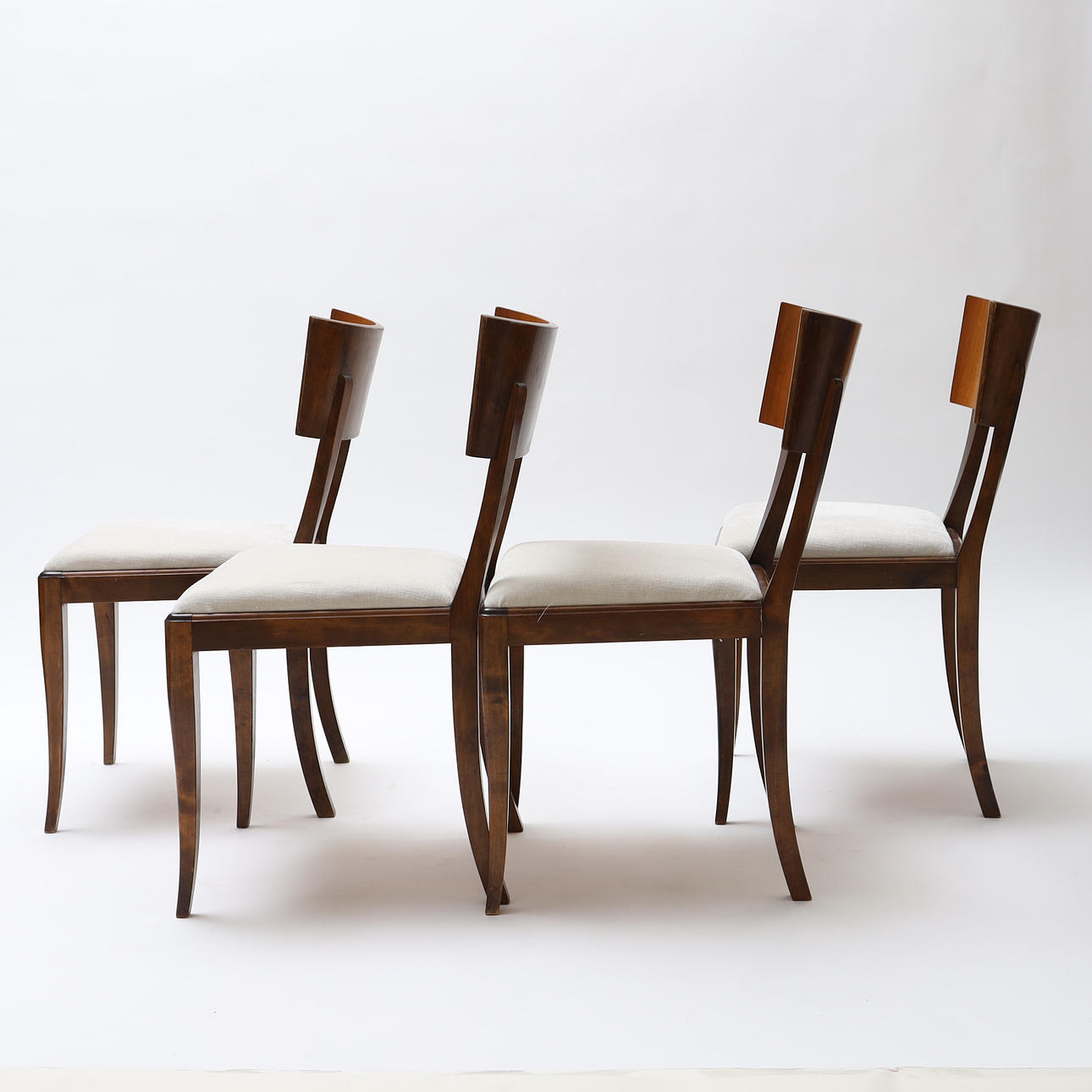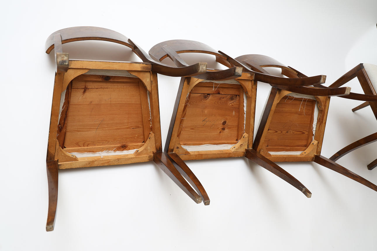Bonded birch and stained wood. Swivel back washers. Slightly swung legs. Loose upholstered seats. Height 83cm.