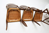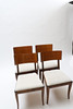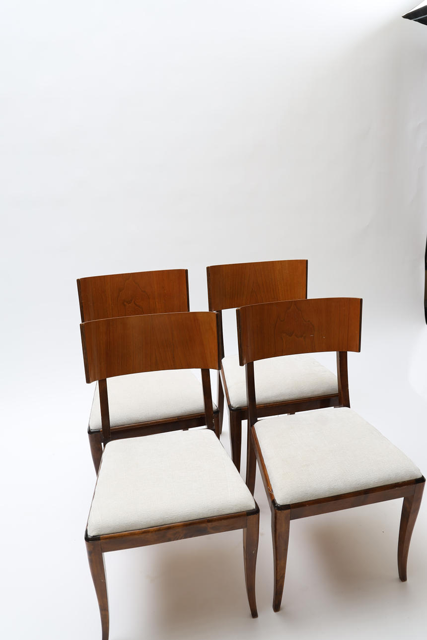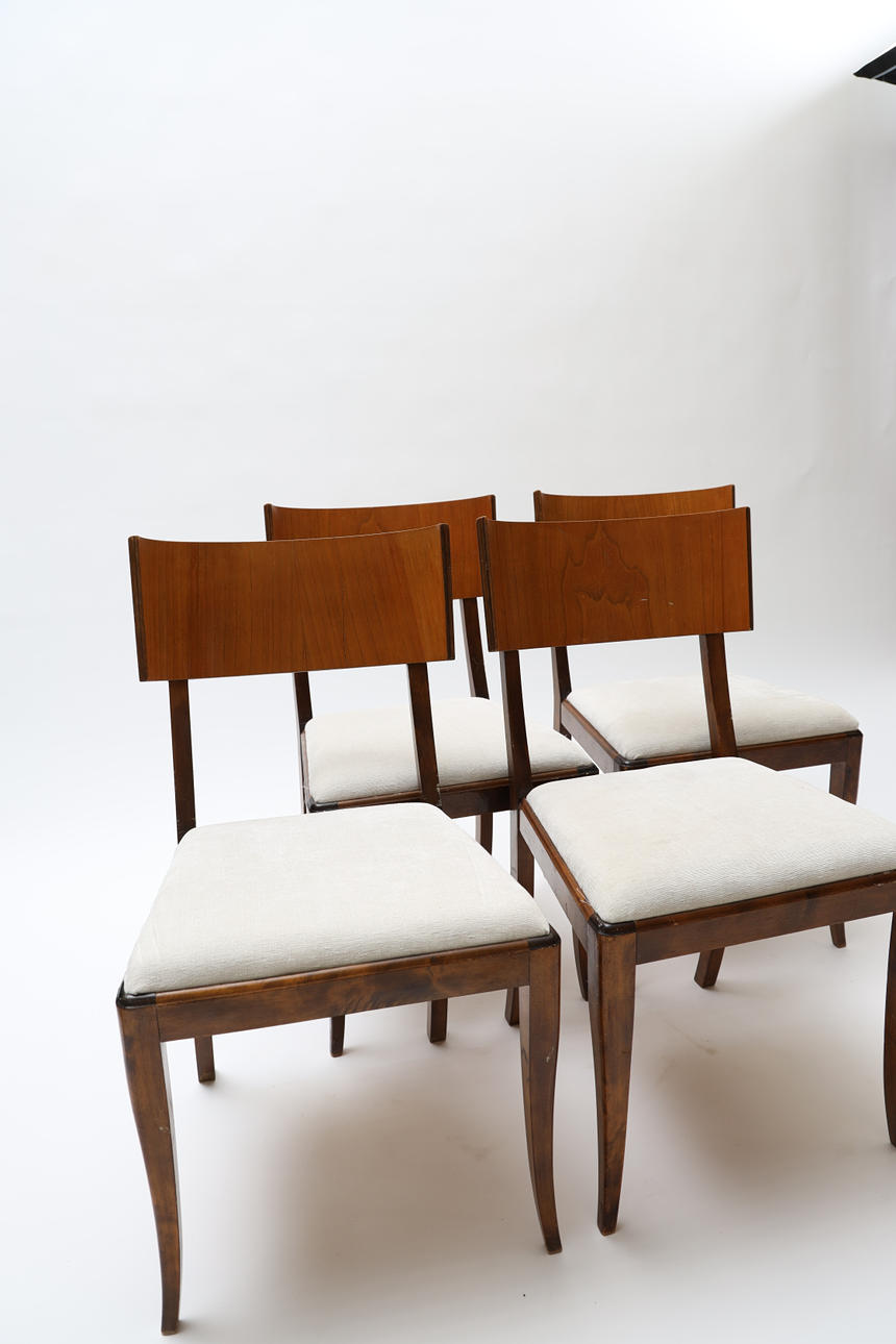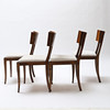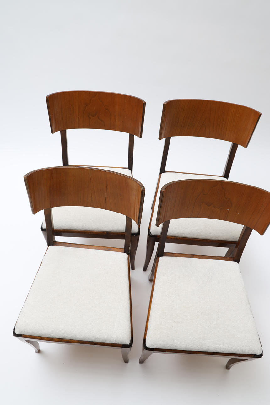 Bonded birch and stained wood. Swivel back washers. Slightly swung legs. Loose upholstered seats. Height 83cm.
