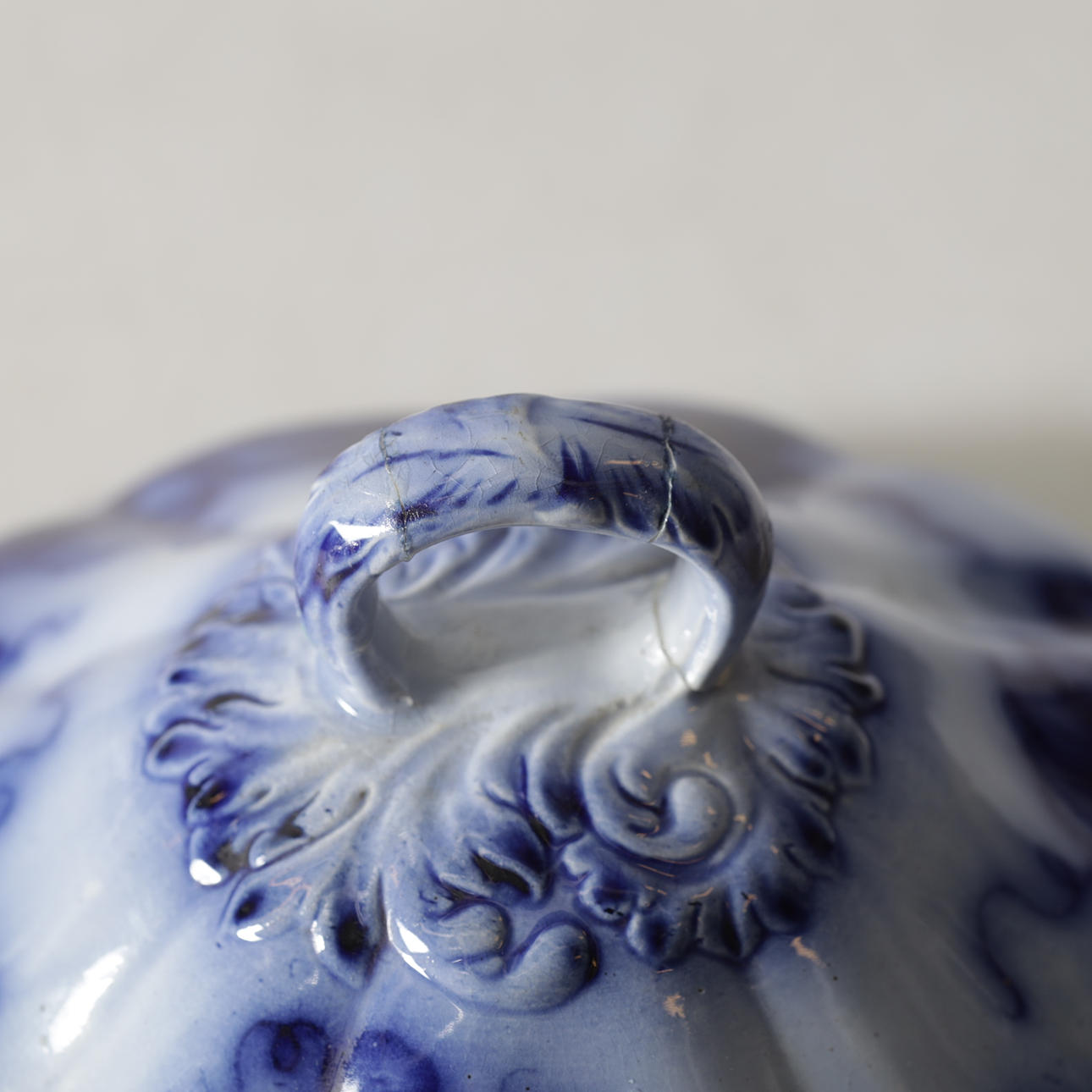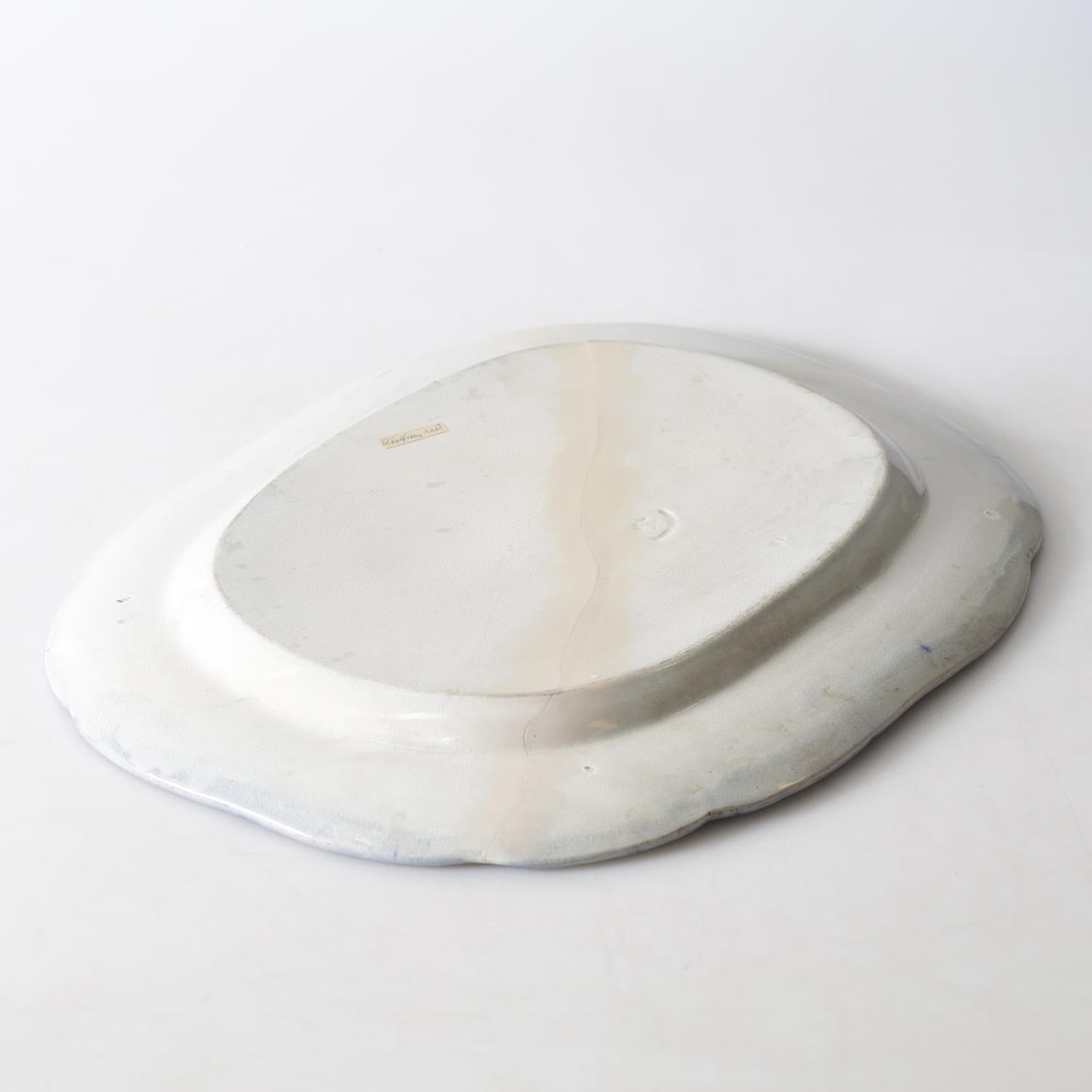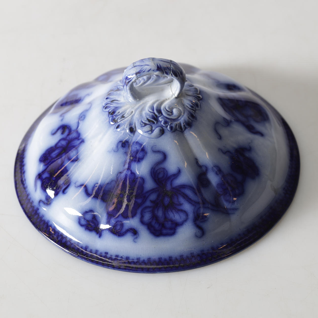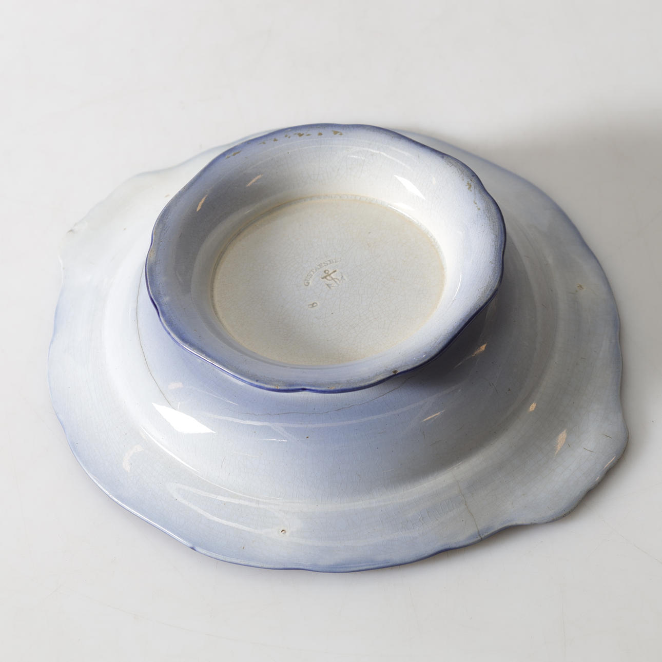 Normal wear and tear. Scratches, stains and cracking. Owner initials below. Rejection with mending on the terrine bud, as well as larger crack with cooking on serving dish.