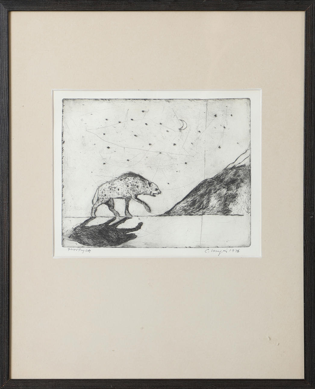 4987723. OIDENTIFIERAD KONSTNÄR. Hyena in landscape, etching, indistinctly signed.