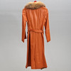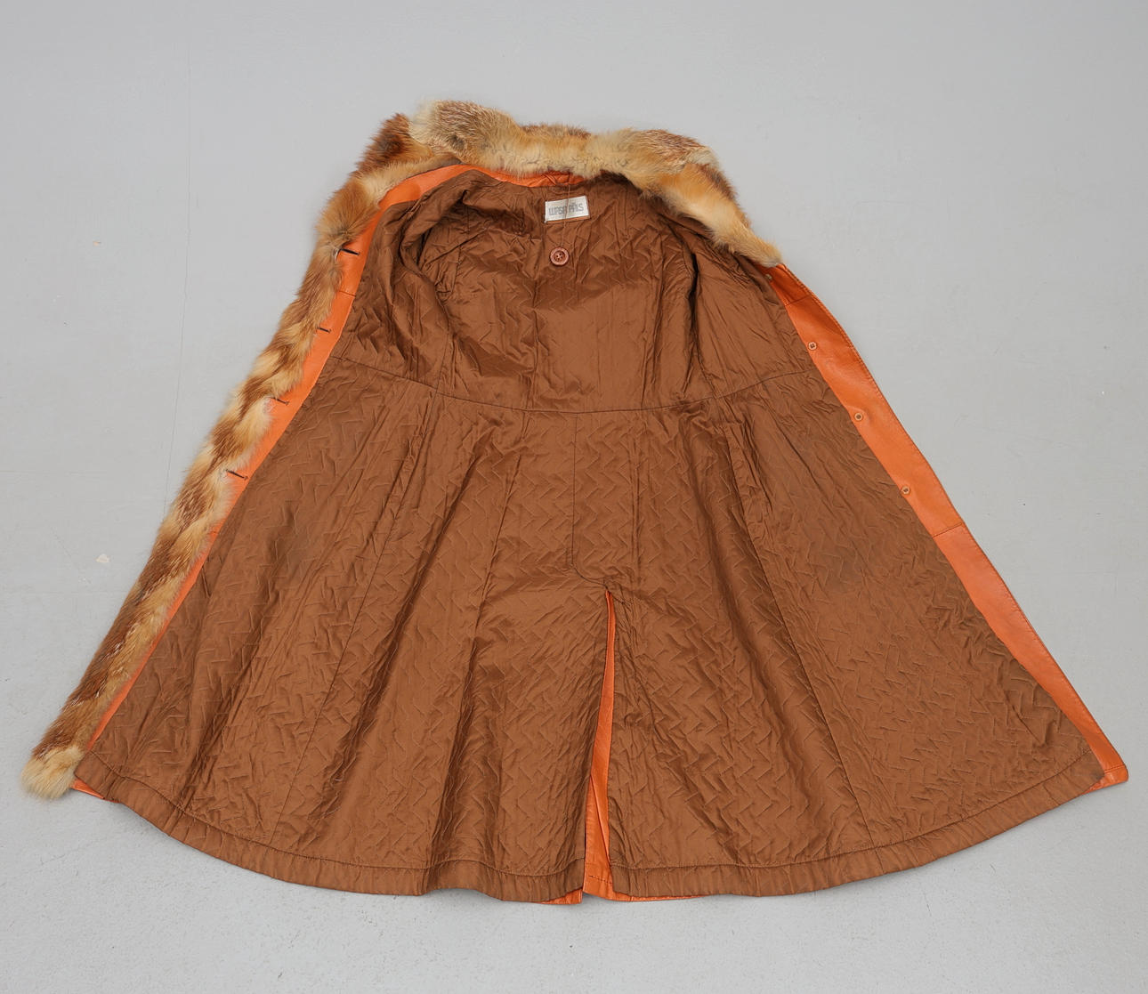 Leather coat, with fur collar red fabric. Wooden buttons, size approx. 34, back length 114 cm.