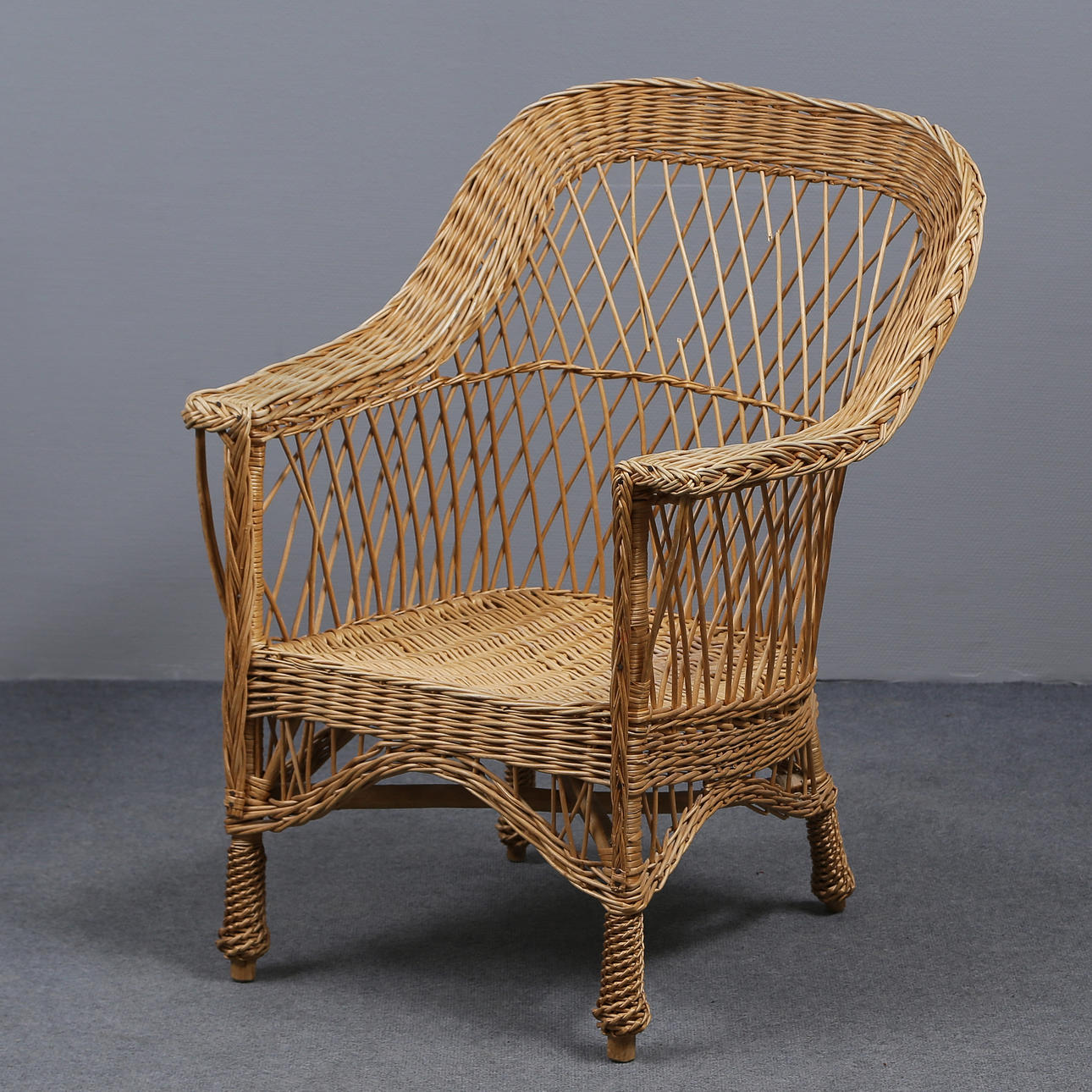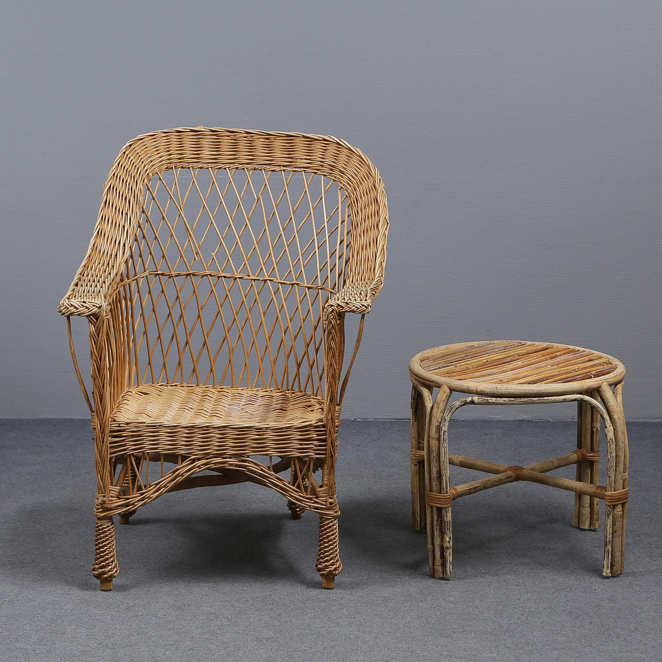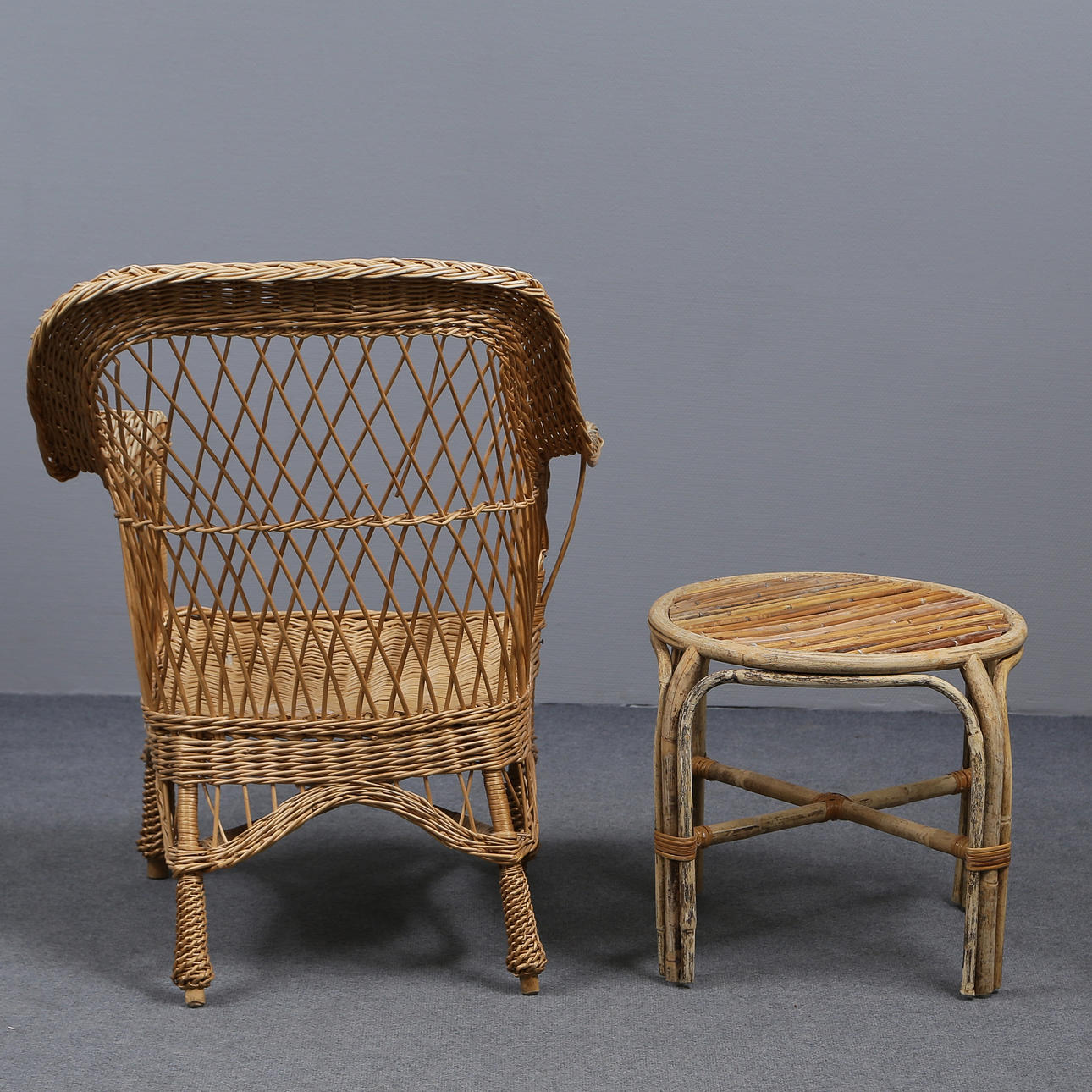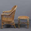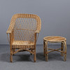 Wicker chair height 95, width 68, seat height 39 cm Table height 46, diameter 56 cm.