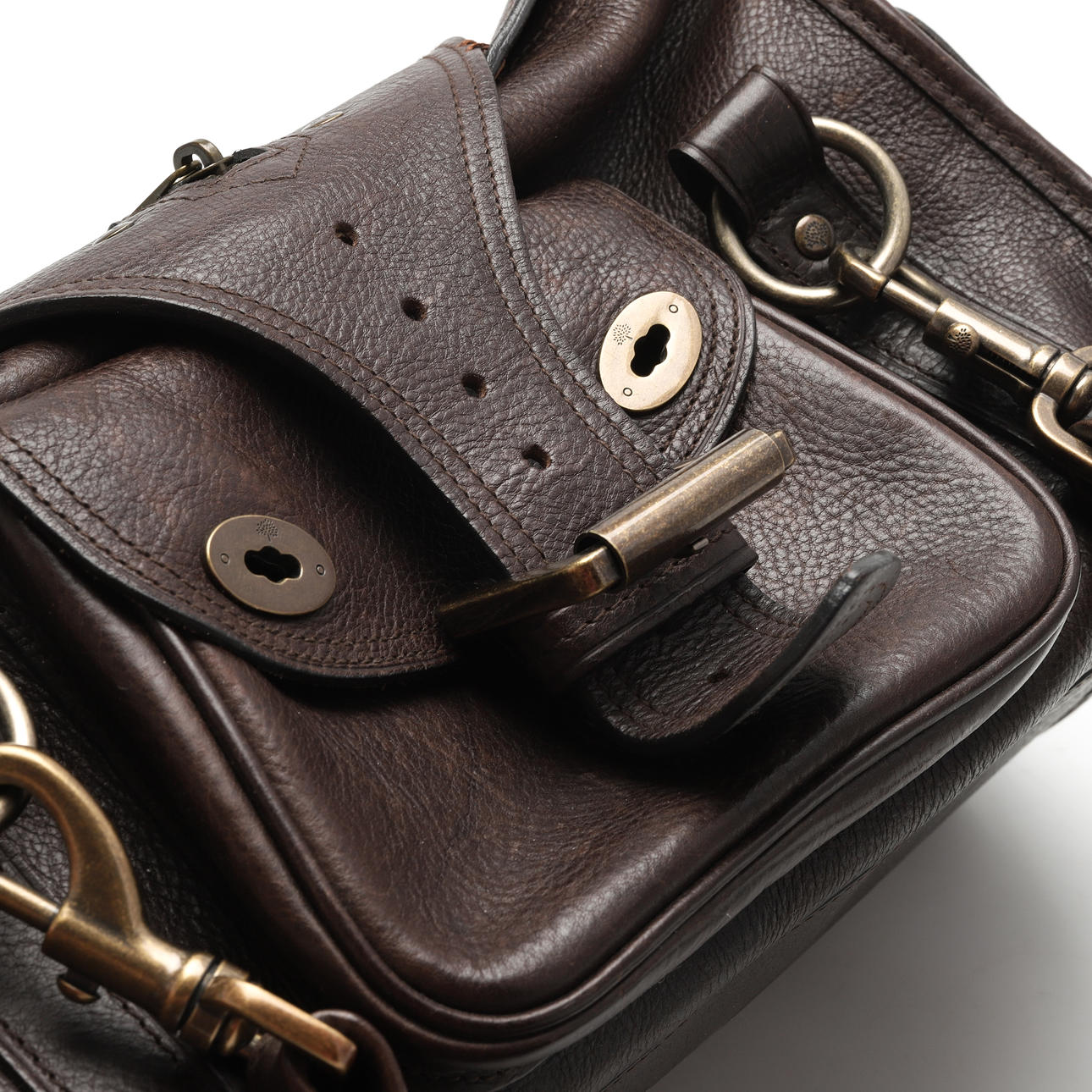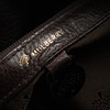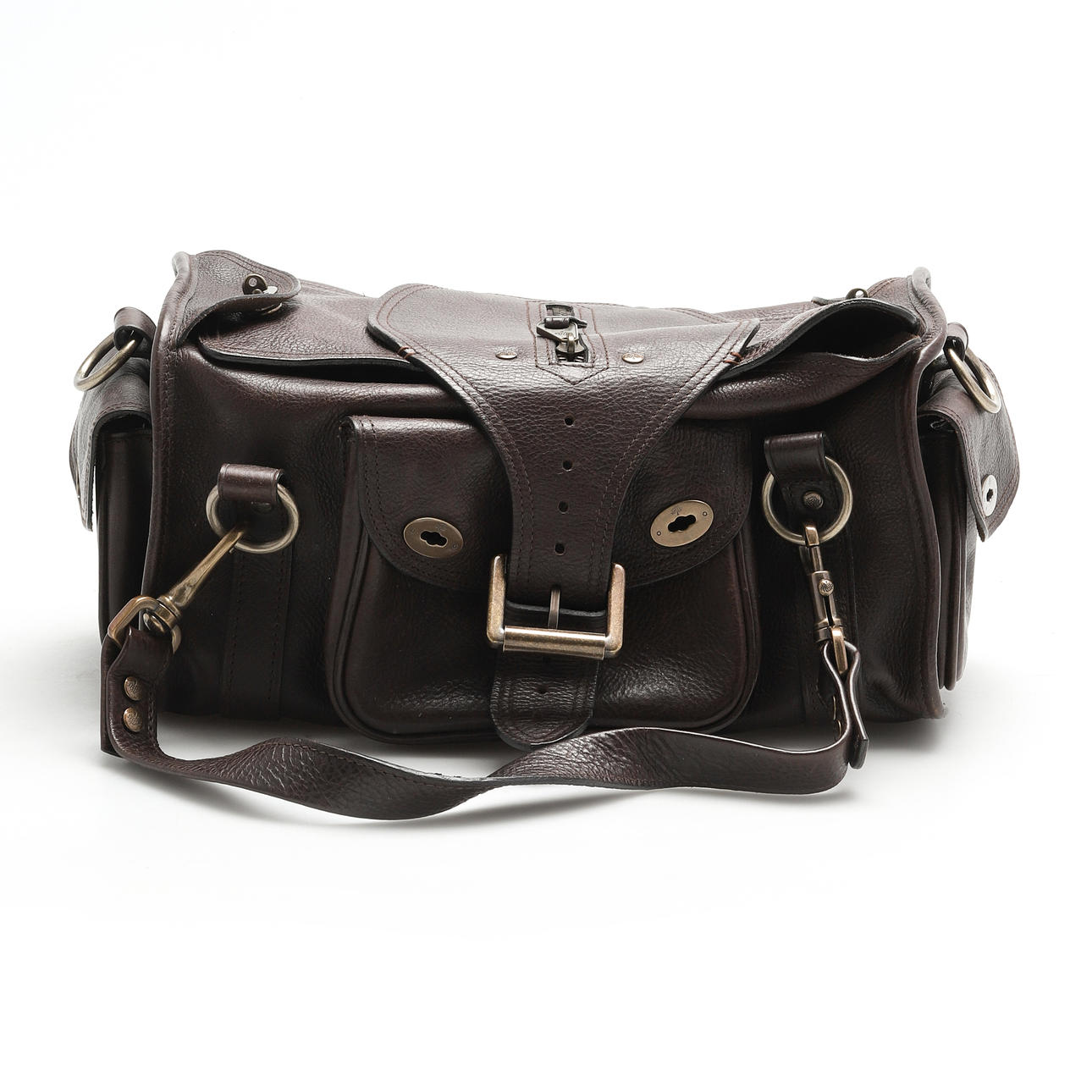 Brown leather. Interior with zippered compartment. Brass details. Front buckle with magnetic closure. Dust bag. Length approx. 33 cm. Depth approx. 18 cm. Height approx. 17 cm.