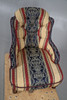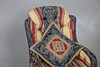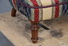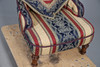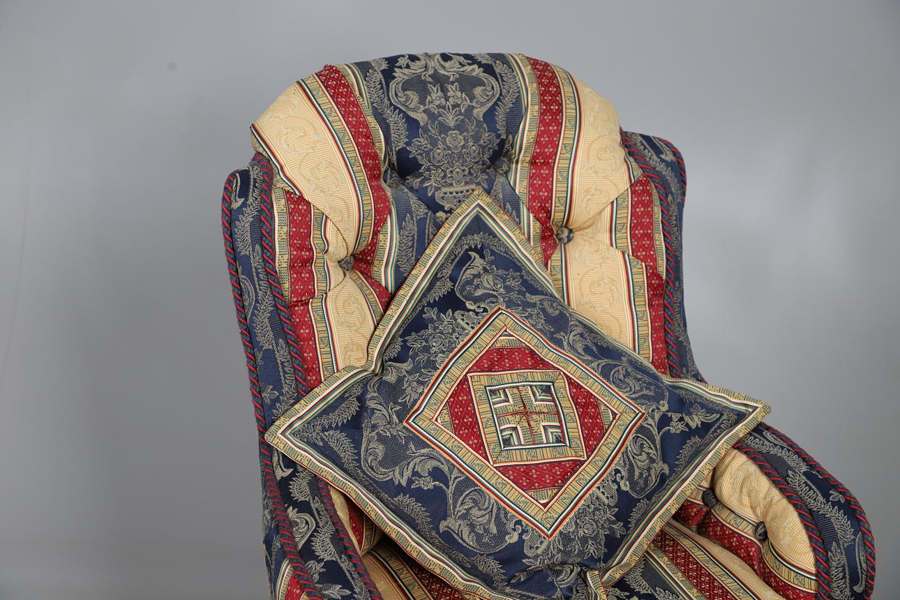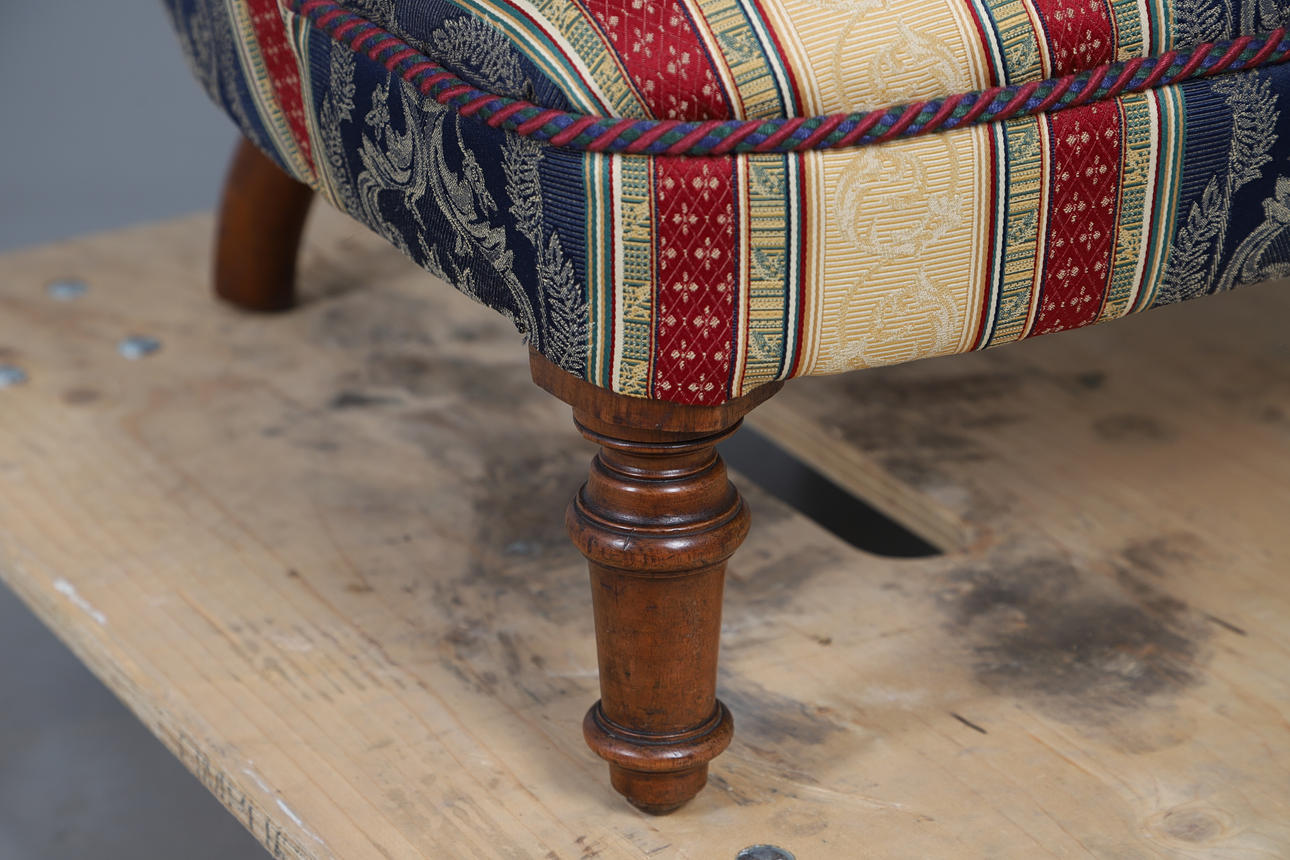 In cream, red and navy with neoclassical motifs, raised on turned walnut supports, W55 x H69 x D85cm, seat H30cm.