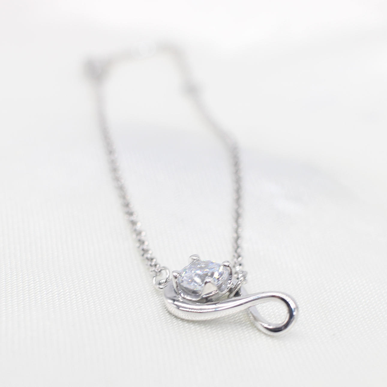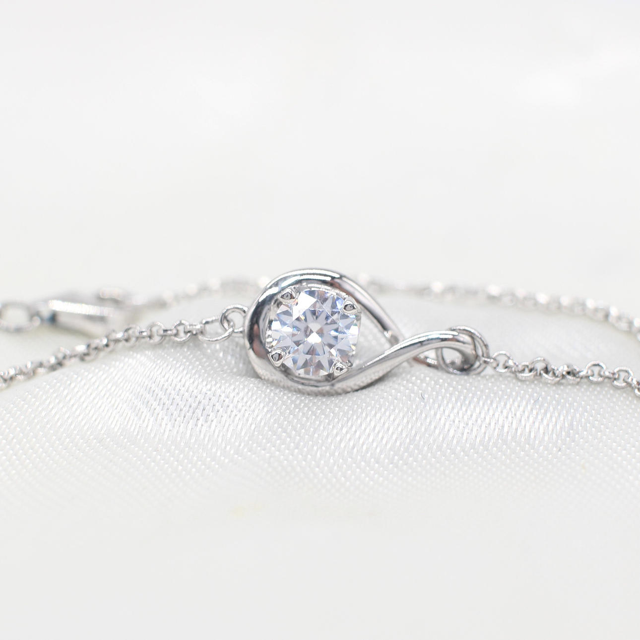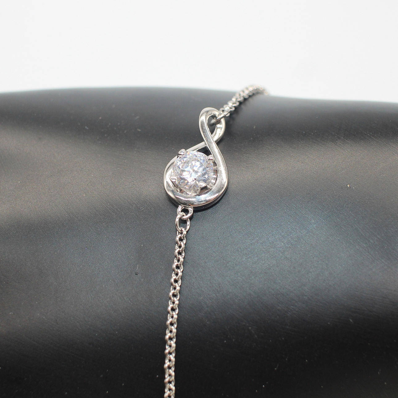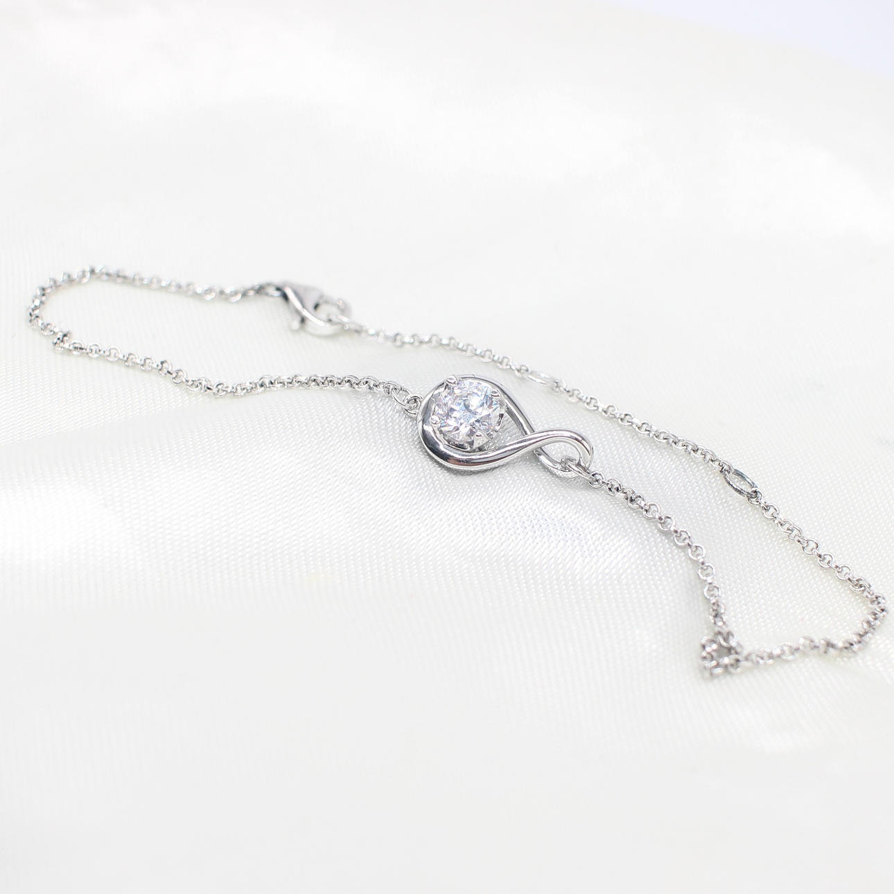 An infinity set white cubic zirconia solitaire and silver (stamped 925) link bracelet with a lobster claw clasp.