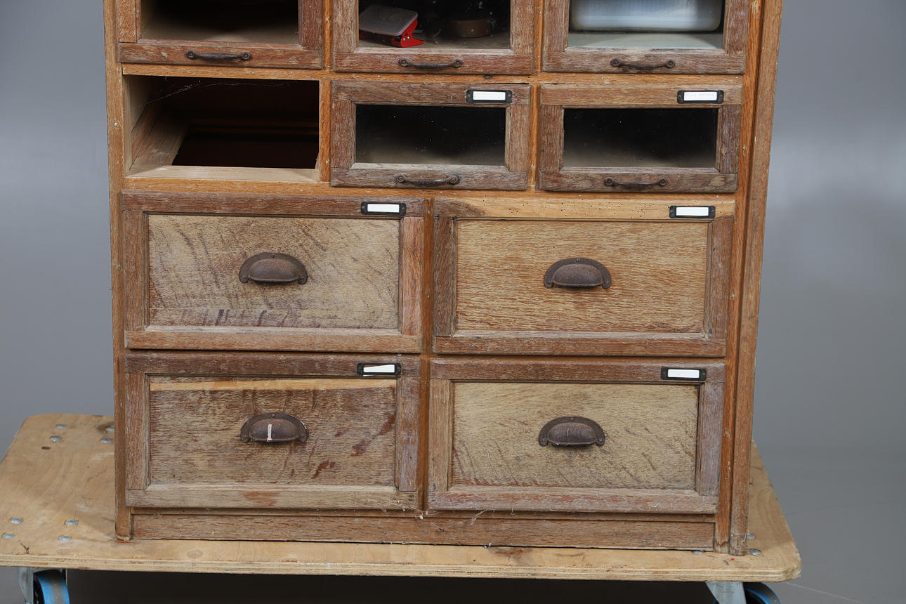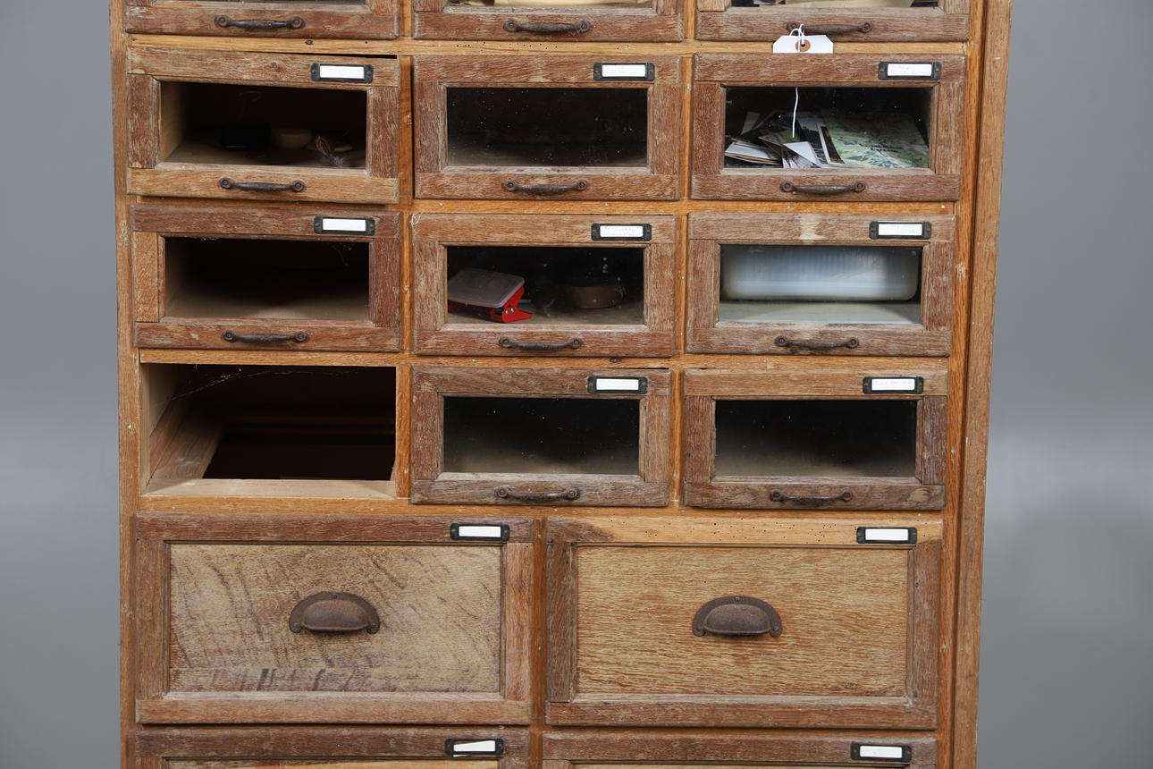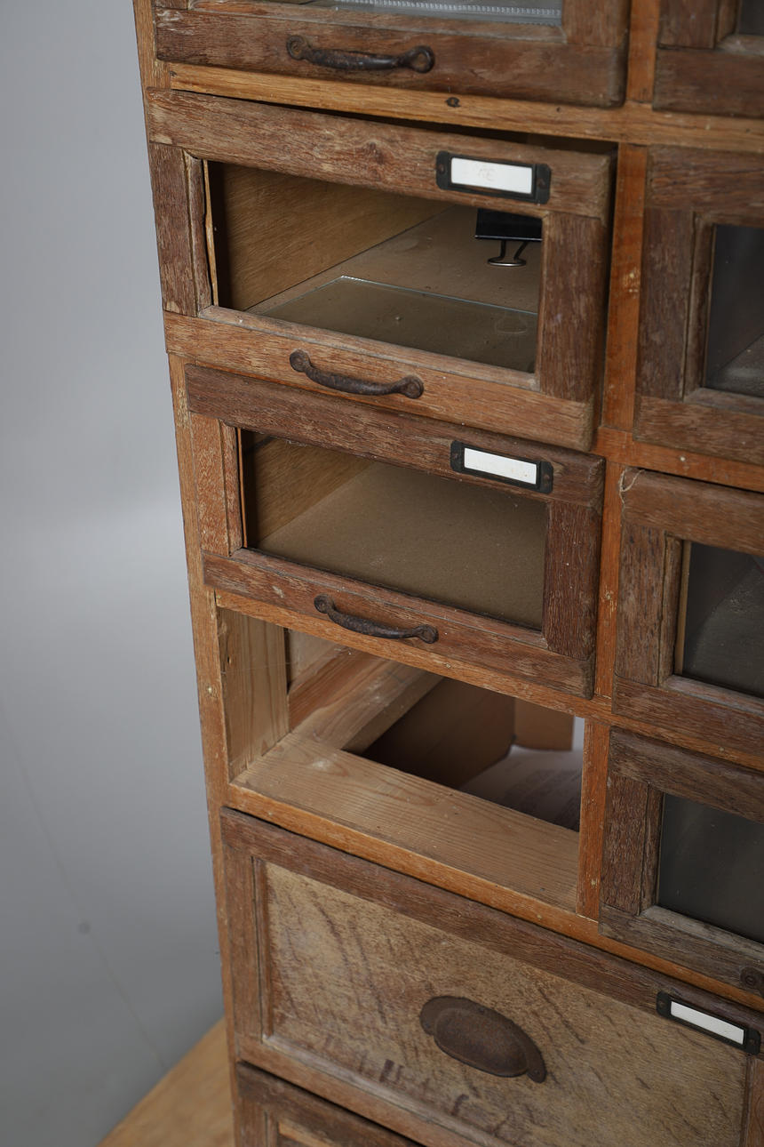 With three columns of eight glazed front drawers, above four short drawers. Height 192cm x Width 91cm x Depth 46cm.