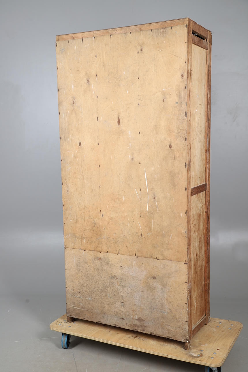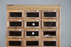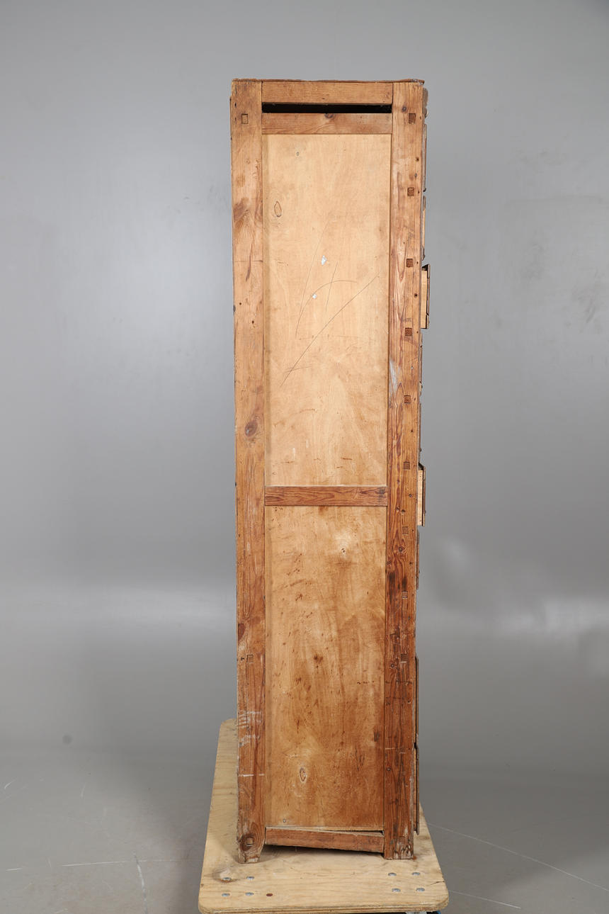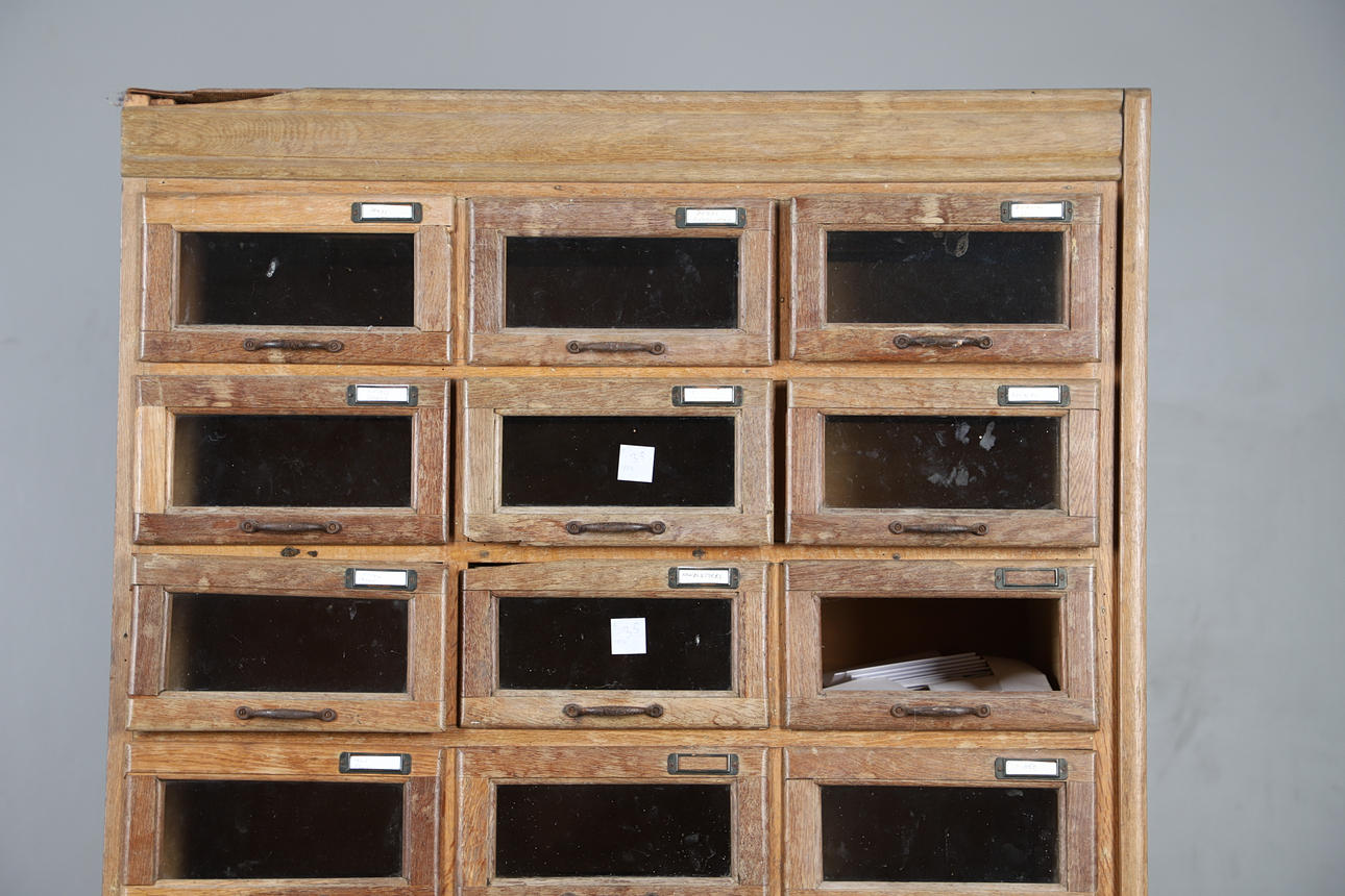 With three columns of eight glazed front drawers, above four short drawers. Height 192cm x Width 91cm x Depth 46cm.