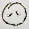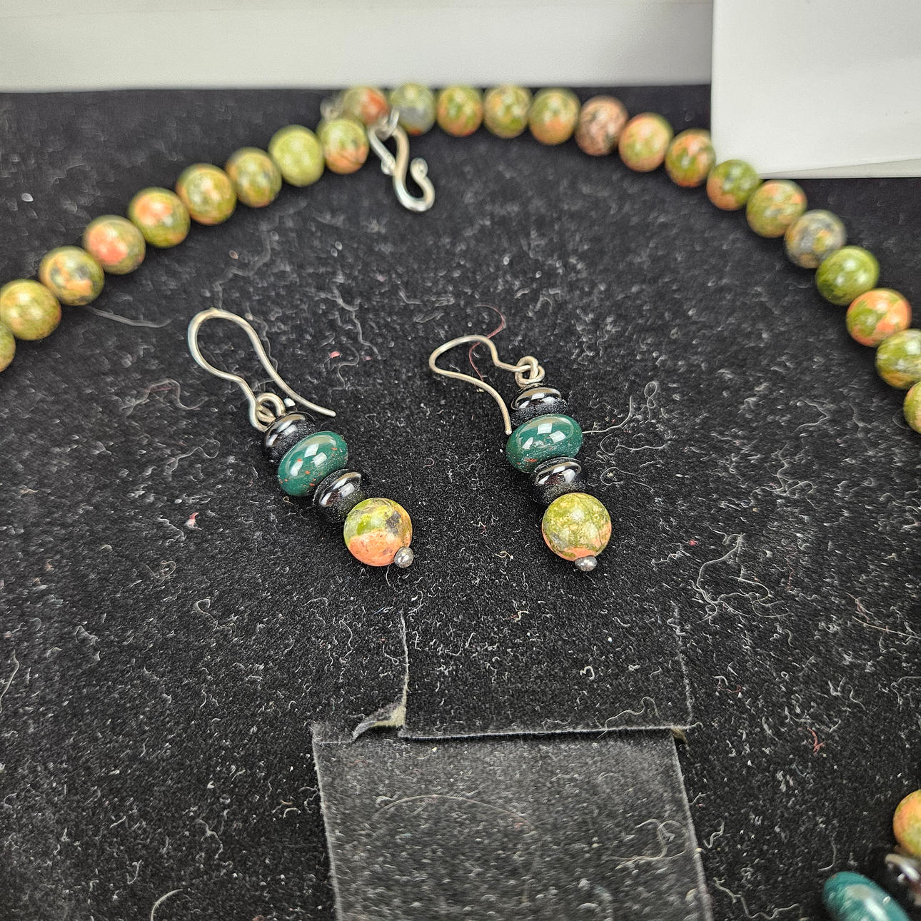 In case, approx. 18x18 cm. Necklace, length approx. 45 cm. Earrings, a pair, height 3 cm.
