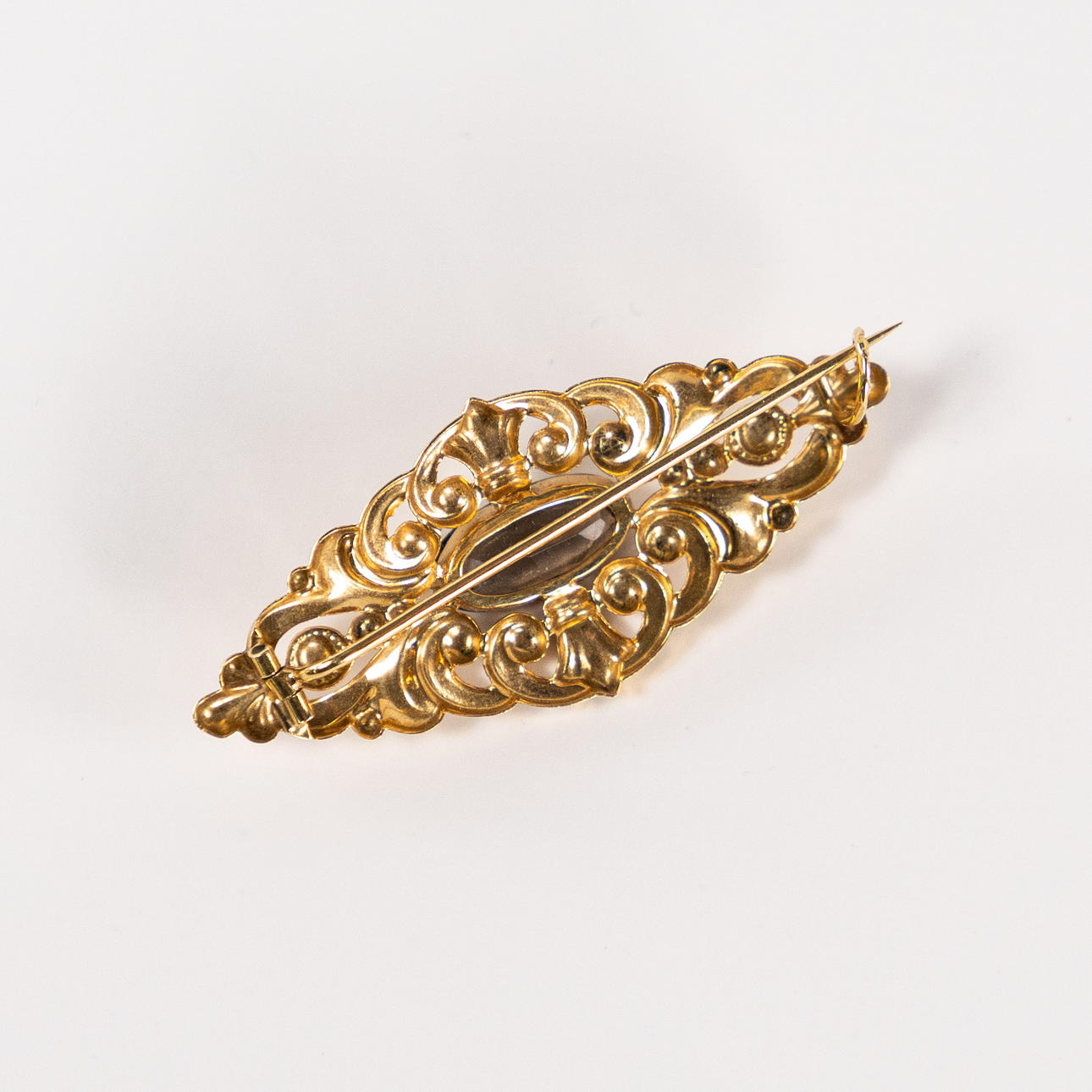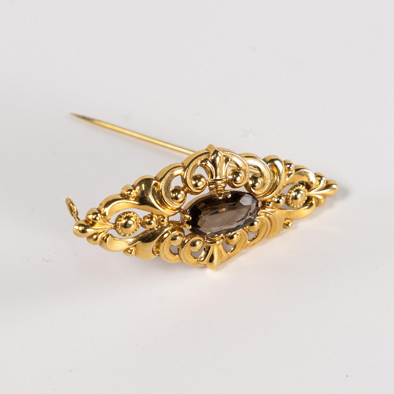 Brooch, 18k gold, with smoky stone, width 52 mm, weight 4,1 gram.