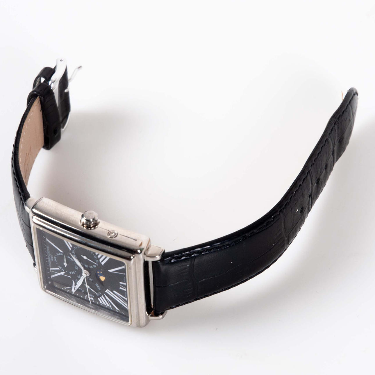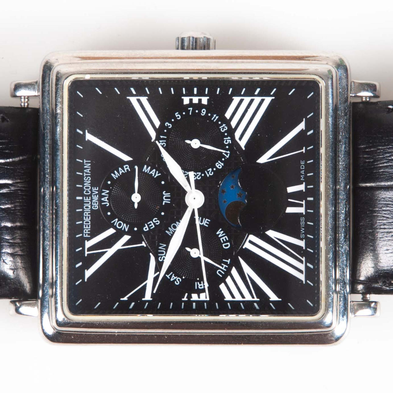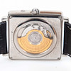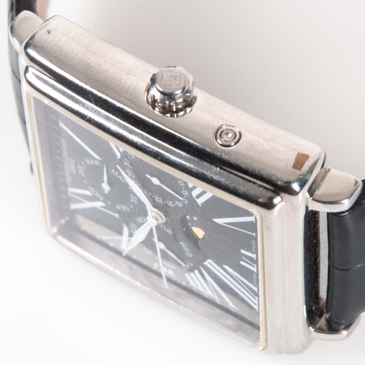 Automatic wristwatch in rectangular case, approx. 39 x 38 mm. Blackboard with roman numerals, display for day, date, month and moon phase. Transparent back cover. Swiss Made. Mounted on leather straps.