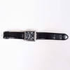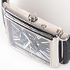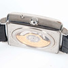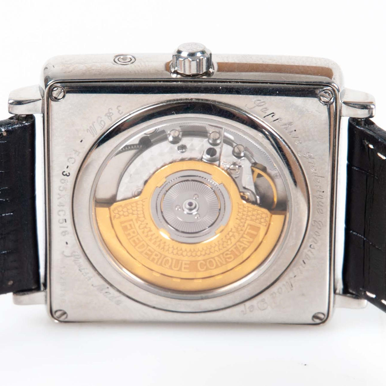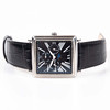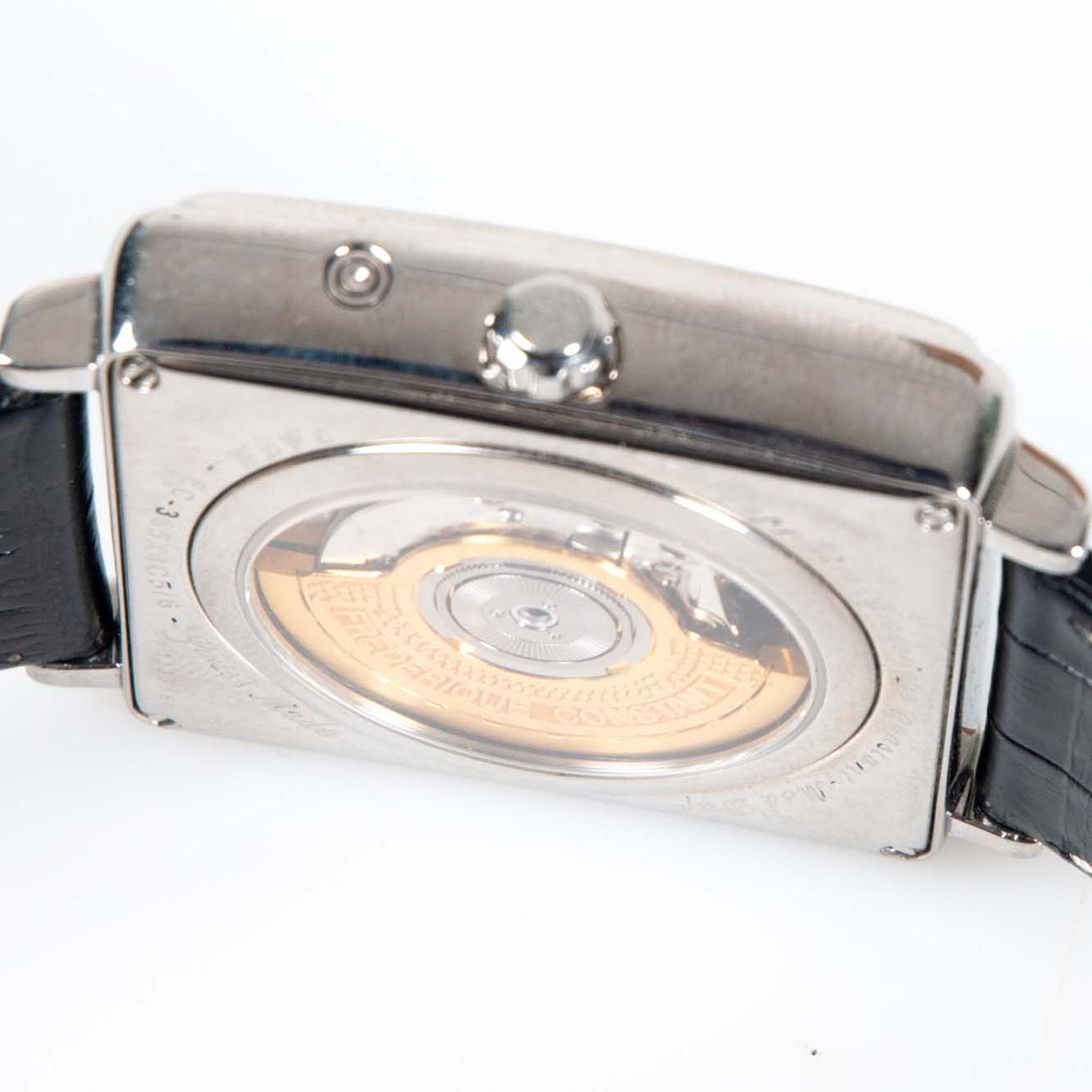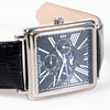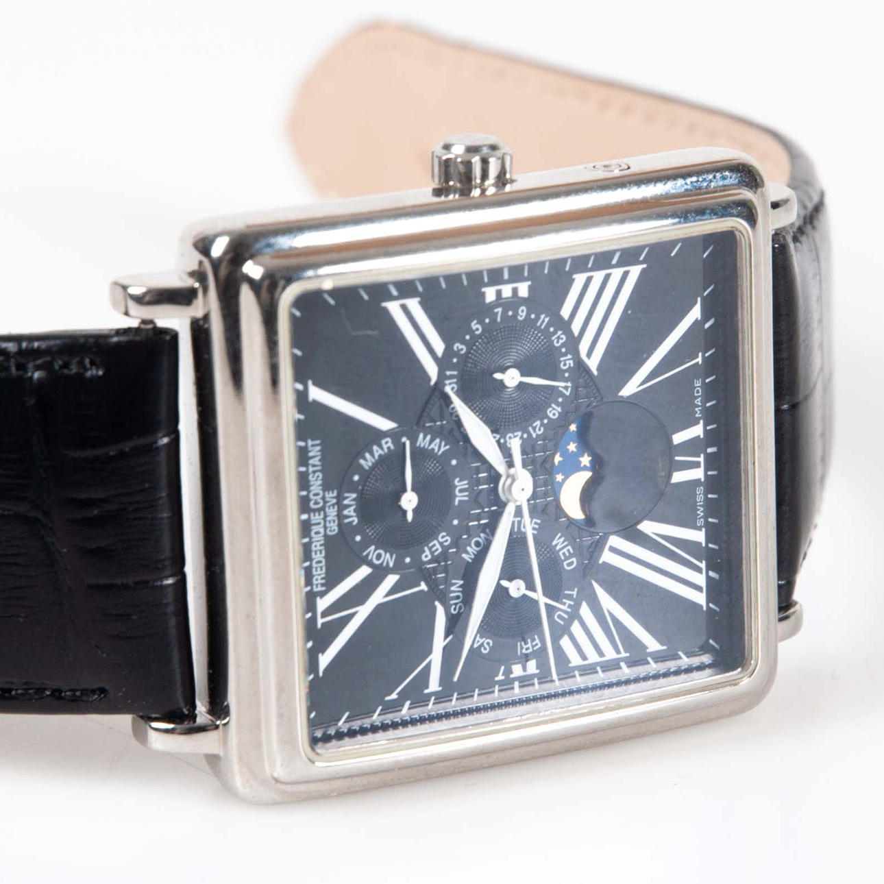 Automatic wristwatch in rectangular case, approx. 39 x 38 mm. Blackboard with roman numerals, display for day, date, month and moon phase. Transparent back cover. Swiss Made. Mounted on leather straps.