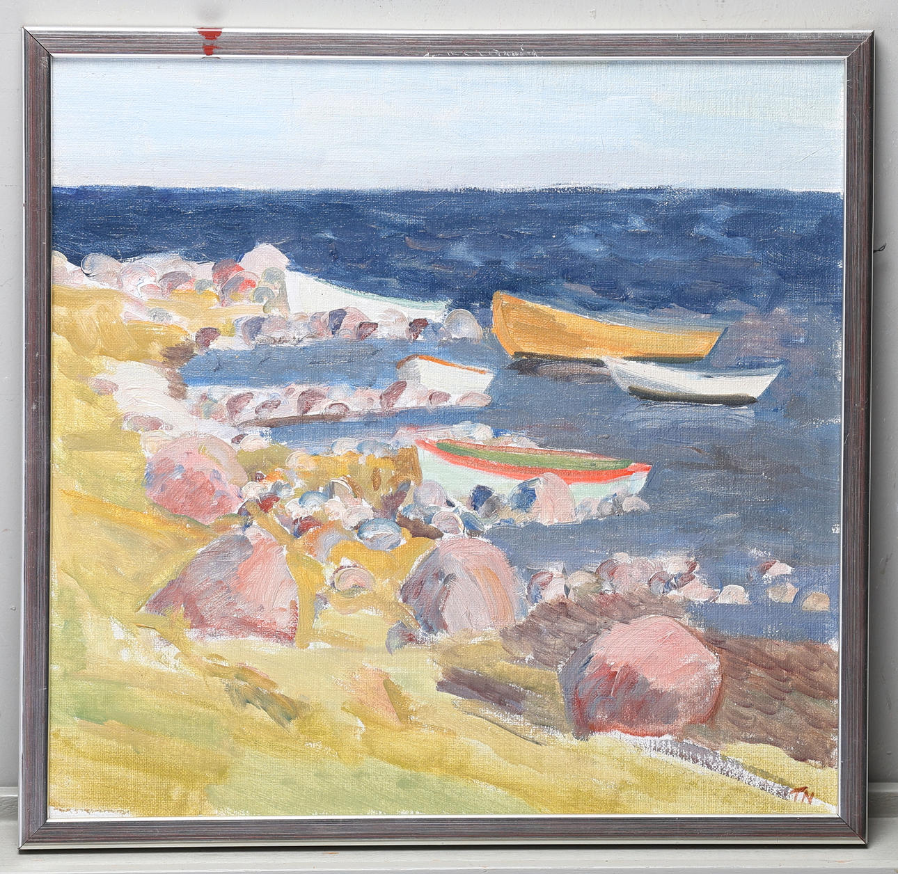 4989250. TAKE E NILSSON. Oil on panel, “Boats by Öland strand”, signed dated -83.