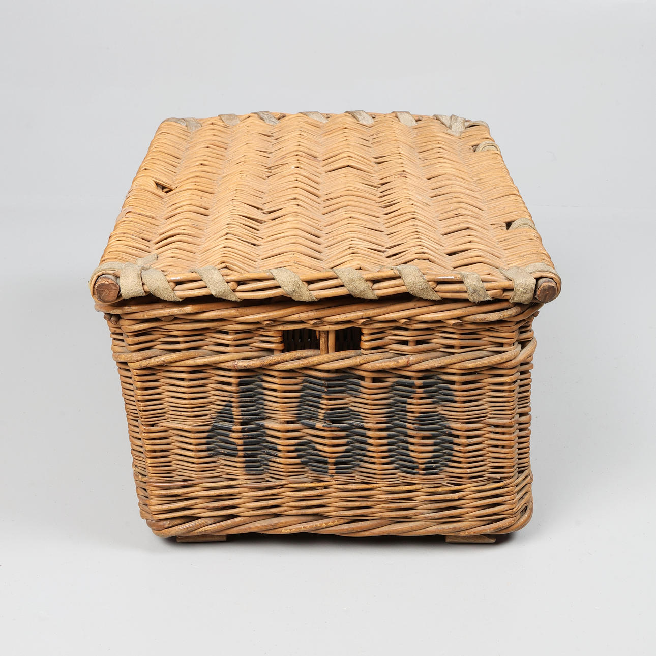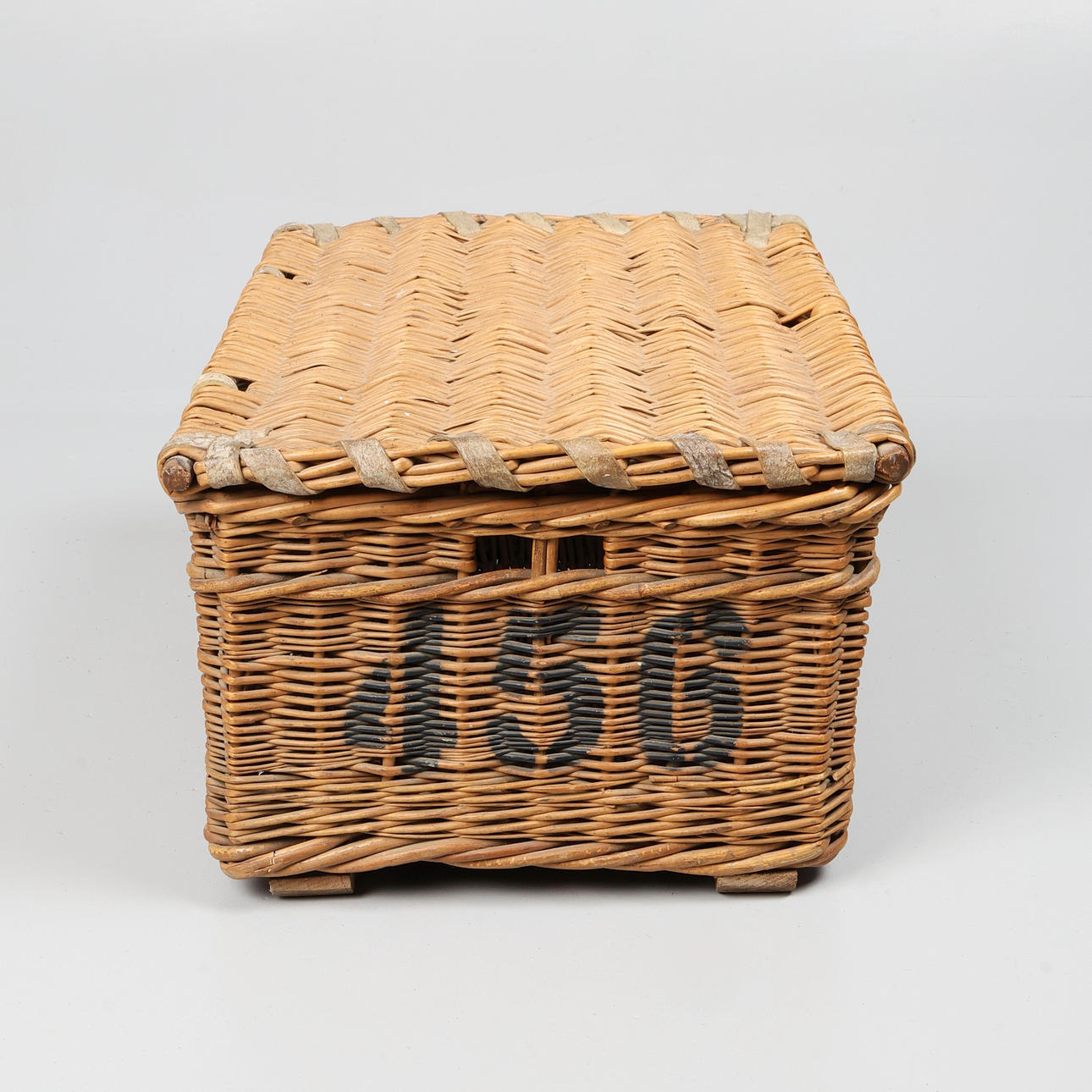 With handles to side, leather reinforcing straps to cover, marked 'SUNDRY LAUNDRY,' 'T. E. BROWN' and '456,' H.31 x W.61 x L.43cm.