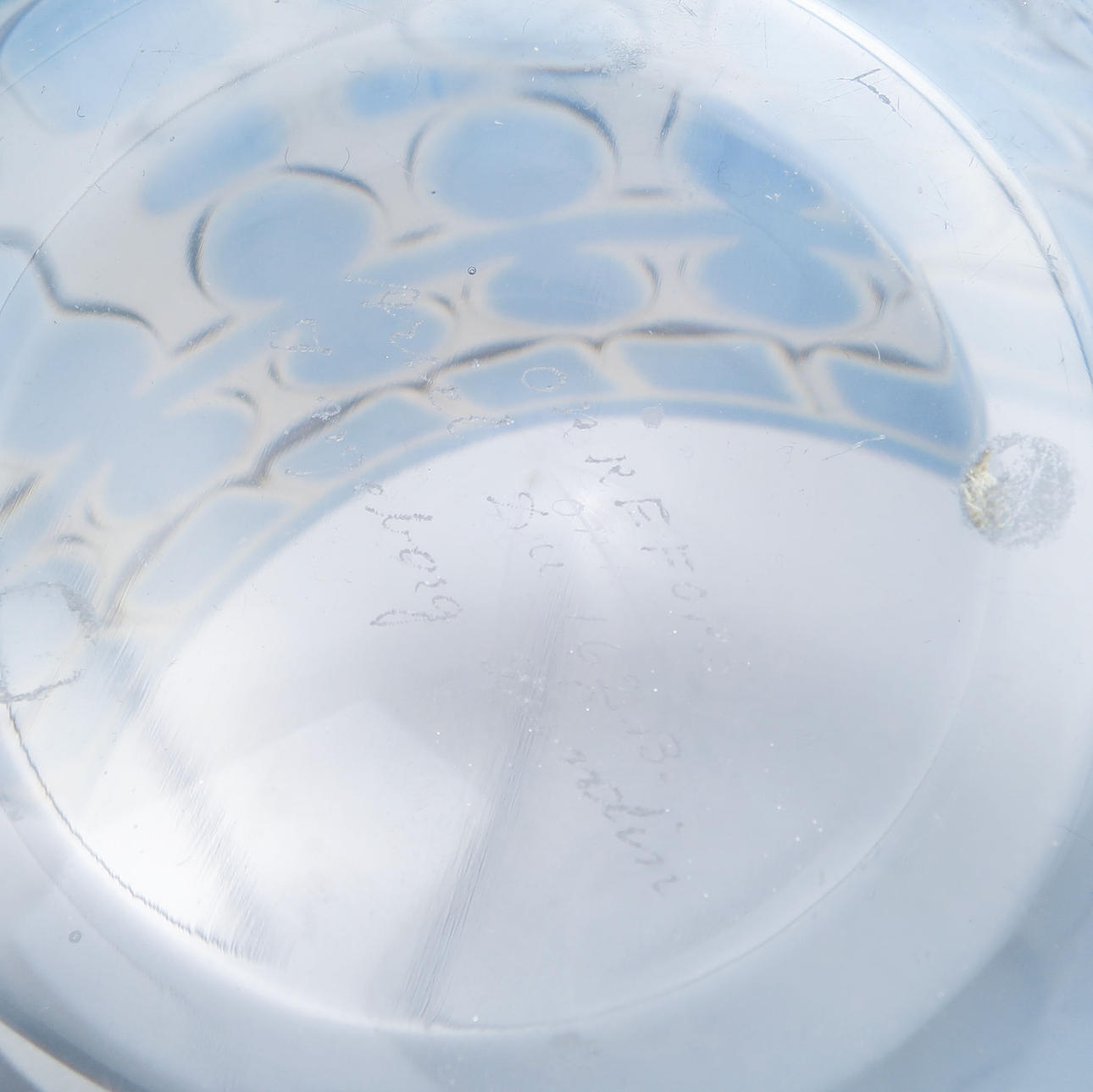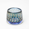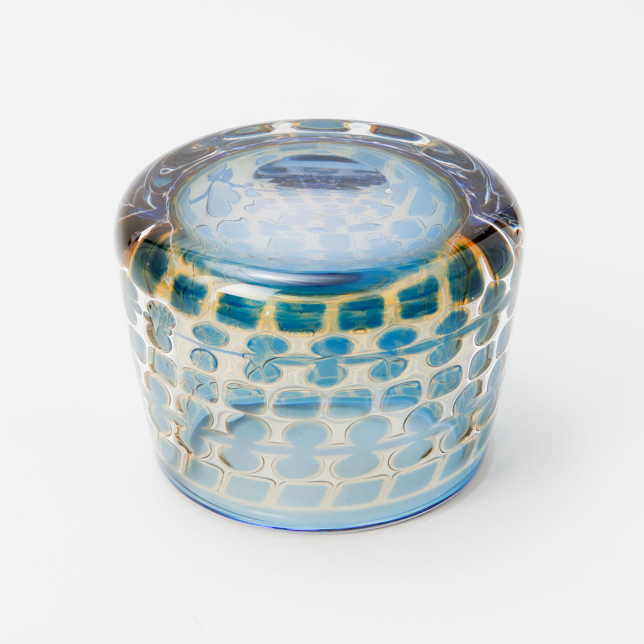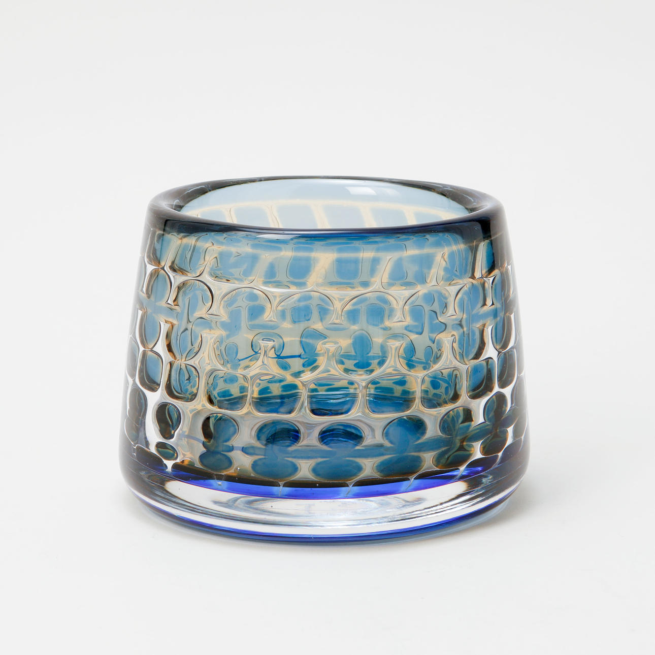 Round, slightly tapering form. Geometric decoration in blue and slightly yellow-tinted glass. Signed ORREFORS Ariel Du 162 B Ingeborg Lundin. Dia. at base approx. 16.5 cm, height approx. 12 cm.