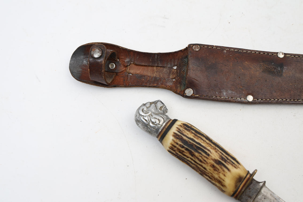 Shank in the form of a lion's head. Handles made of horns. Sheath made of leather. Knife length 25,5cm.