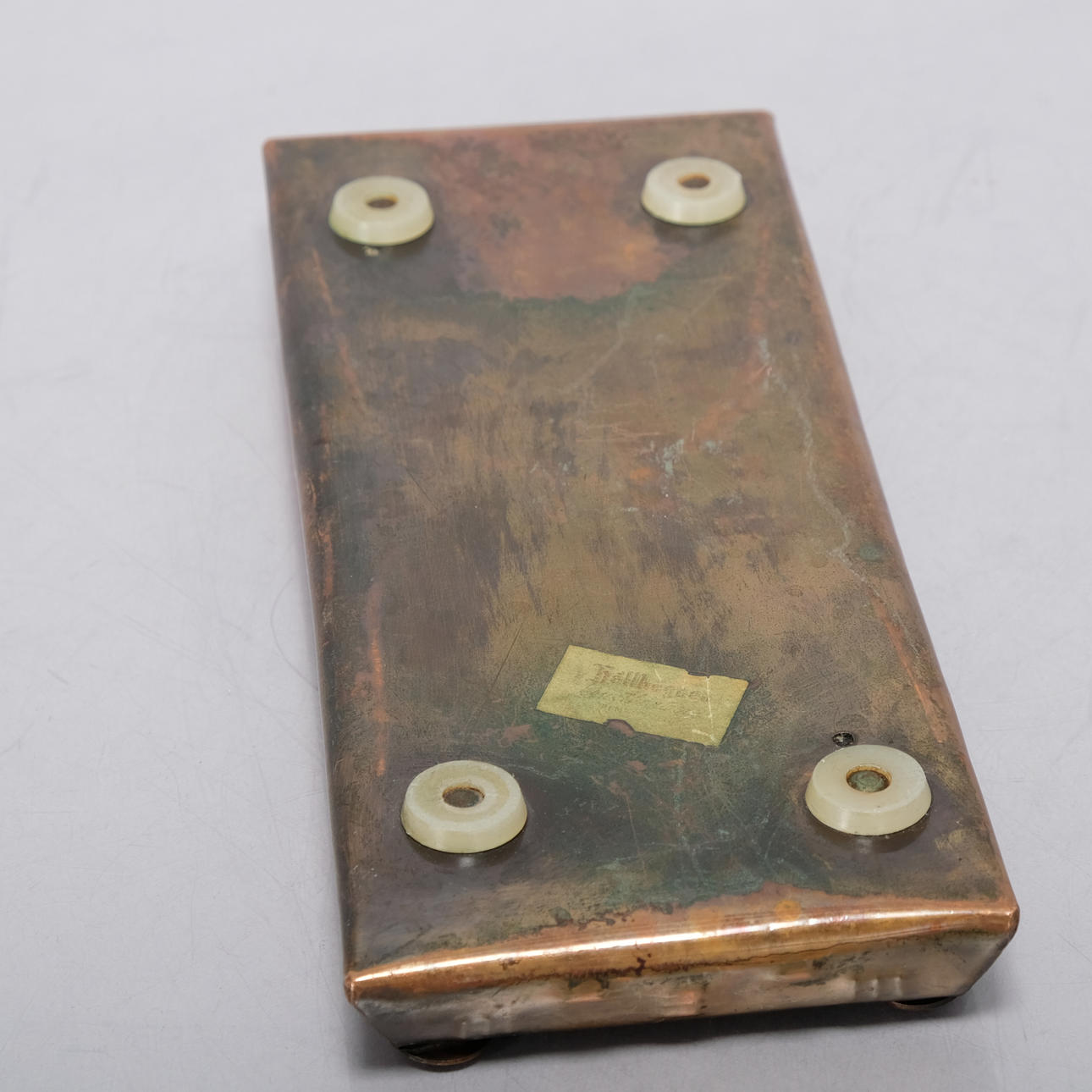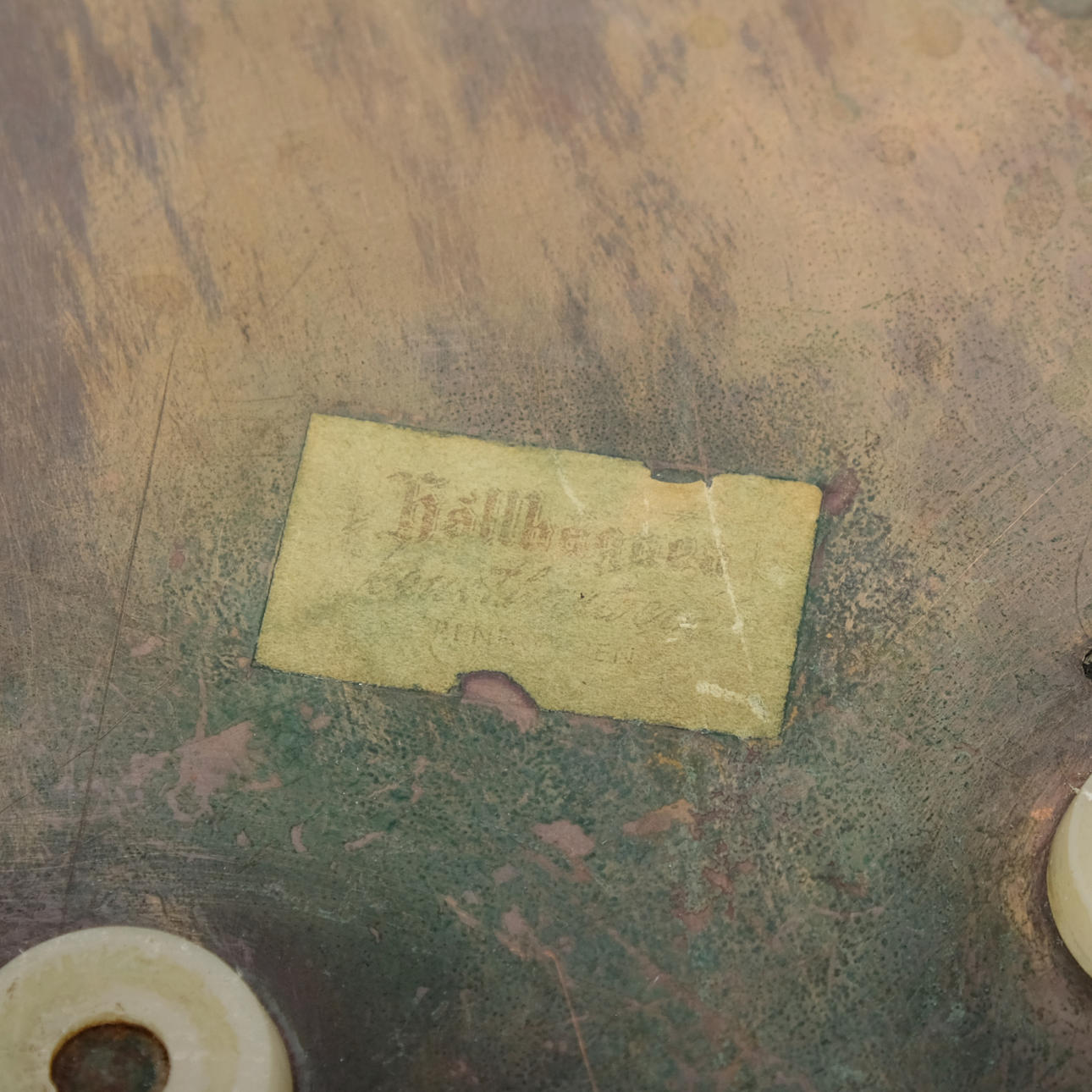 Normal wear and tear. Patina and wear of the metal. Less wear of the mosaic. Worn out marking underneath.