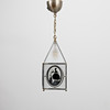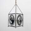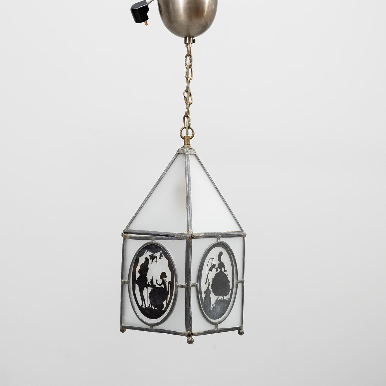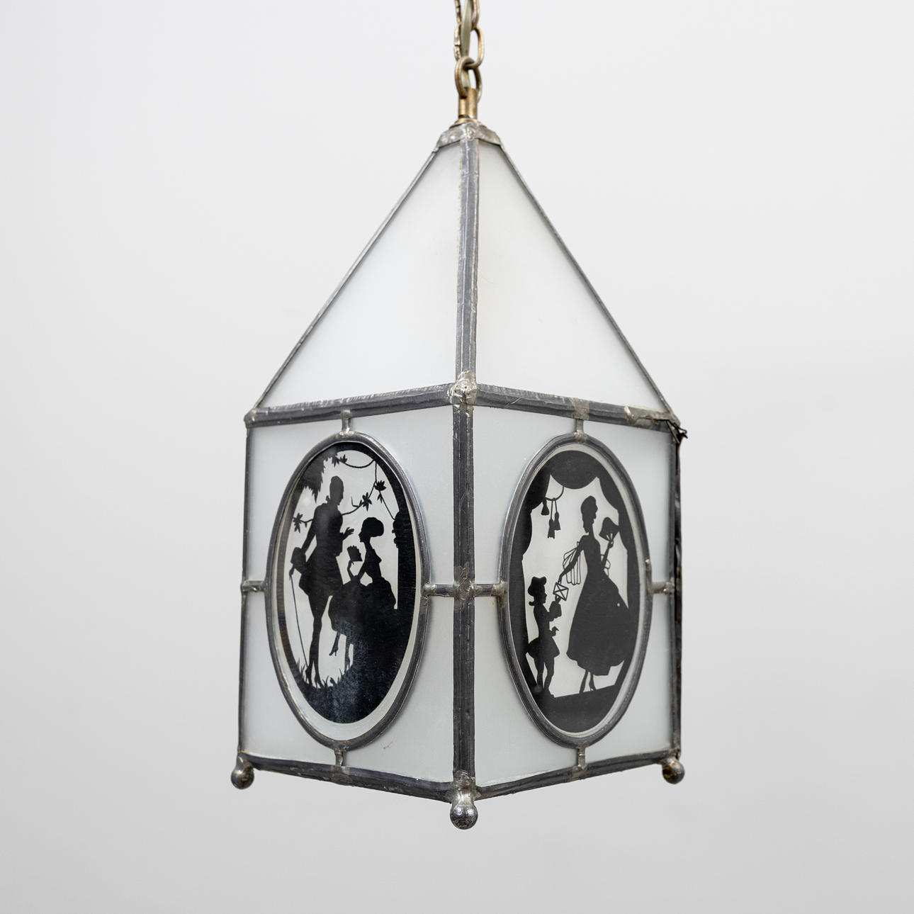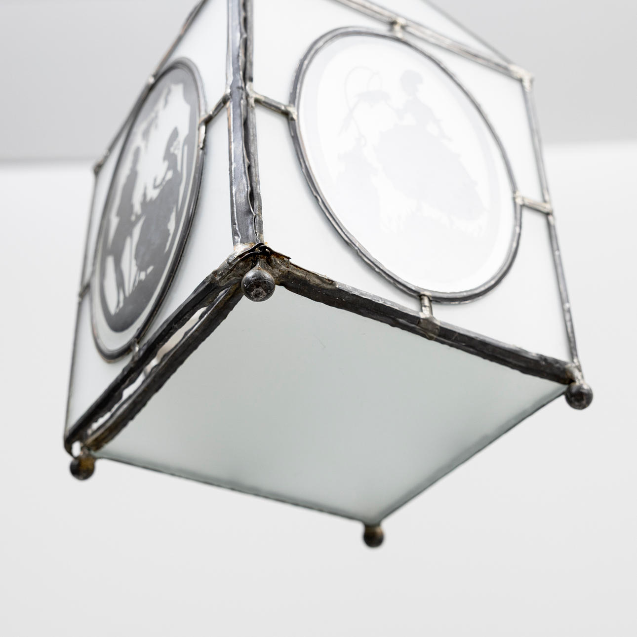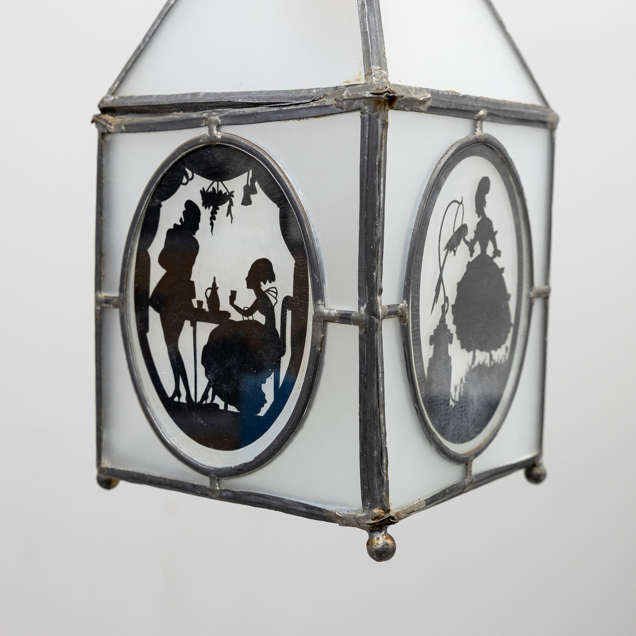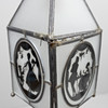 Nearly square lantern with sloping roof, for one light source. Lead-glazed opal glass with figurative scenes in black.