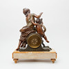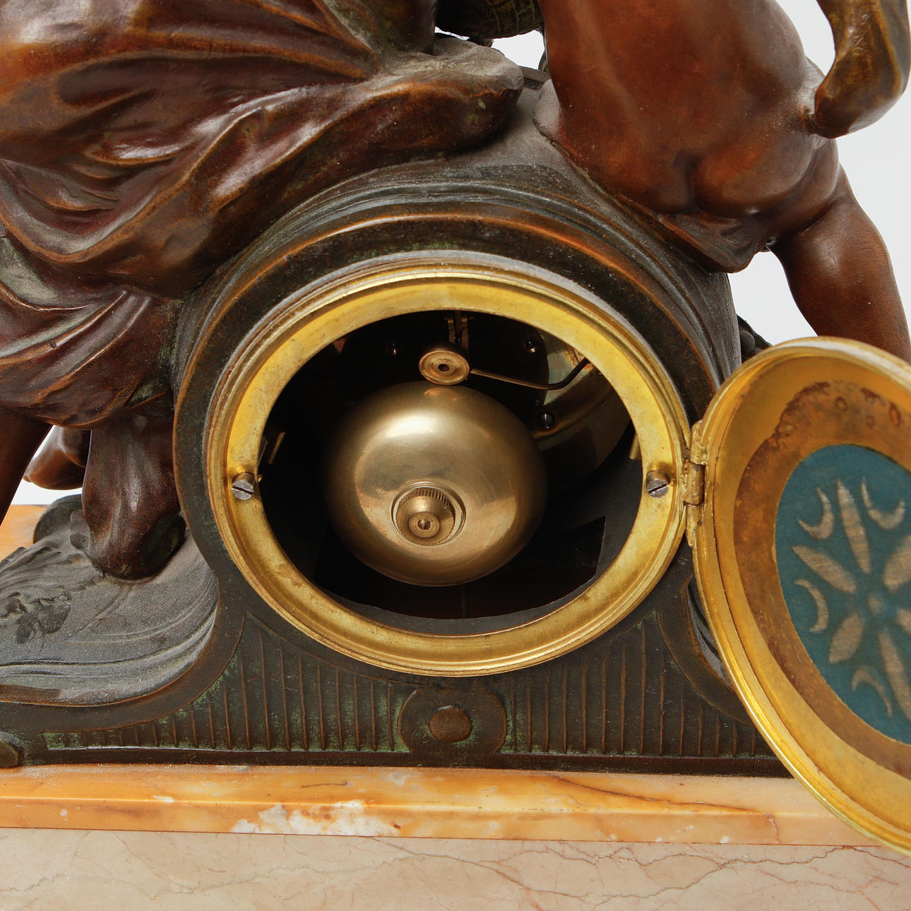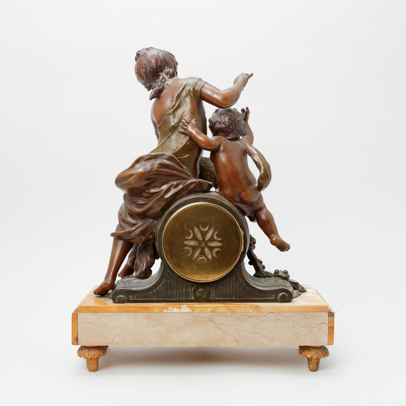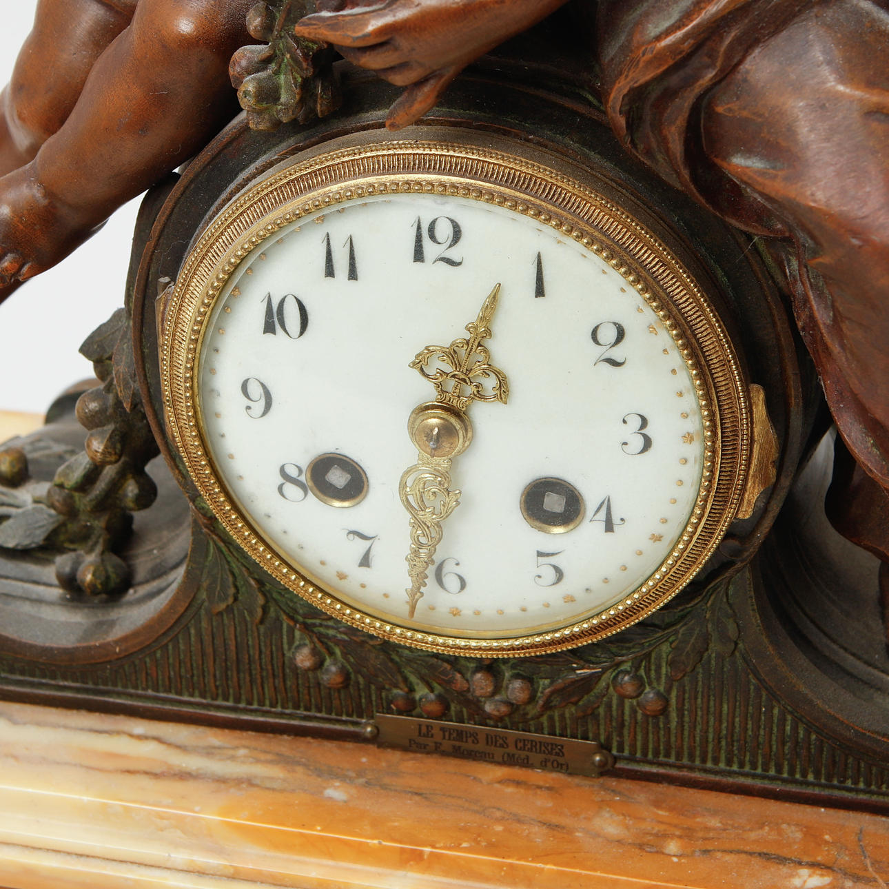 Patinated white metal on marble base. Badge marked “Le temps des cerises Par F. Moreau (Mèd d'or). Width approx. 34 cm, depth approx. 14 cm, height approx. 44 cm.