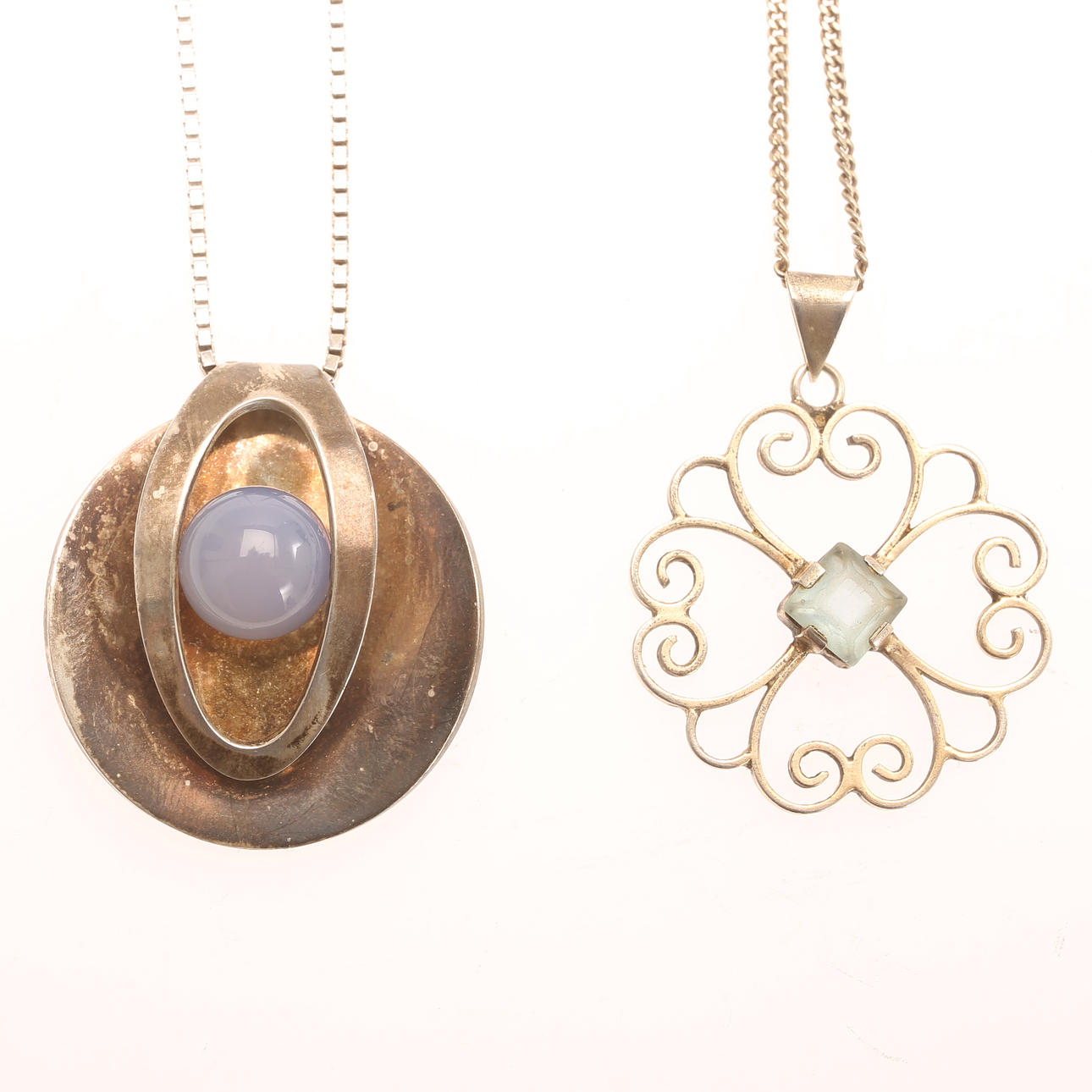 2 Pendants with chains, dimensions of pendants approx. 3,5 x 3 cm and diameter approx. 3 cm.