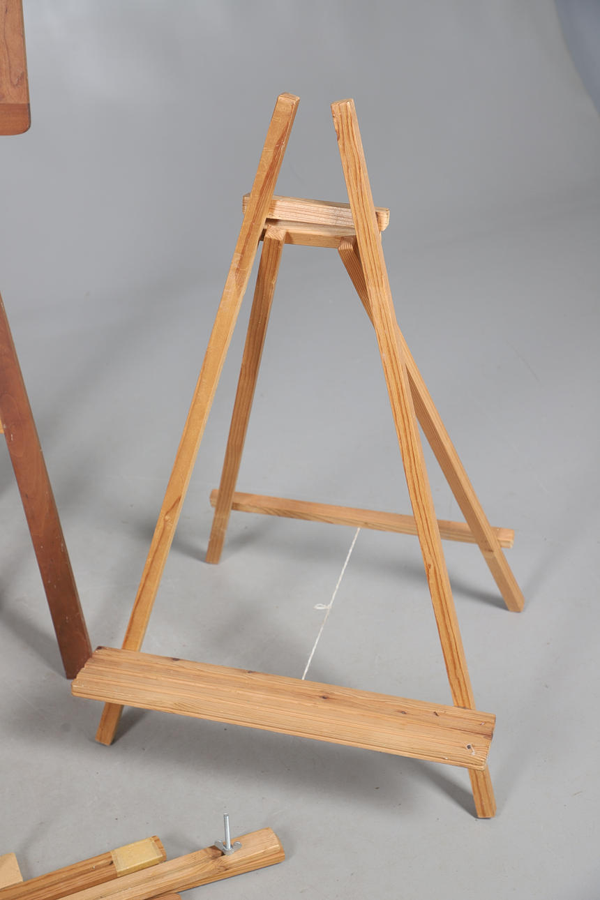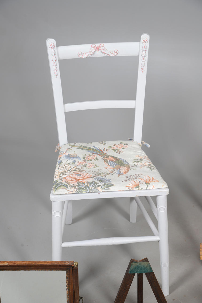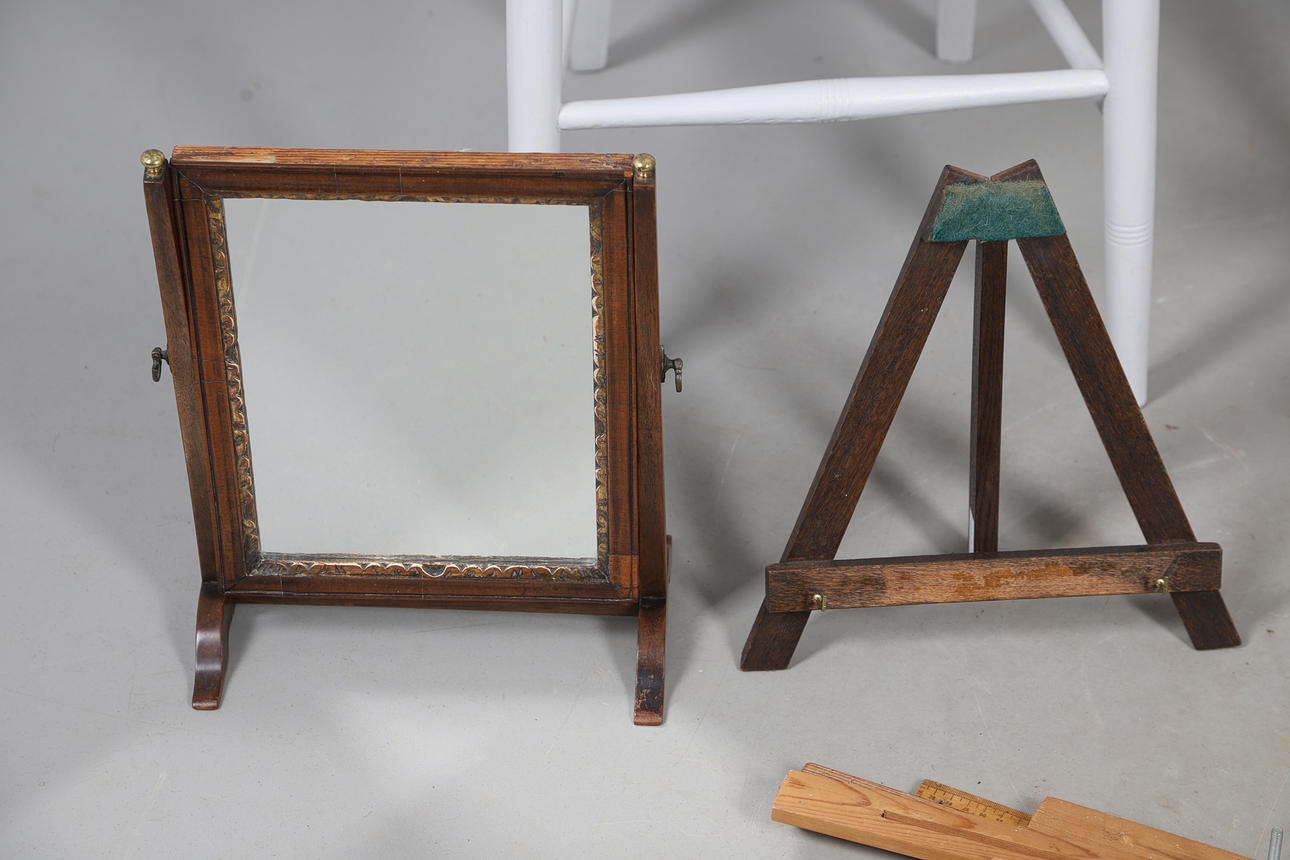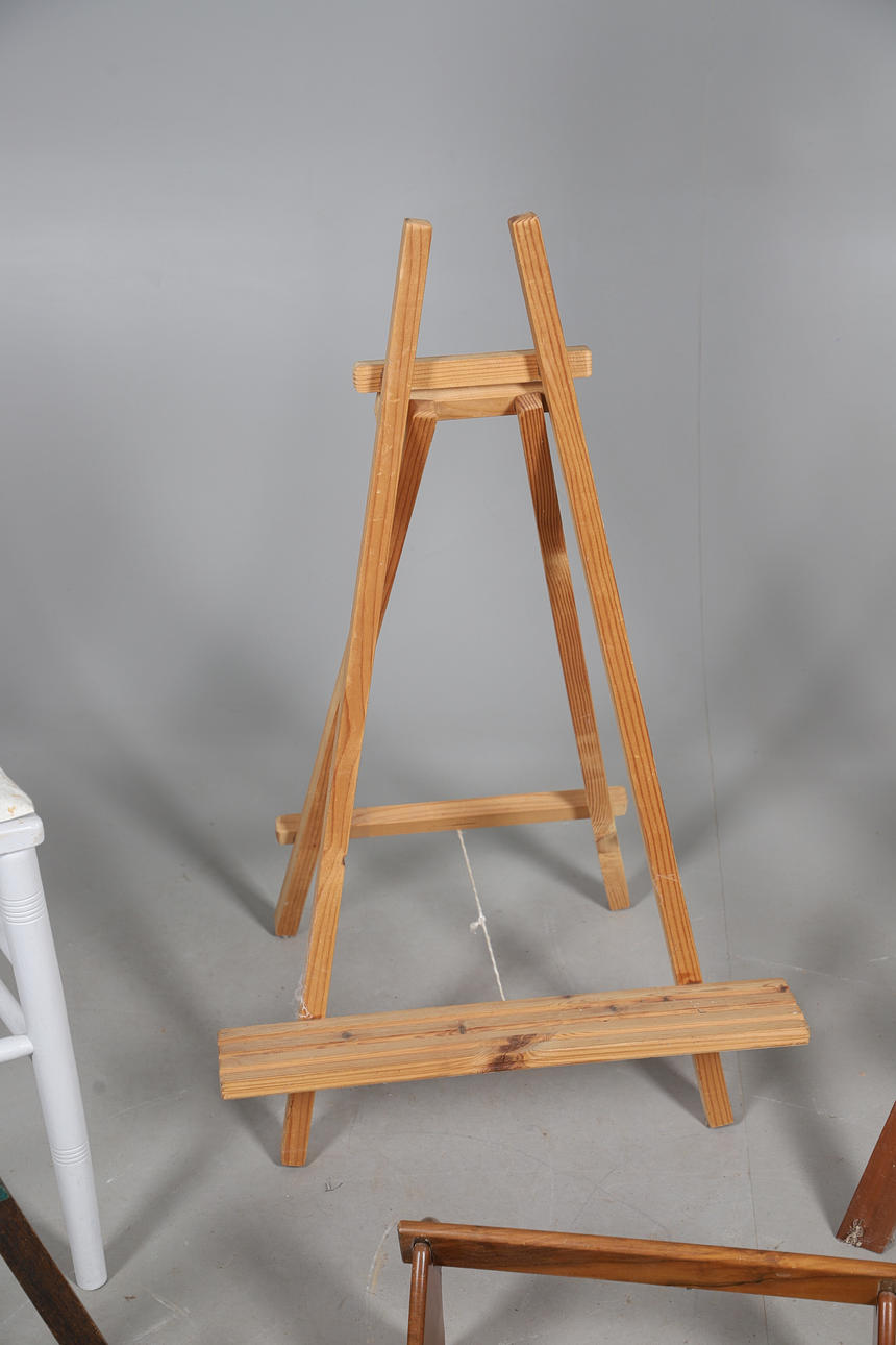 To include a George III swing frame mirror, 36cm (h) x 28cm (w) x 17cm (d). Together with an assortment of easels, and a painted hall chair. (QTY).