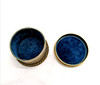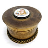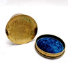 Antique ormolu circular brass box with cherub porcelain panel to lift off lid - 11cm diameter x 7cm high.