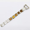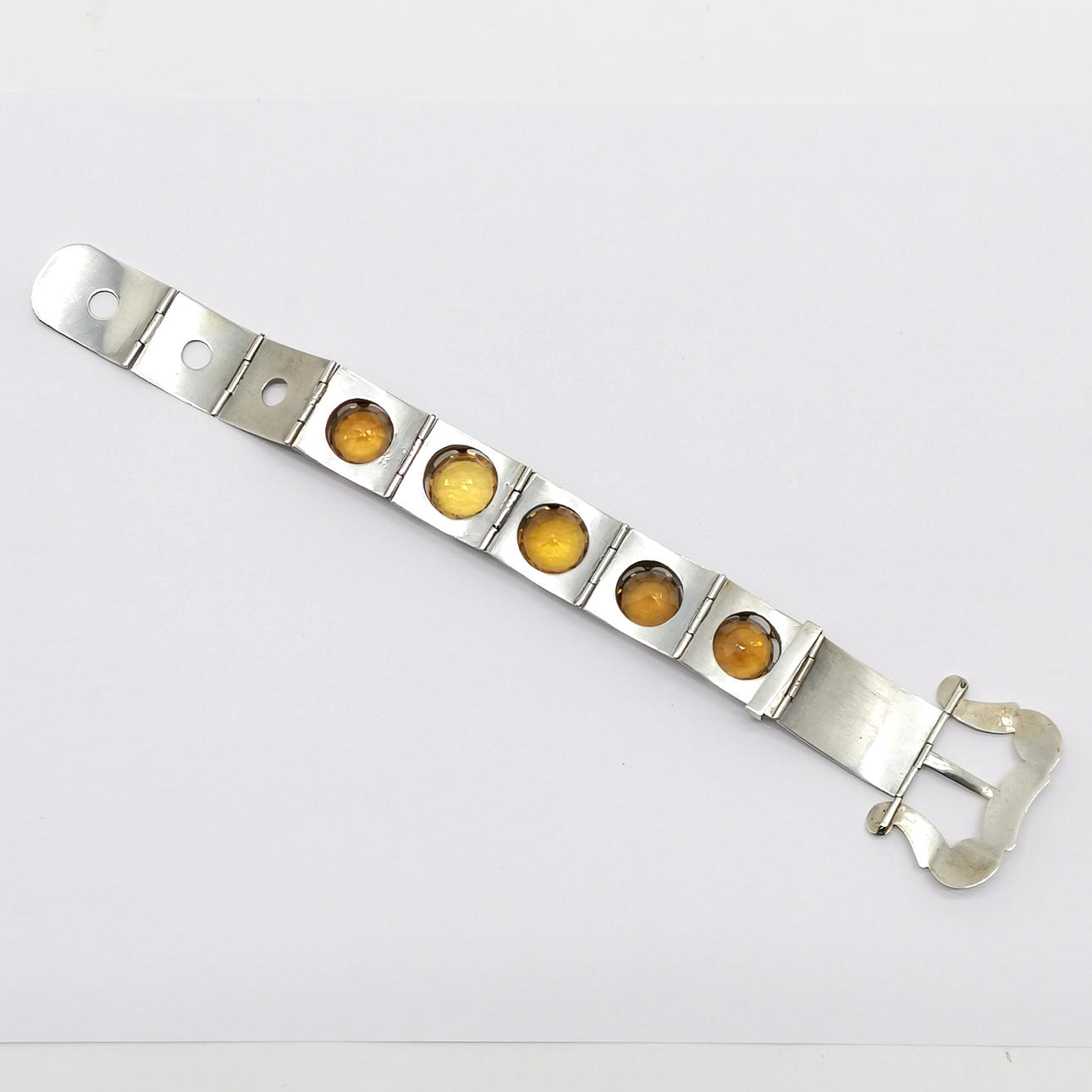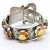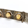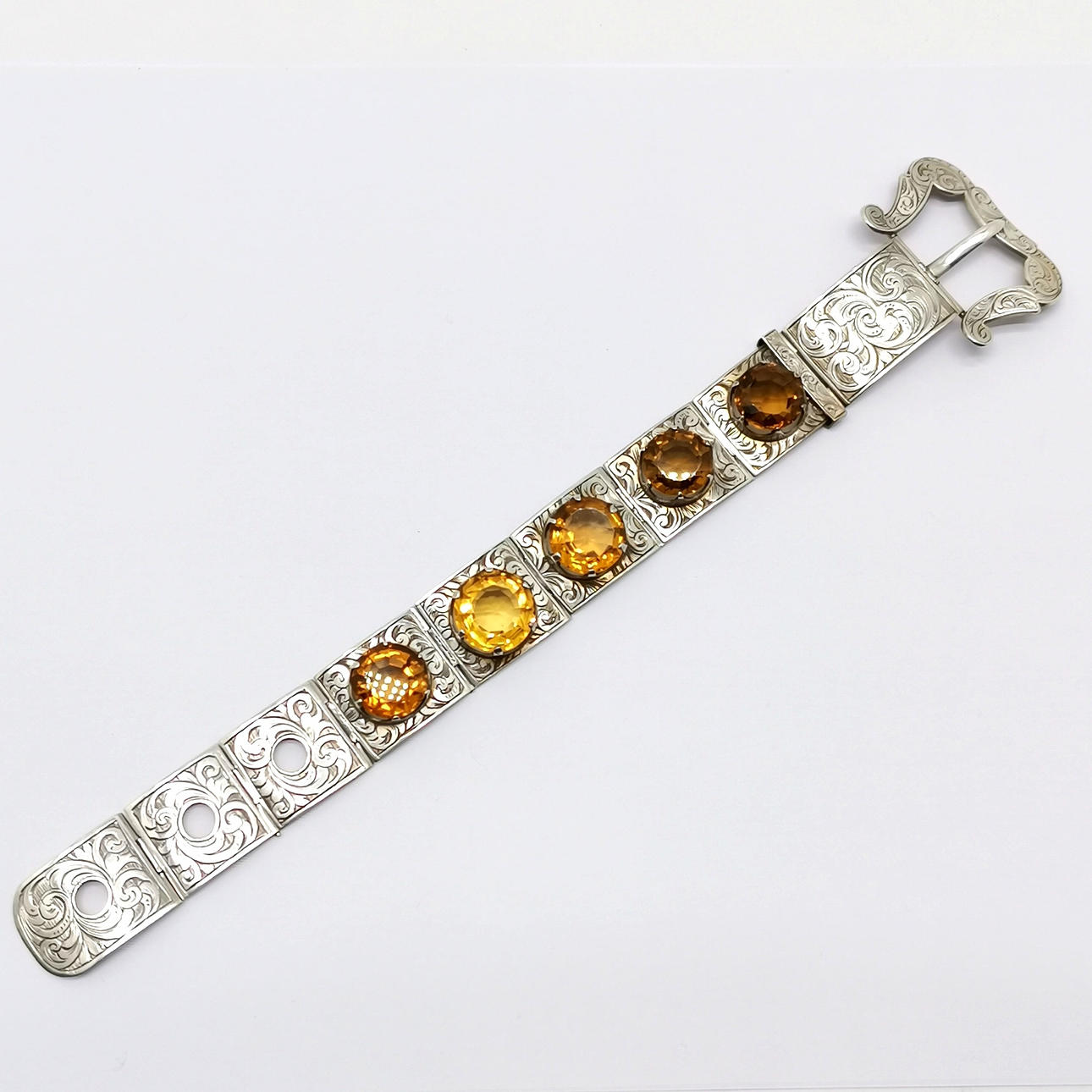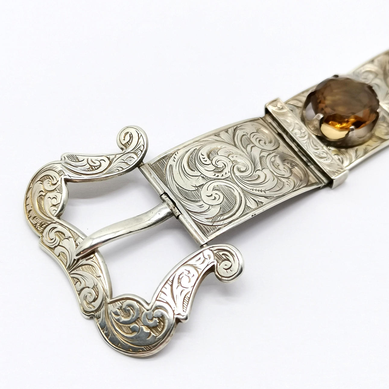 Antique unmarked silver belt design adjustable bracelet set with 5 citrine stones and profuse engraved detail - 25cm total length x 2.1cm wide & 50g total weight.