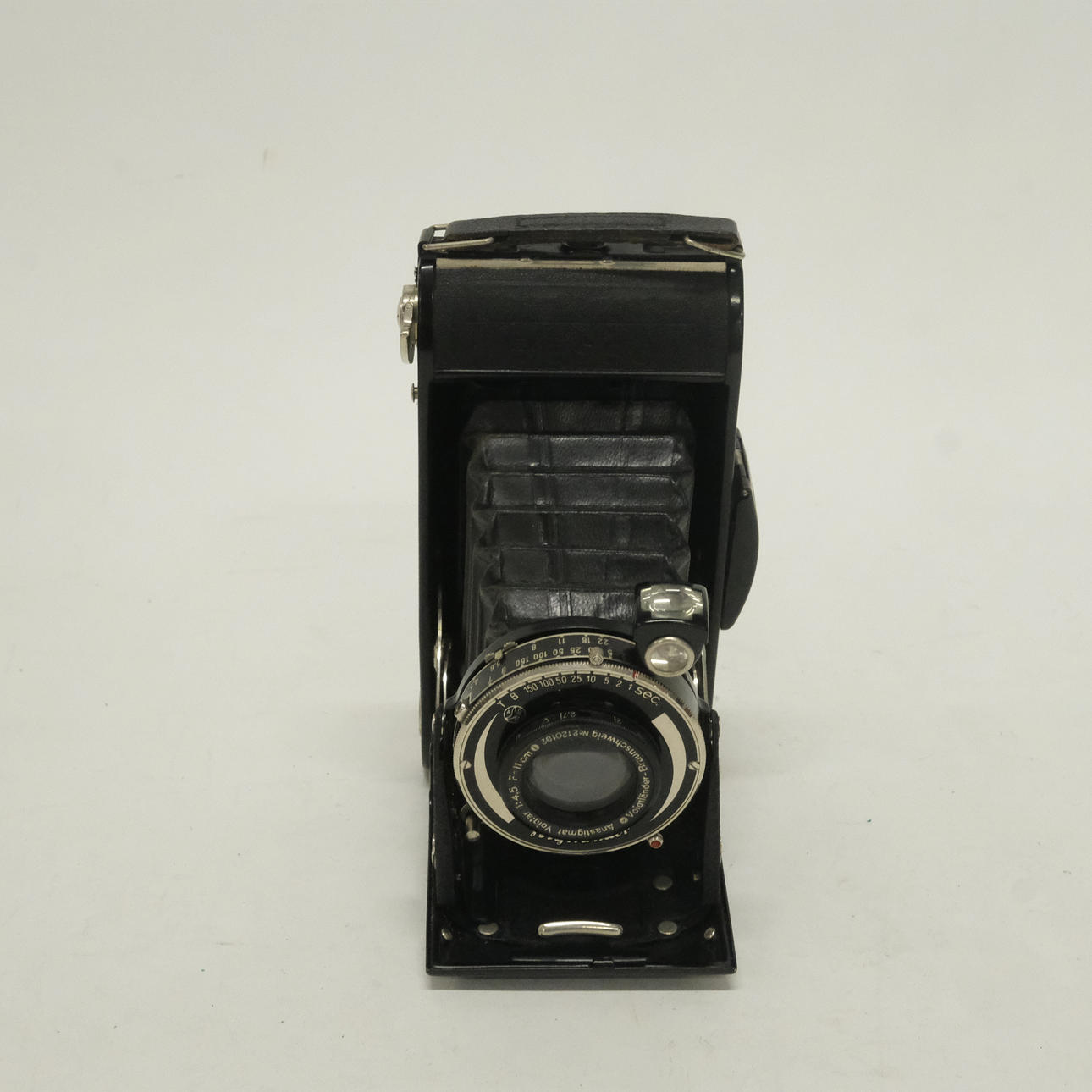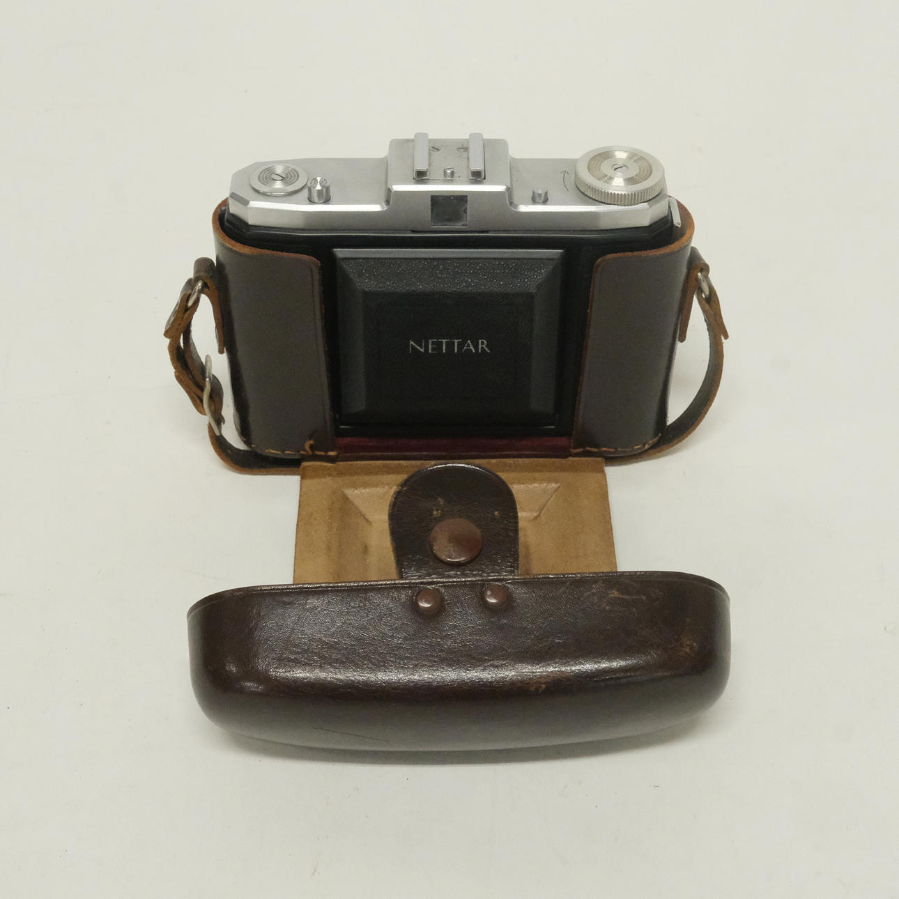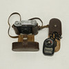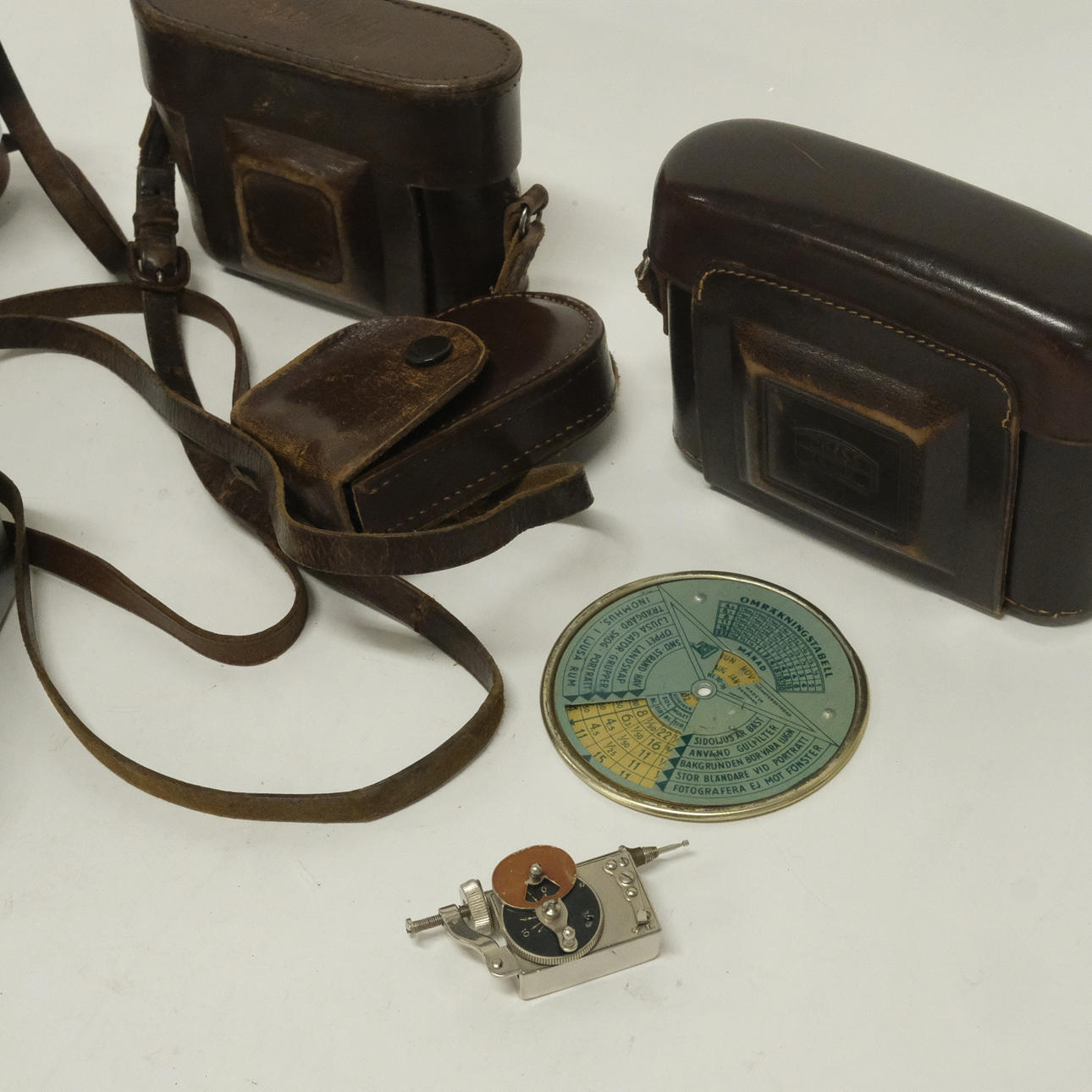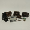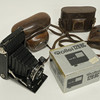 Two Zeiss Ikon cameras, Kodak Retina camera, bellows camera, Rollei flash and accessories.