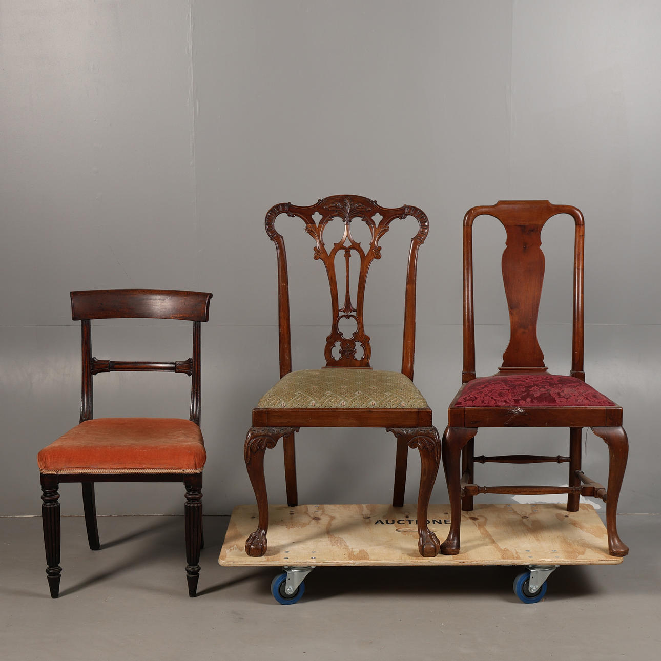 To include a George II style chair stamped to the inner support ED VII with royal cipher, the second chair a Chippendale style mahogany single chair with fret vase back above a drop in seat and carved cabriolet legs crumble feet.