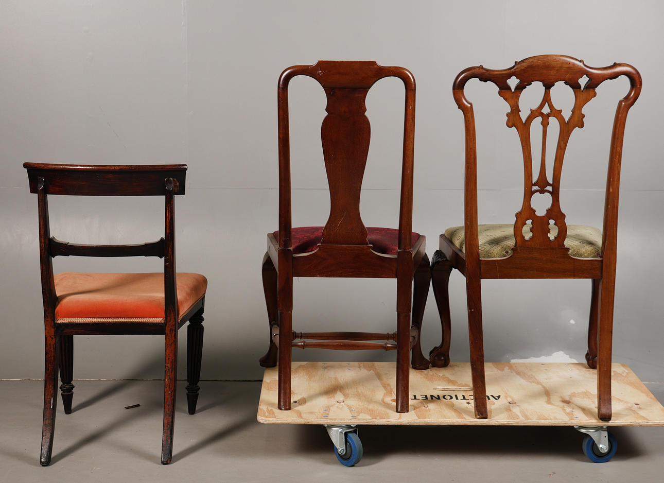 The Chippendale style chair and the William IV chair needed some frame restoration as the joints are loose. The single chair with the royal cipher is in good condition, faded wood and all with minor marks and knocks.
