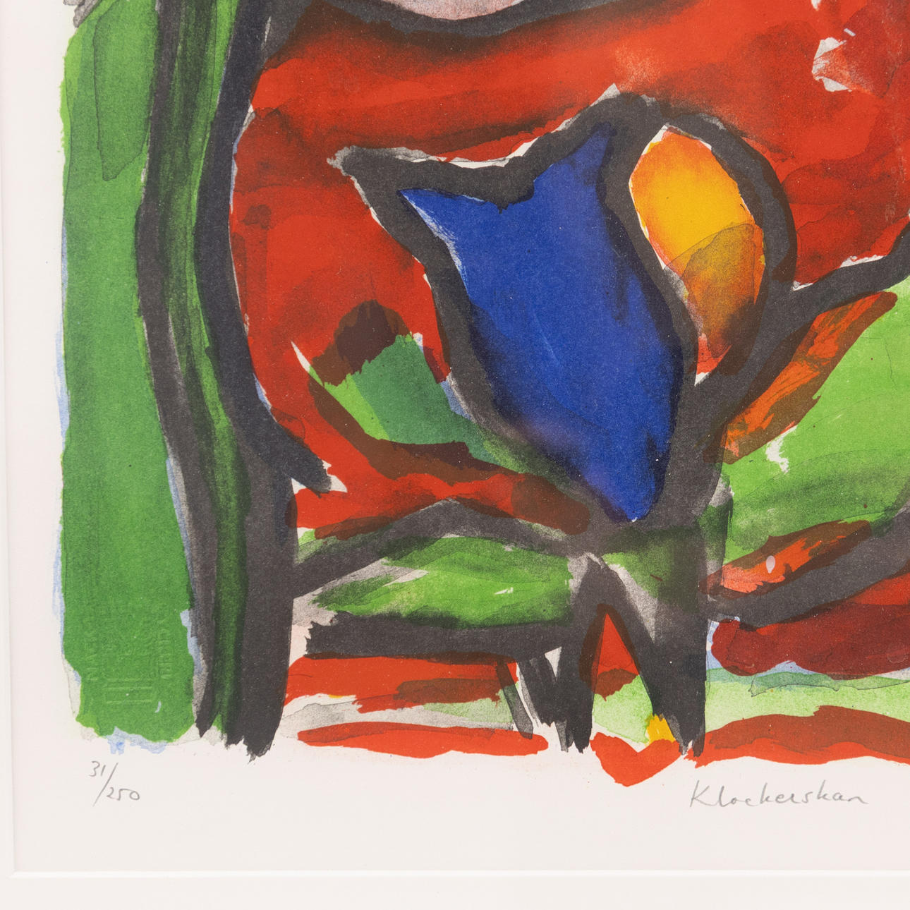 Lithograph in colours, “Klockerskan”, signed, numbered 31/250, dimensions with frame 63 x 76 cm.