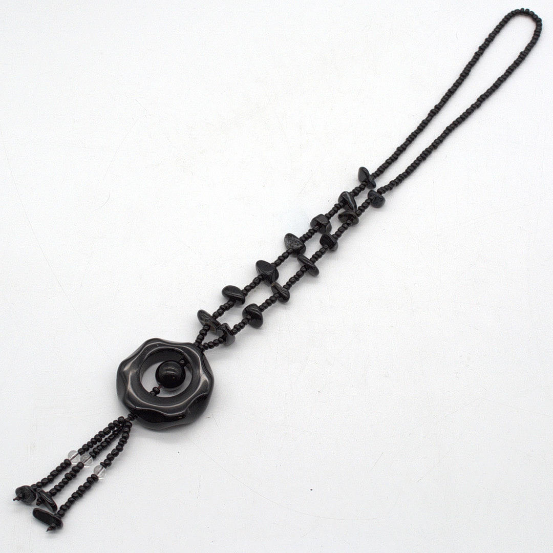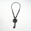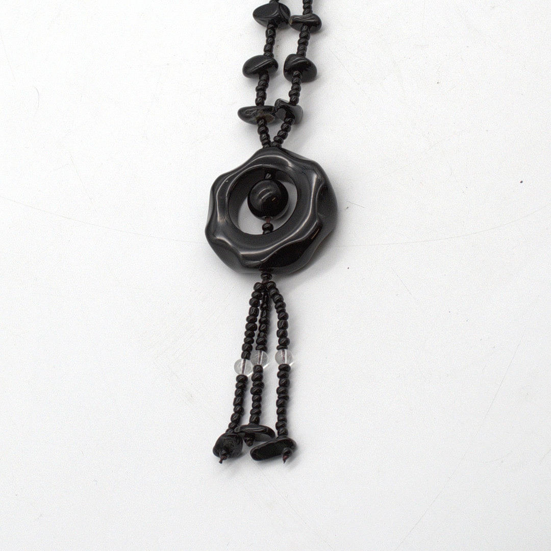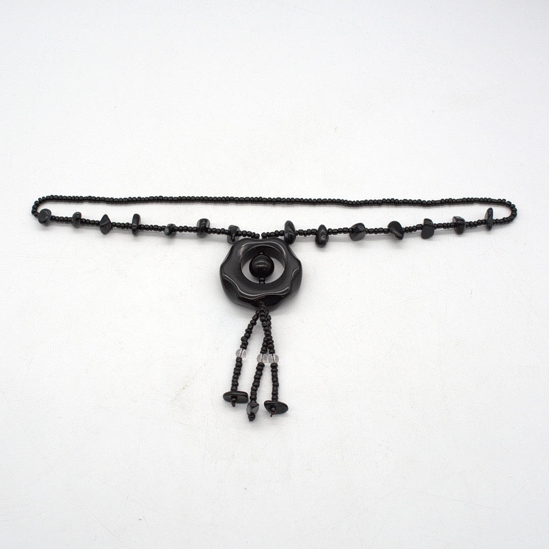 Black jade necklace. Seven black jade stones are incorporated on both sides. Which run towards a large round jade piece (black).