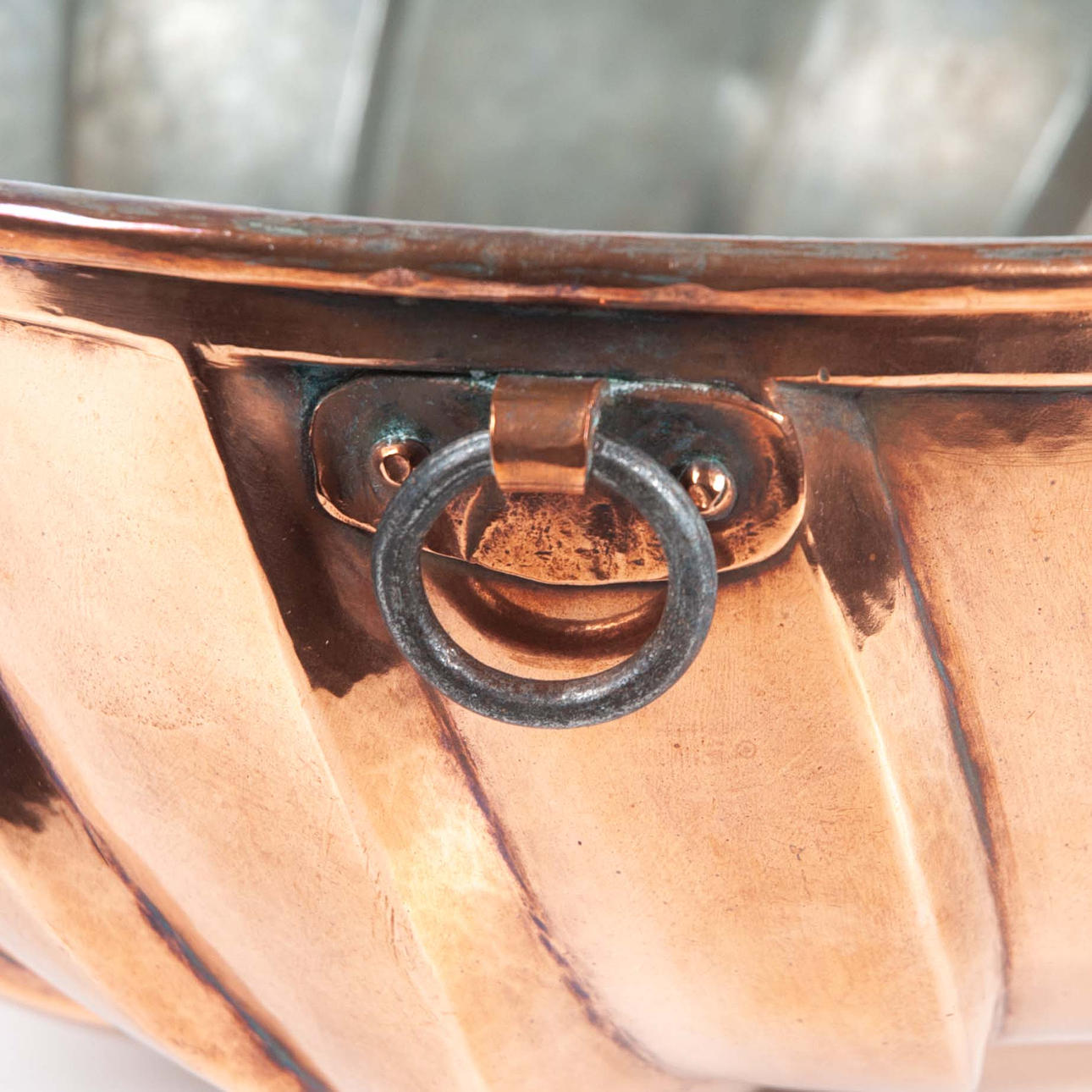 Large copper gazebo shape, Sweden late 19th century, hand knocked (not pressed by machine), suspension with rolled original rivets, iron ring, old inner tinning, thick heavy copper, dimensions 32 x 29 cm, height 14 cm, beautiful smooth patina, comes from the border regions of Norra Skåne/Småland.