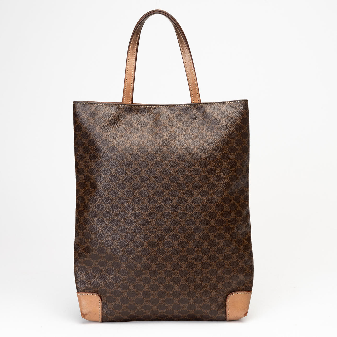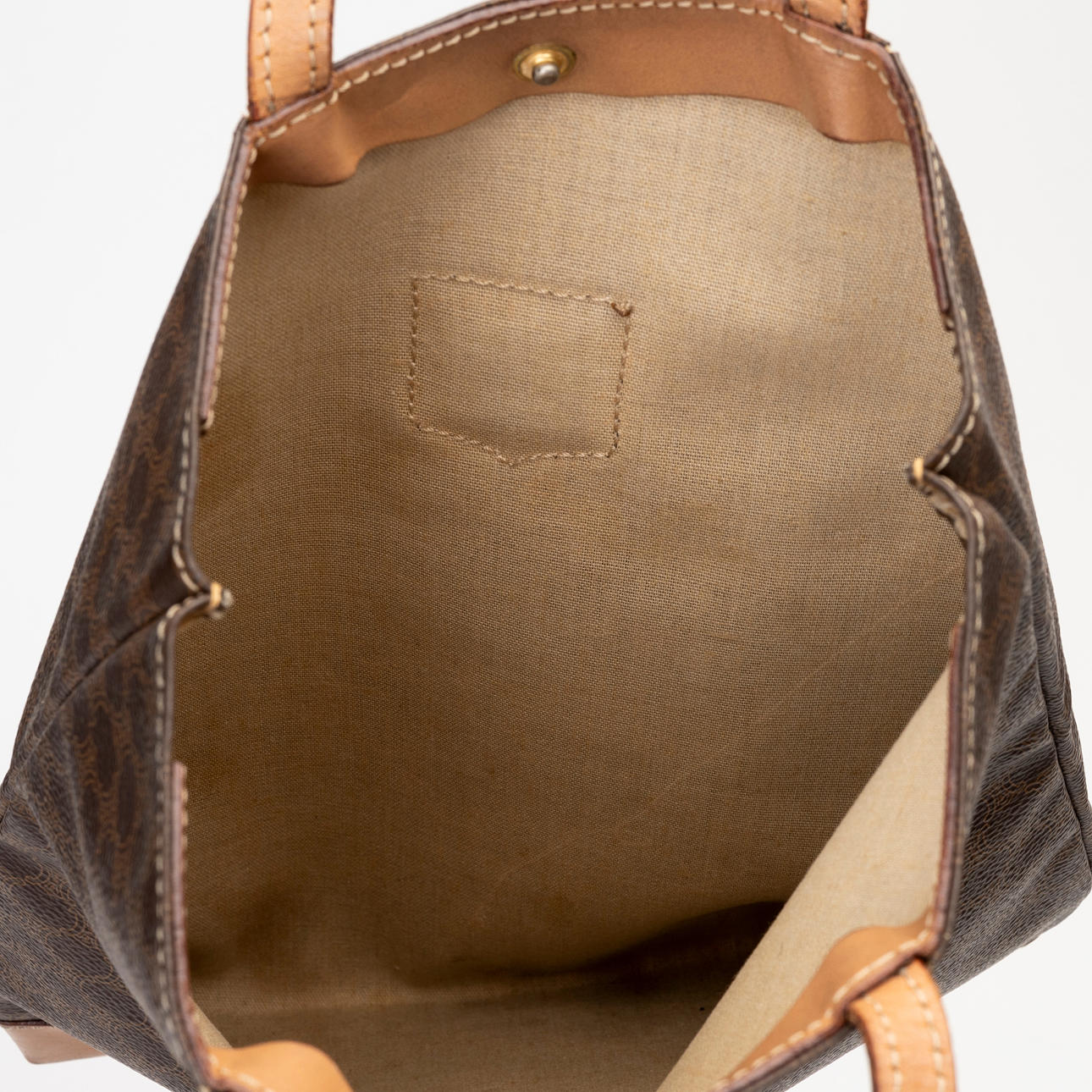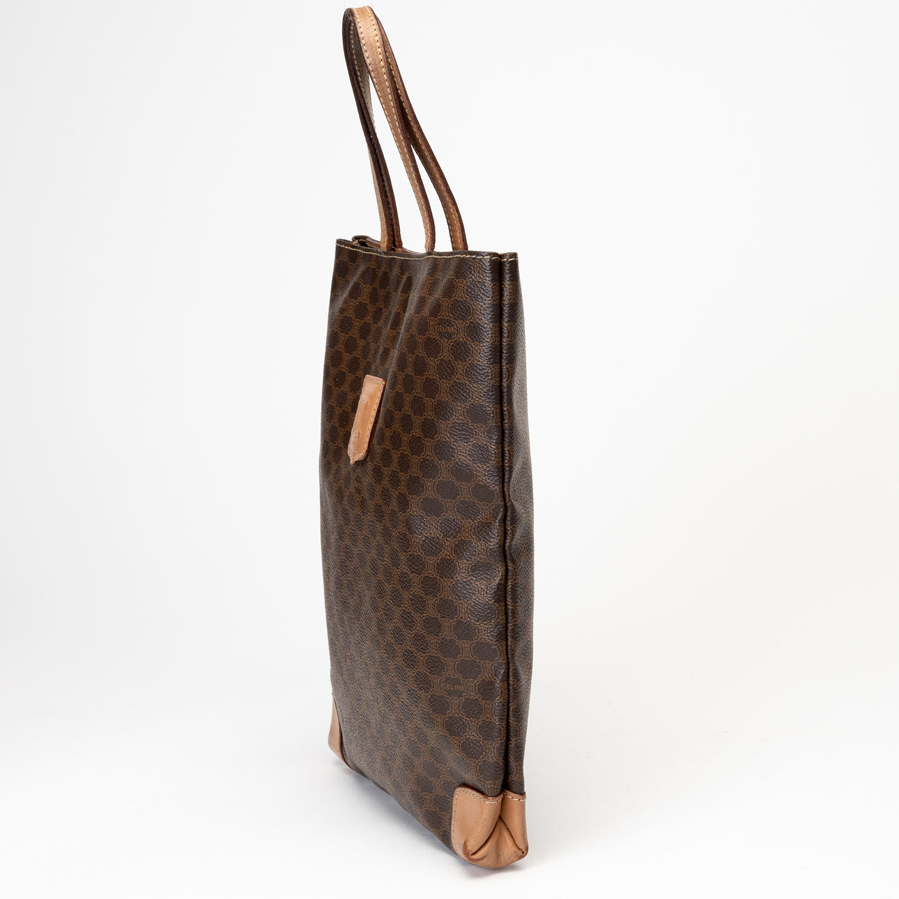 Classic brown Celine pattern with brown leather details. Tagged “CELINE PARIS MADE IN ITALY M13"