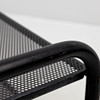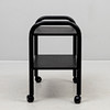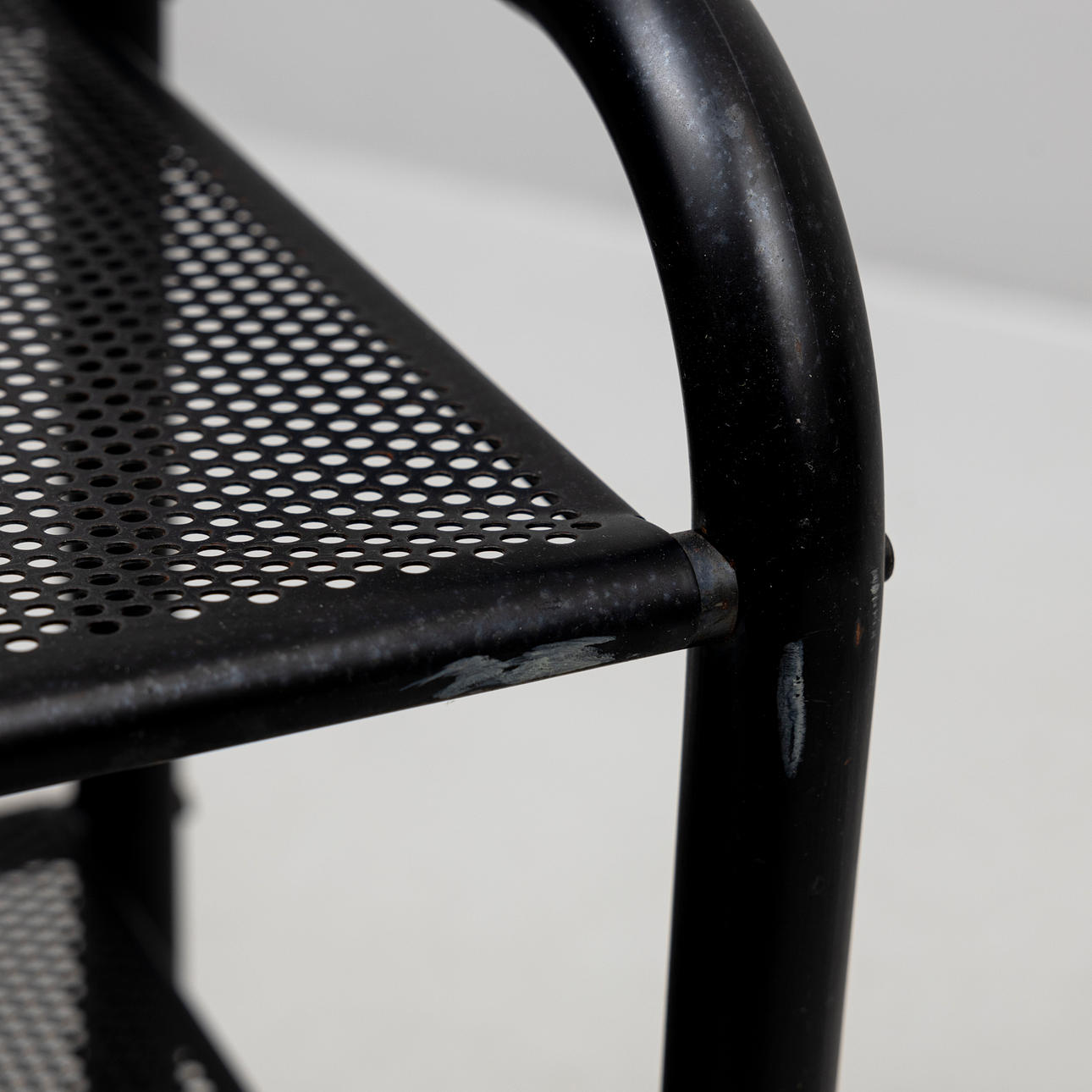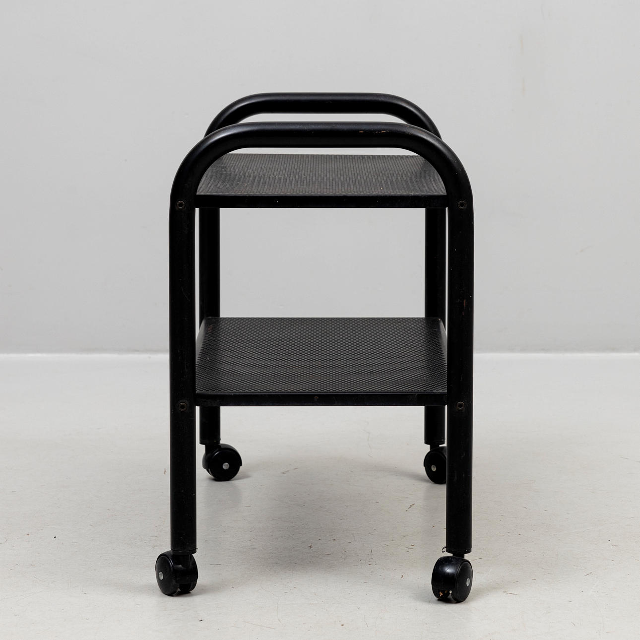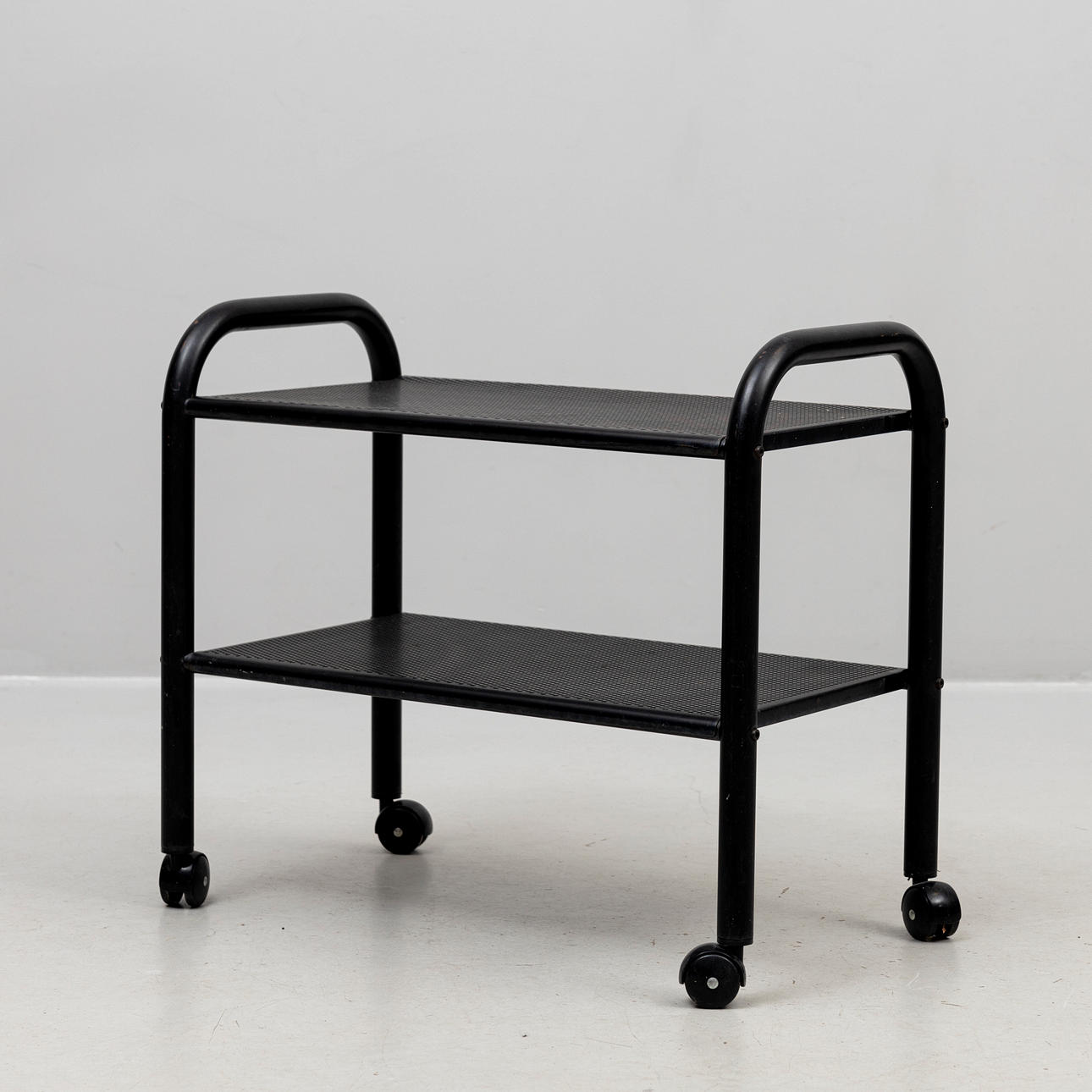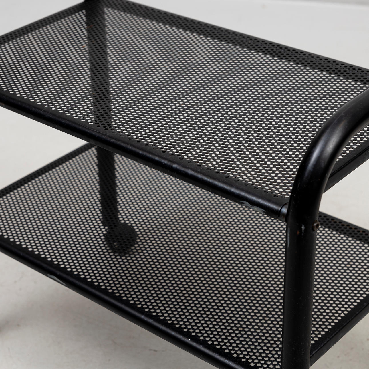 Black lacquered metal, perforated shelves, on wheels. Length ca 66, width 37, height 59 cm.
