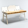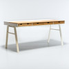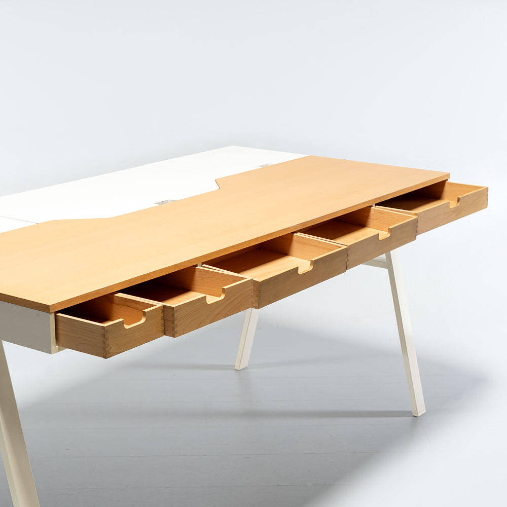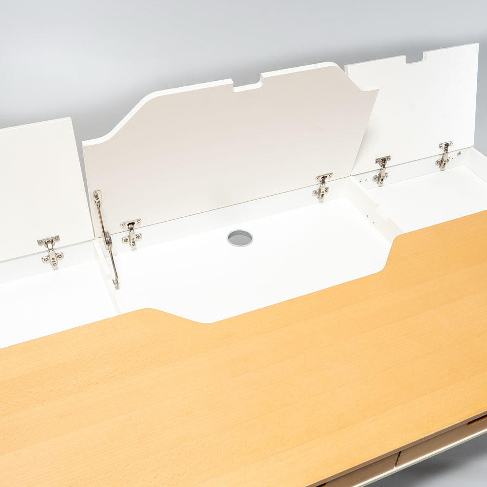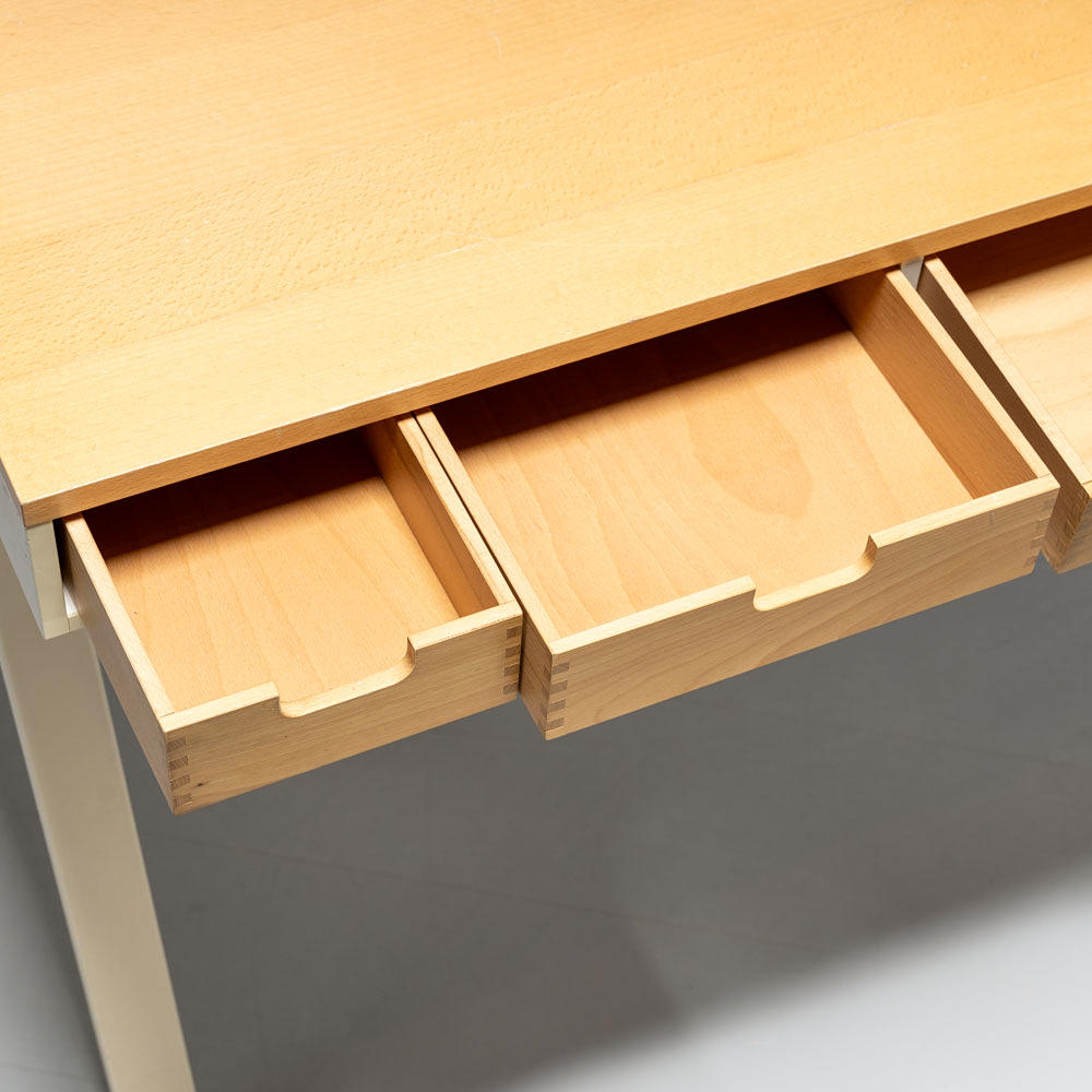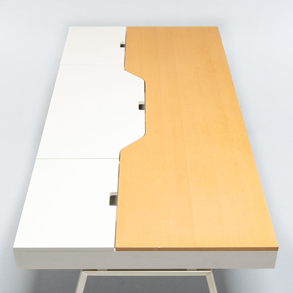Leg frame in white-lacquered metal. Top white-lacquered and veneered with beech. Hinged flaps in the top and drawers in the apron. Labelled. Manufactured in Germany.