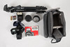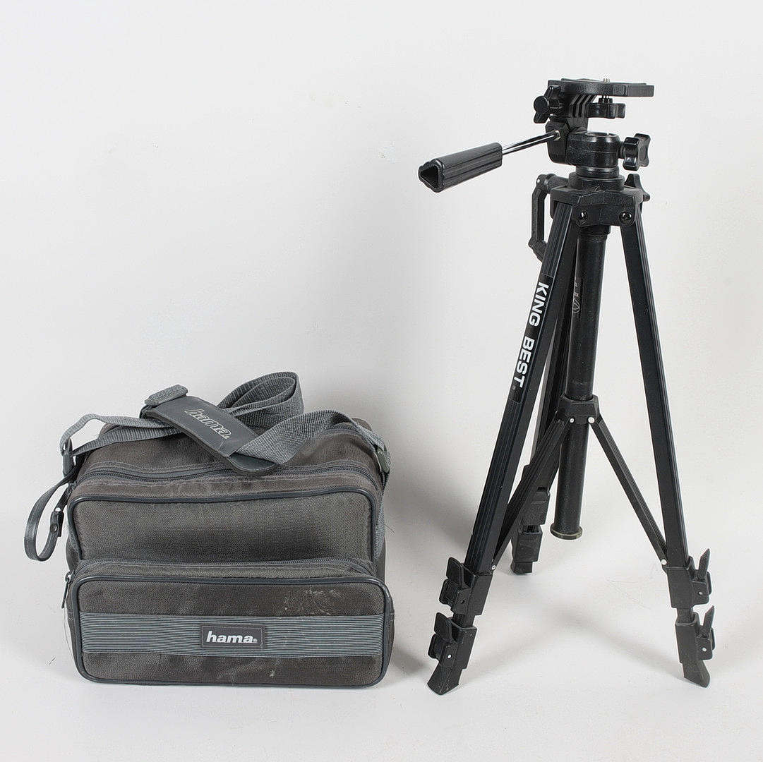 Camera Bag, Hama. Lens hood, instruction manual, battery, small brush in protective case marked Titania, external flash marked Nissin. Tripod stand marked King Best.