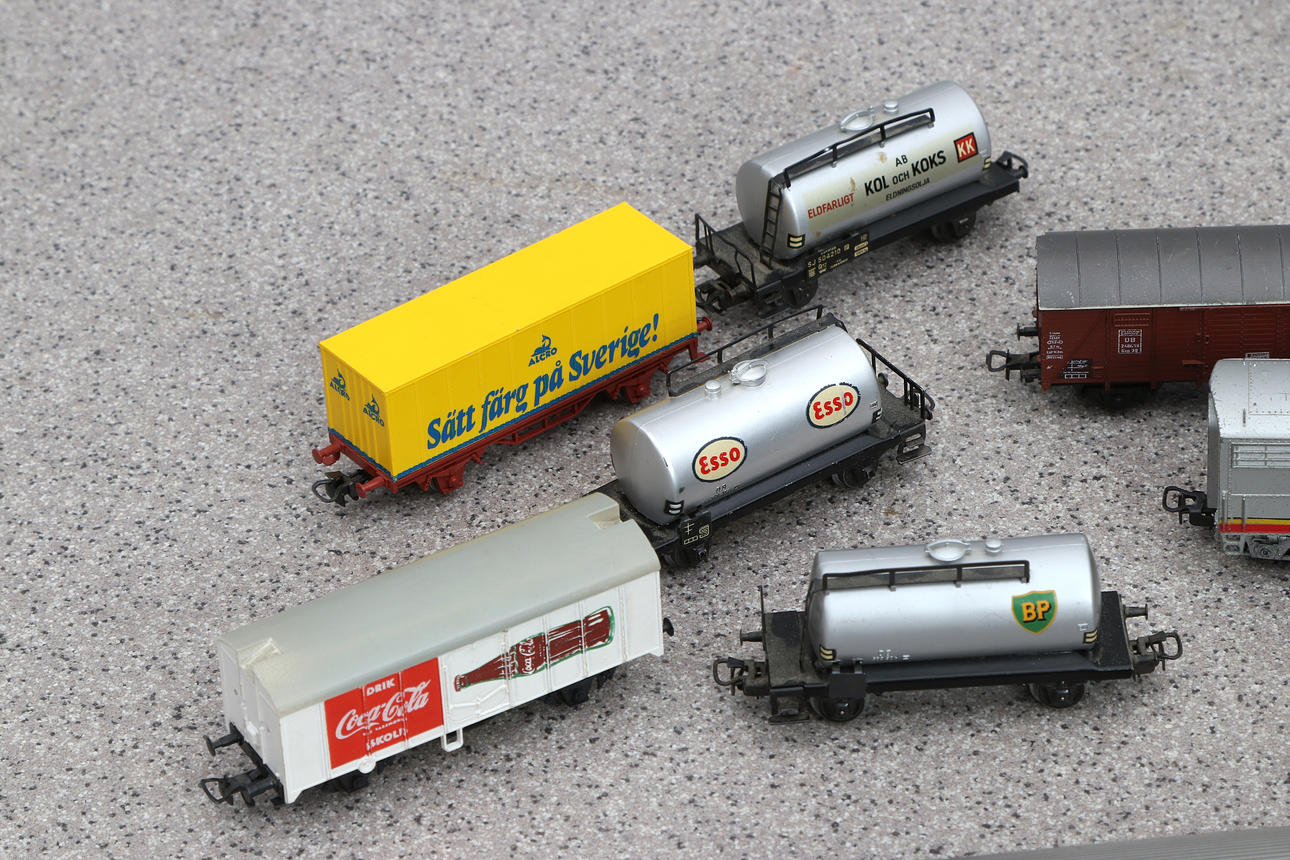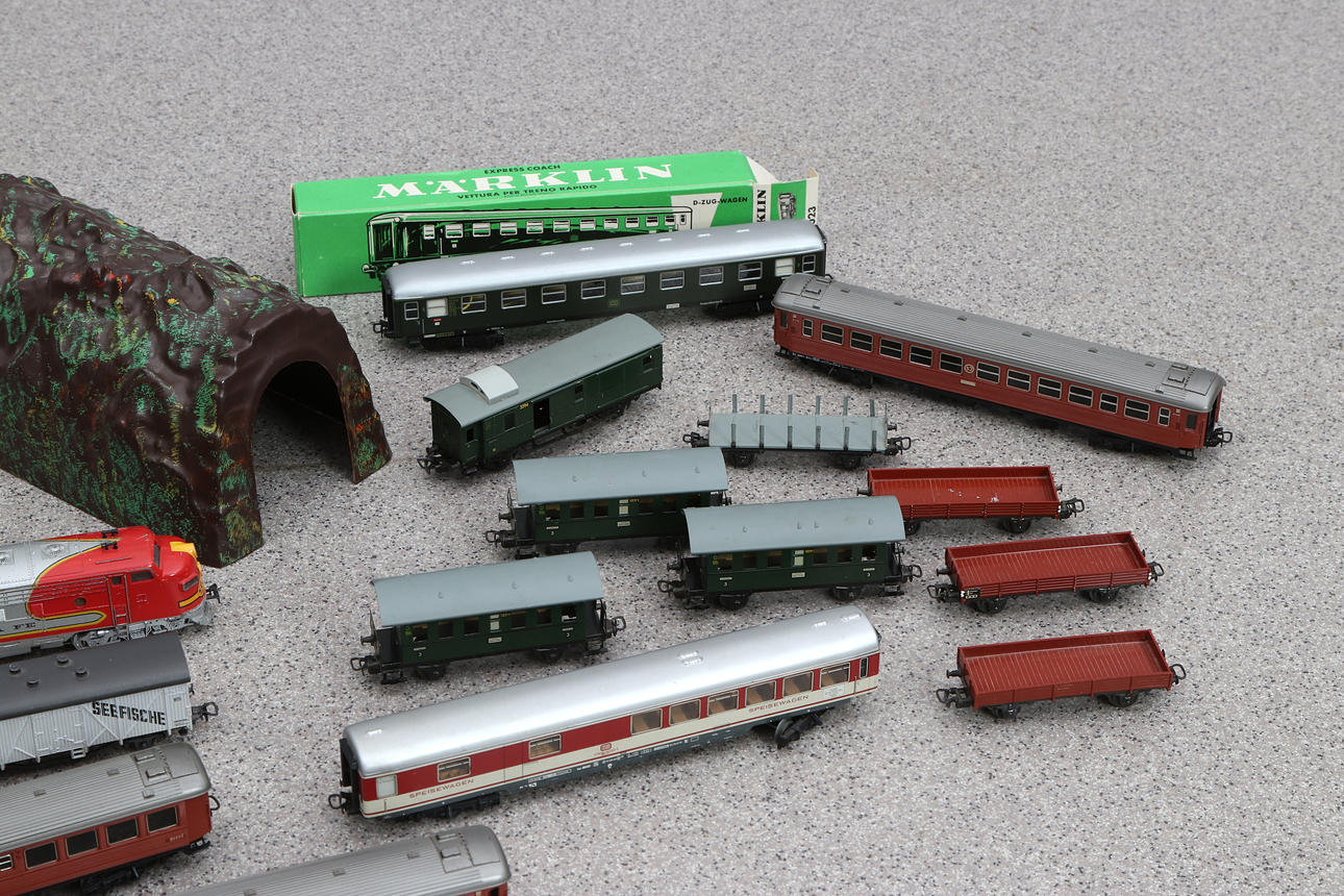 1 locomotive, 14 short carriages, 5 longer carriages and tunnel. 3 carts not marked.