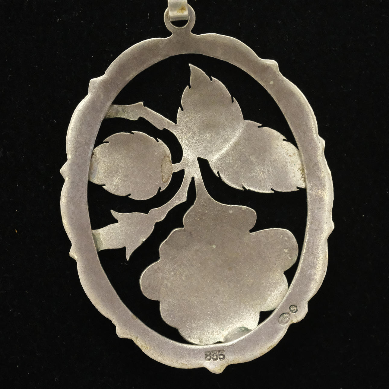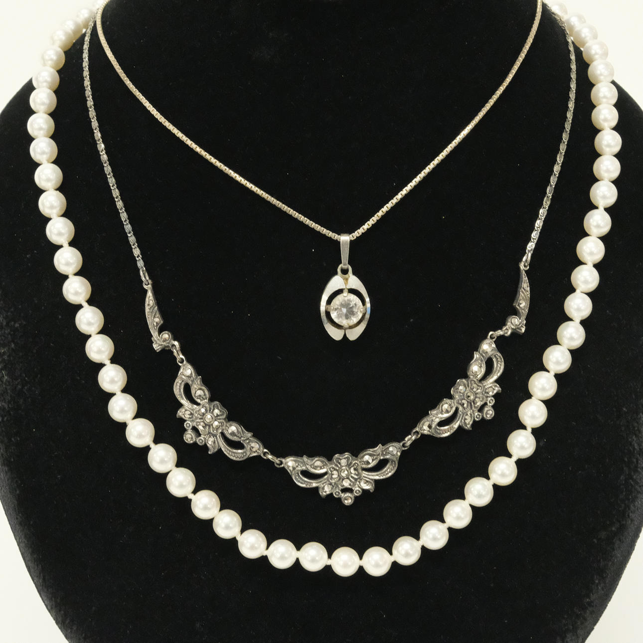 Pendant with camé, length 3,5 cm, ring with stones, size 19 mm, brooch, length5,5 cm, necklace with marcasites, length 42 cm, pendant with stone and chain, length pendant 2,2 cm, length chain 40 cm, pendant with chain, length pendant 5 cm, length chain 68 cm, pearl necklace with silver clasp, length 48 cm.