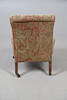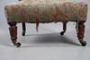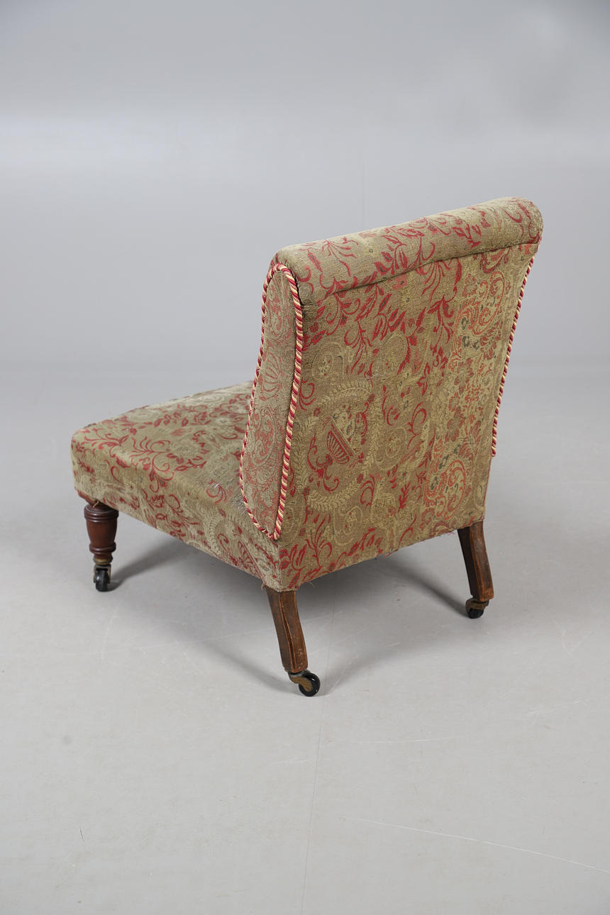 A Victorian upholstered low seat chair, raised on turned front supports and casters. 74cm (h) x 56cm (w) x 30cm (seat height).