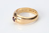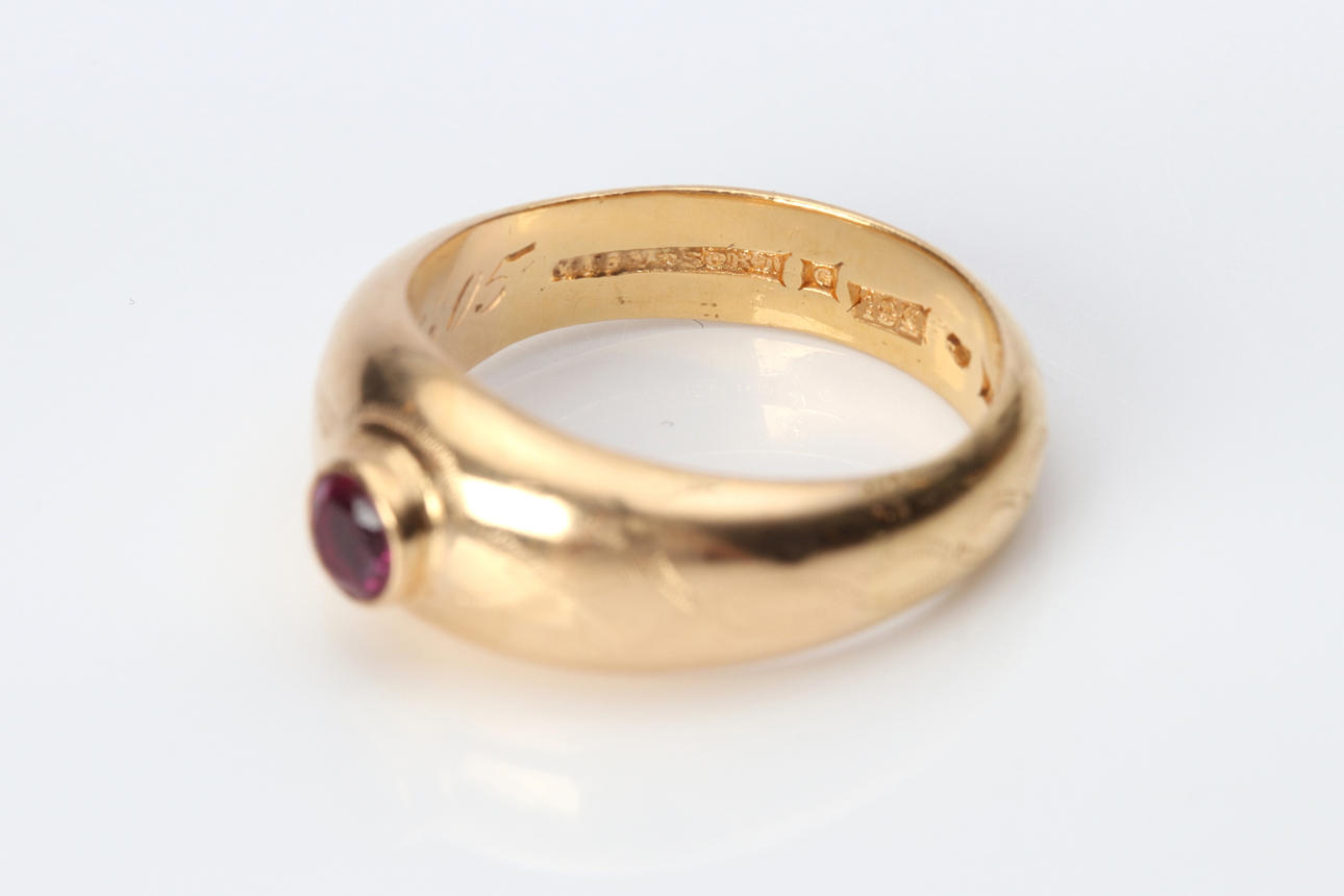 The ruby with chips. The ring with engraving and wear.