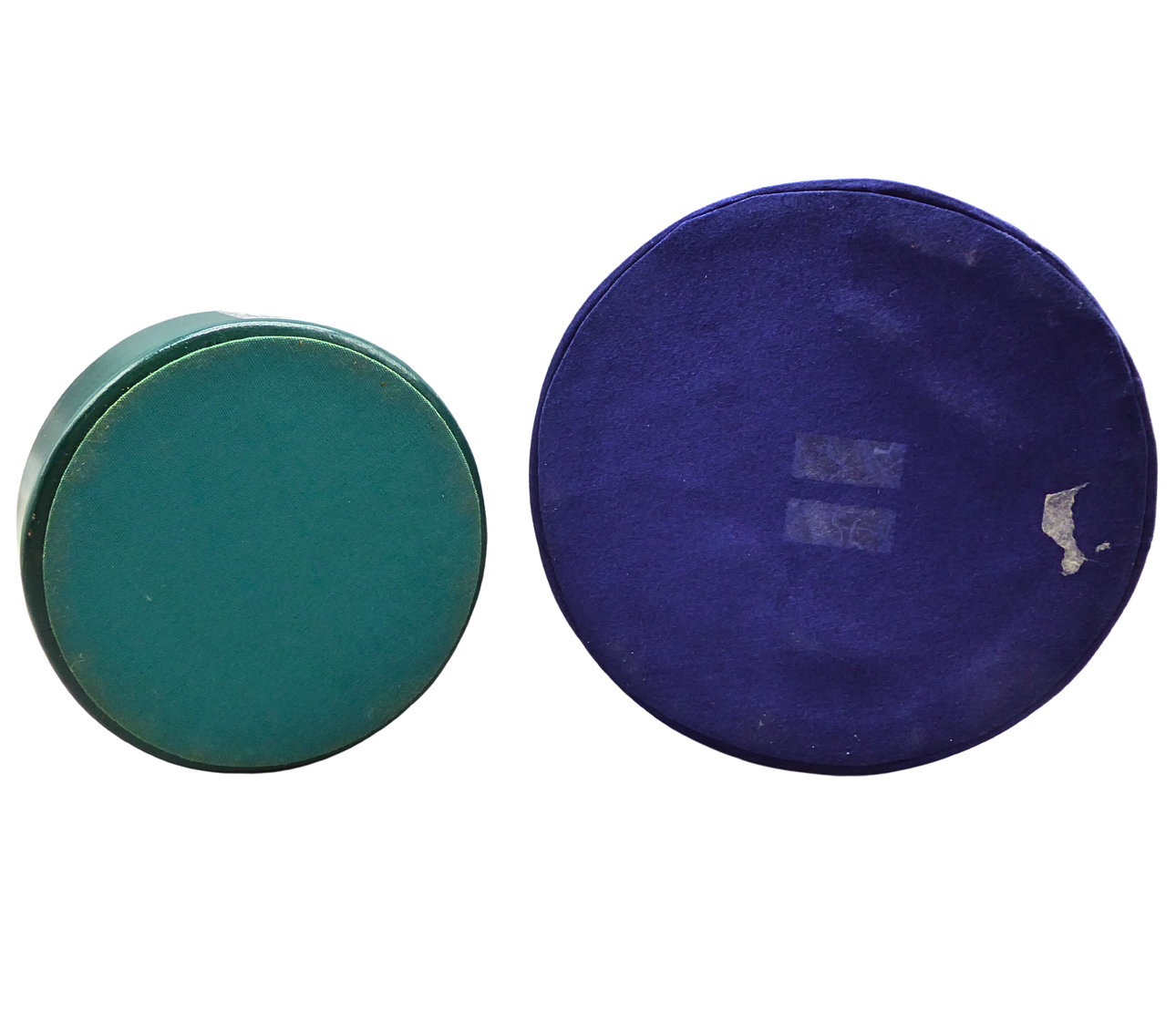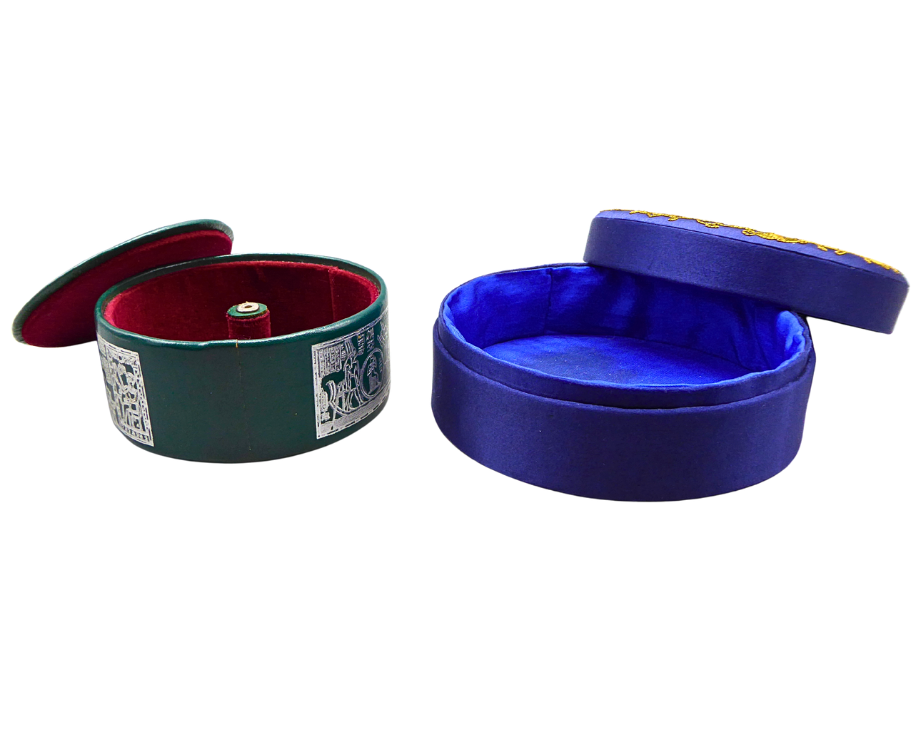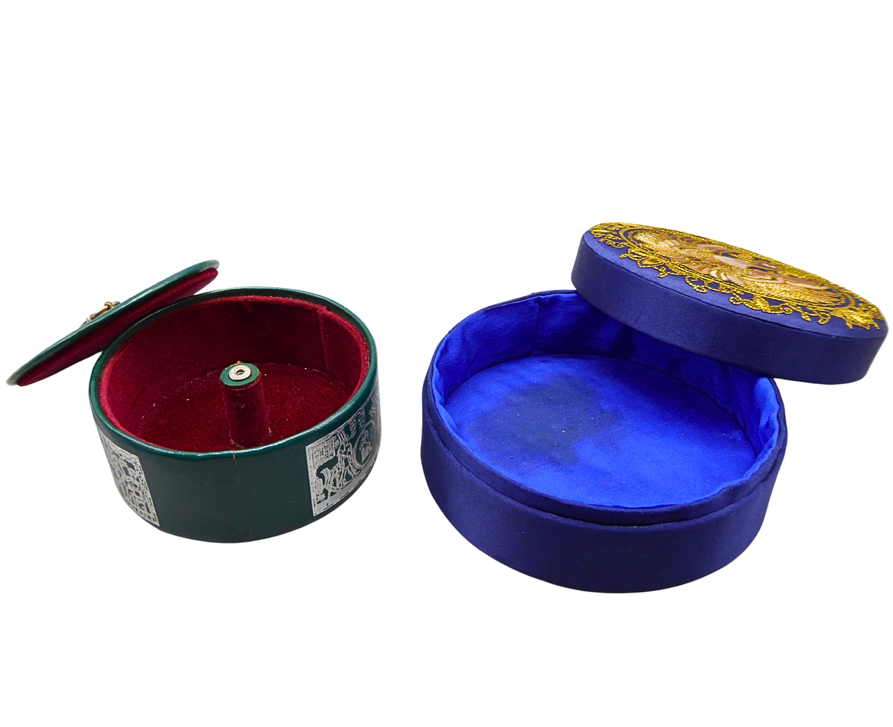 The set includes a dark green box with silver relief decorations on the outside and a blue box with gold embroidery on the lid.