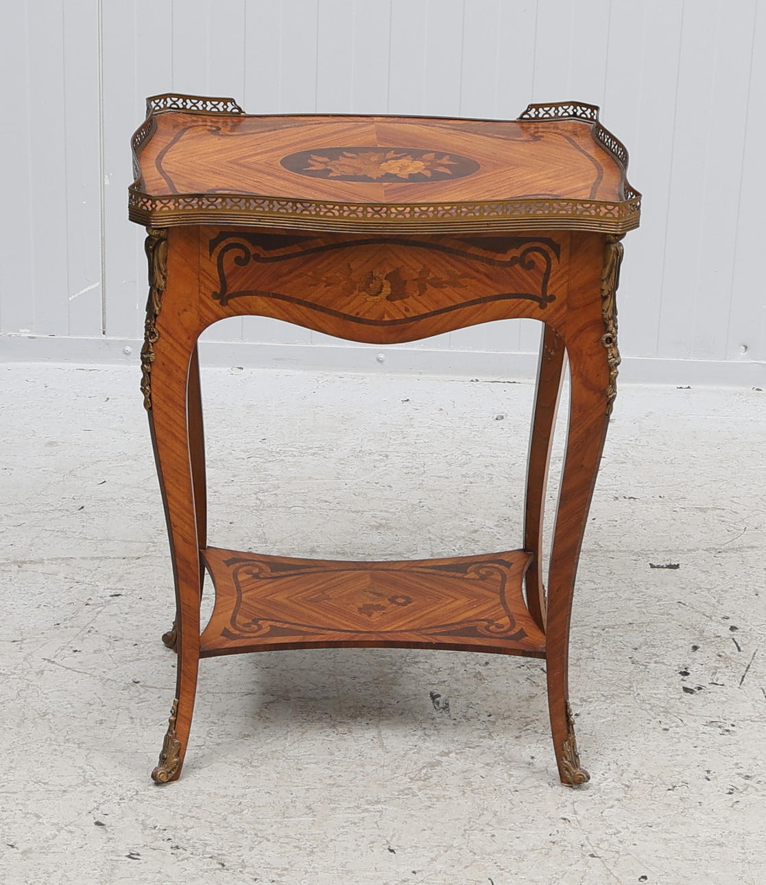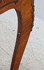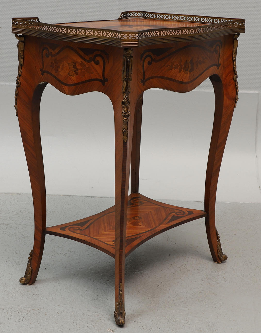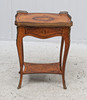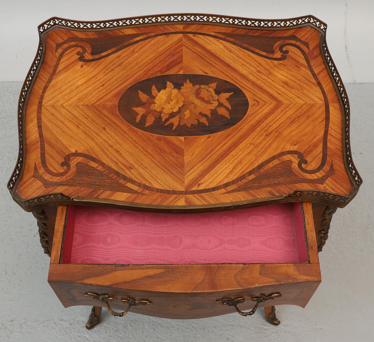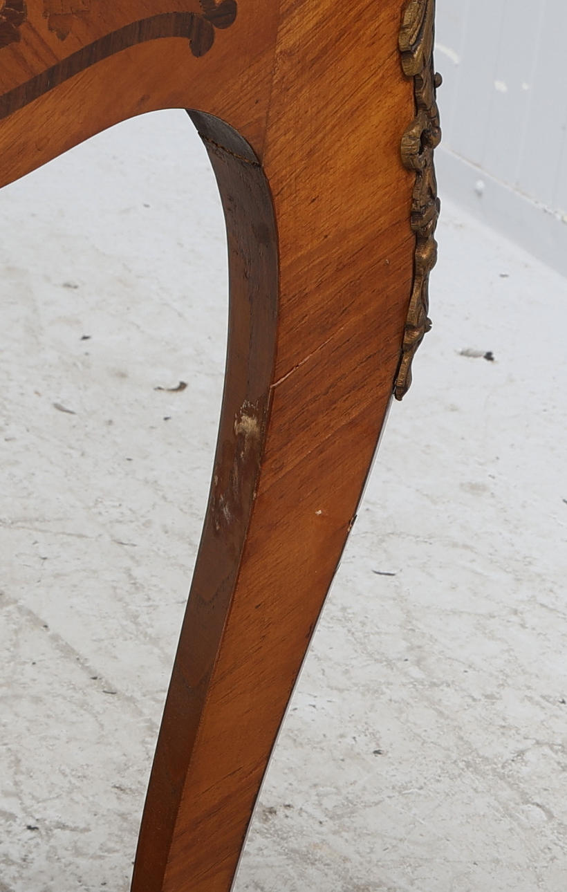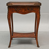 Small table with attached leg stand and pull-out drawer in sarg, intarsia decor, fittings and openwork sarg in yellow metal.