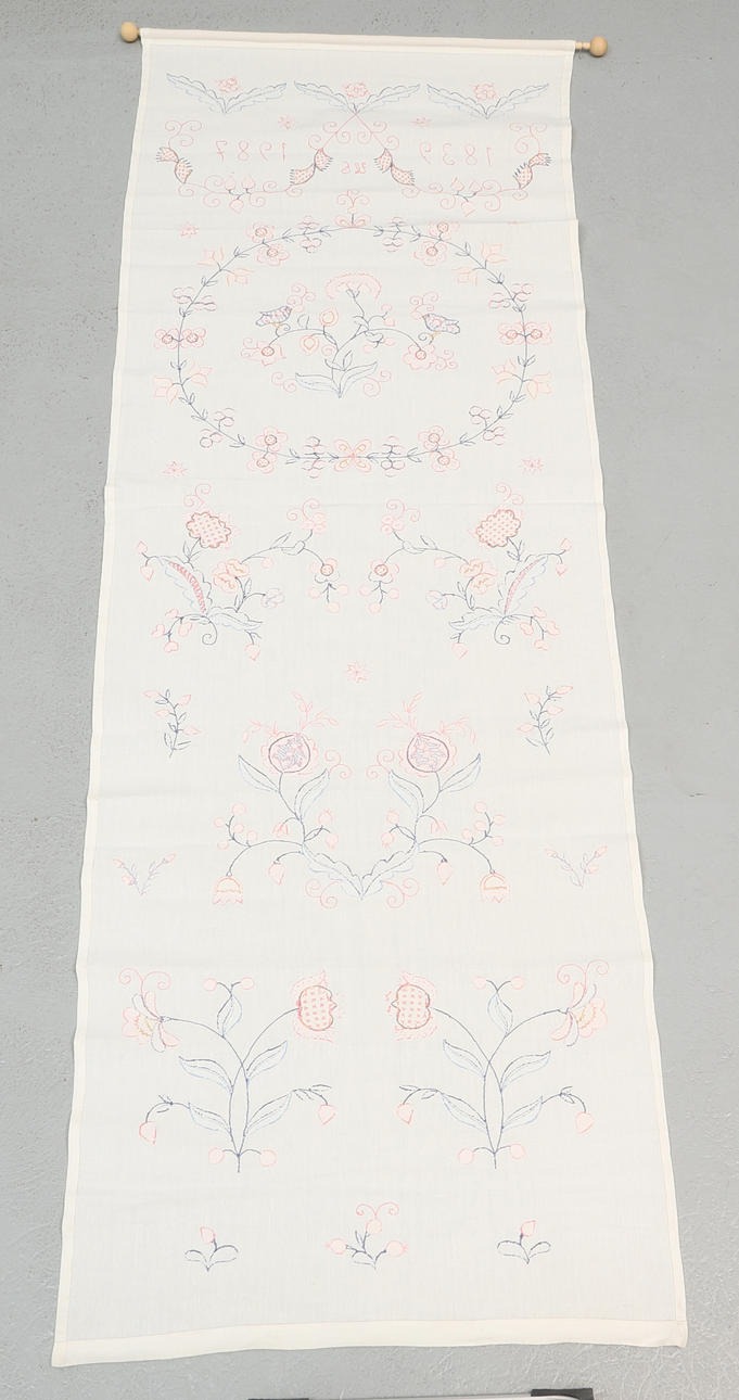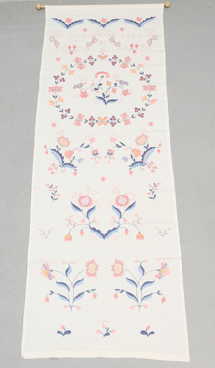 A textile hanger, Blekingesüm, signed, dated 1839 - 1987.