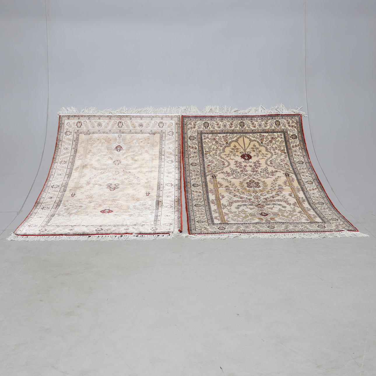 Carpets with light base color and figural motif in the form of birds and flowers, among other things.