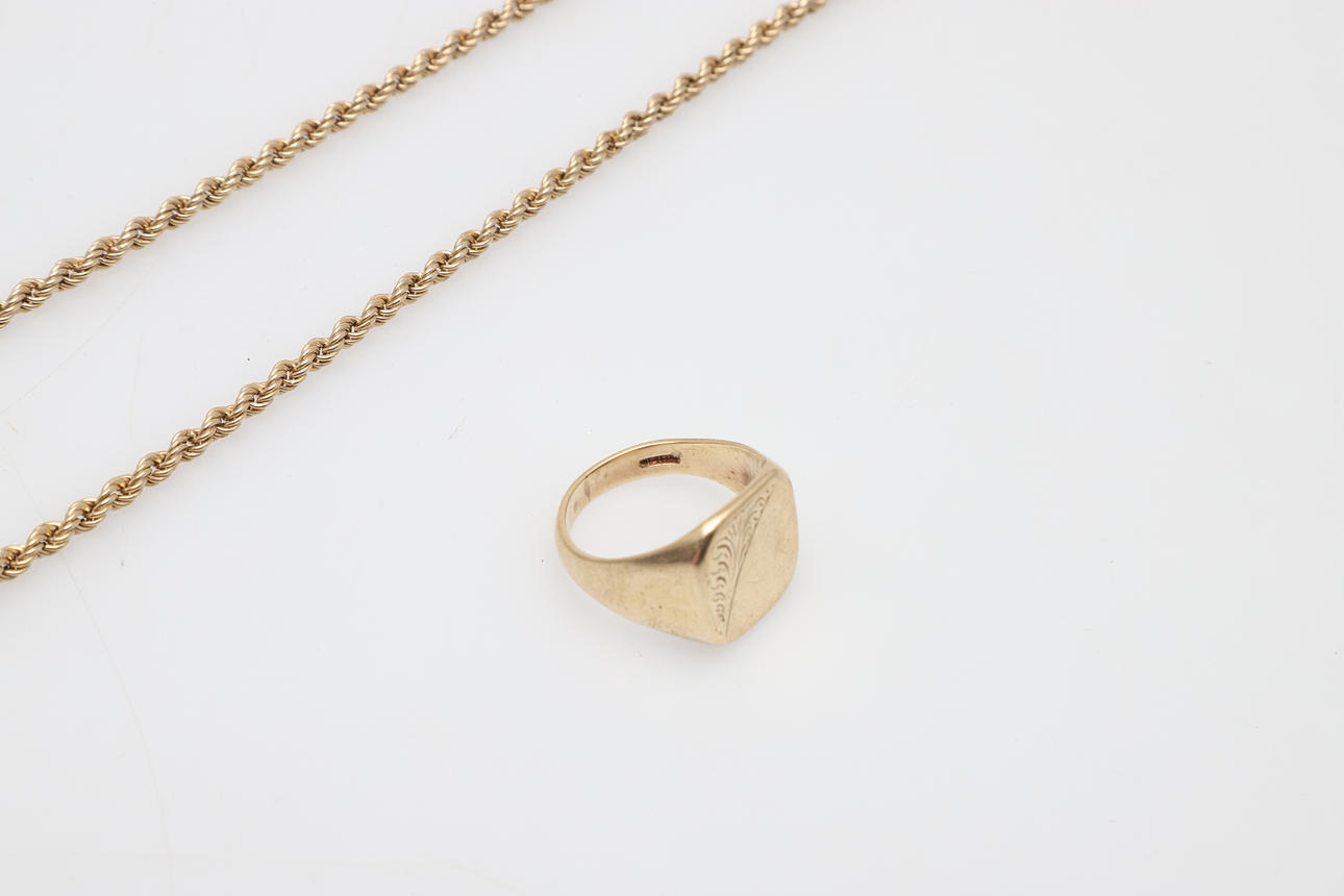 A 9CT GOLD SIGNET RING AND ROPE CHAIN.