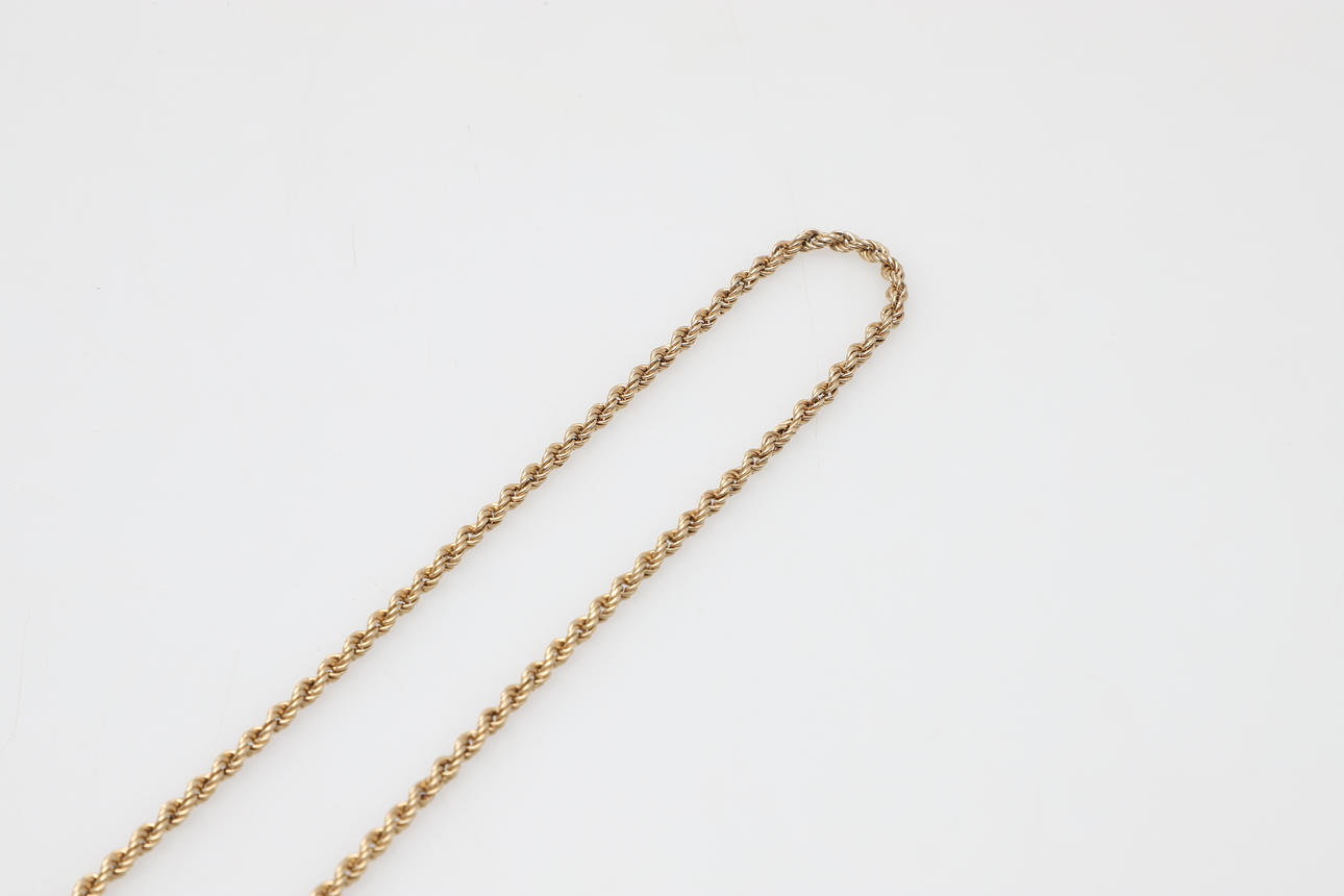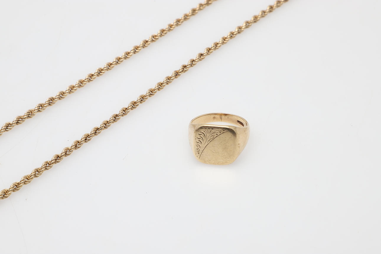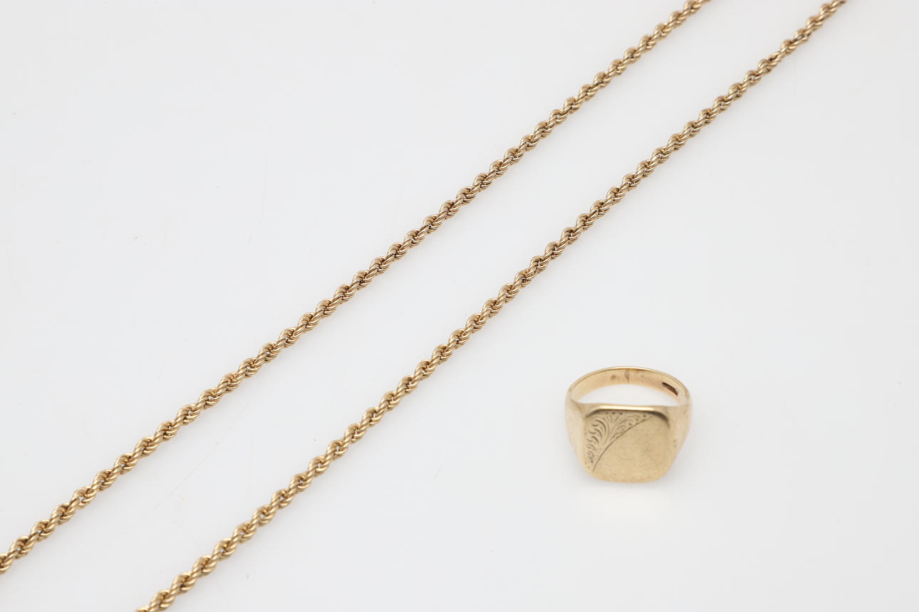 the gentleman's 9ct signet ring together with a rope neck chain, 53cm, 14g total.