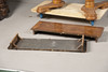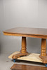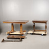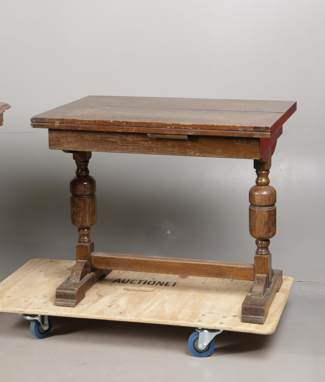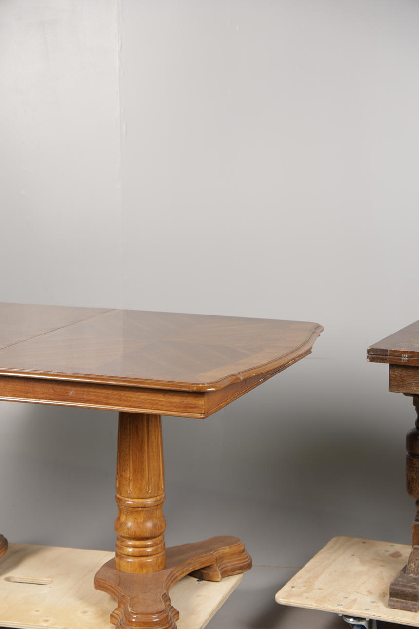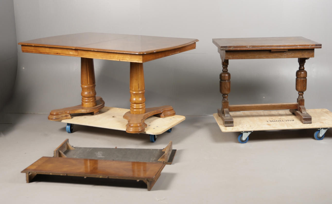 Raised on two columns, together with two extra leaves, 74cm height, 153cm length, 102cm depth in most compact form, each extra leaf measures 30.5cm width, together with a 20th Century dining table with fold over extending mechanism, raised on acorn columns united by a single stretcher, 76cm height, 91cm length, 60.5cm depth in most compact form.