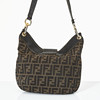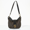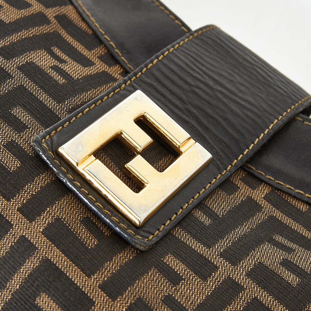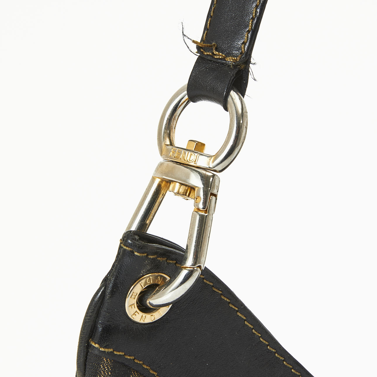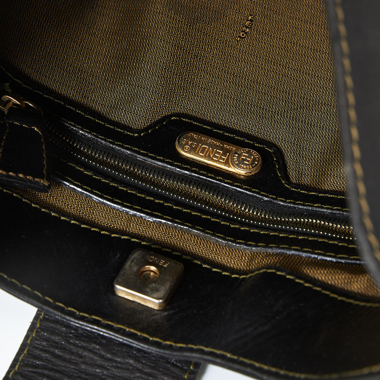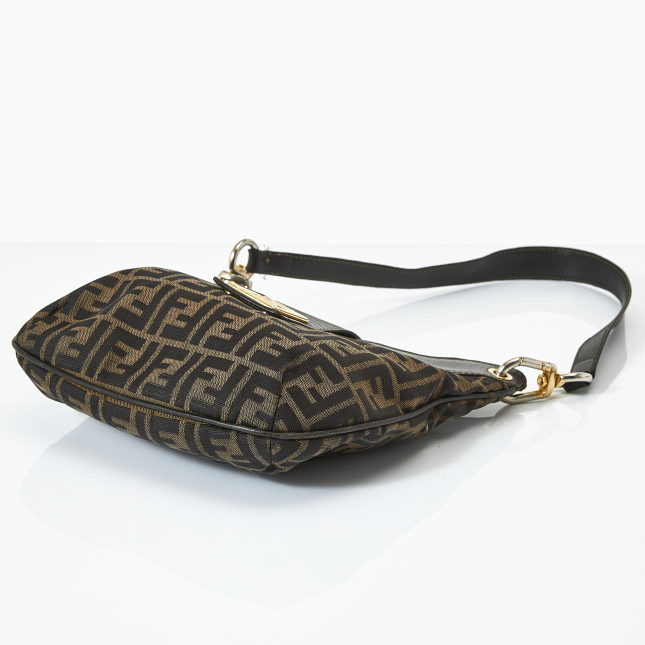 Canvas in Zucca, details in black leather, hardware in yellow metal, closure with magnetic button, lined in textile, inside with zipper pocket, dimensions approx. 29 x 21 x 7 cm.