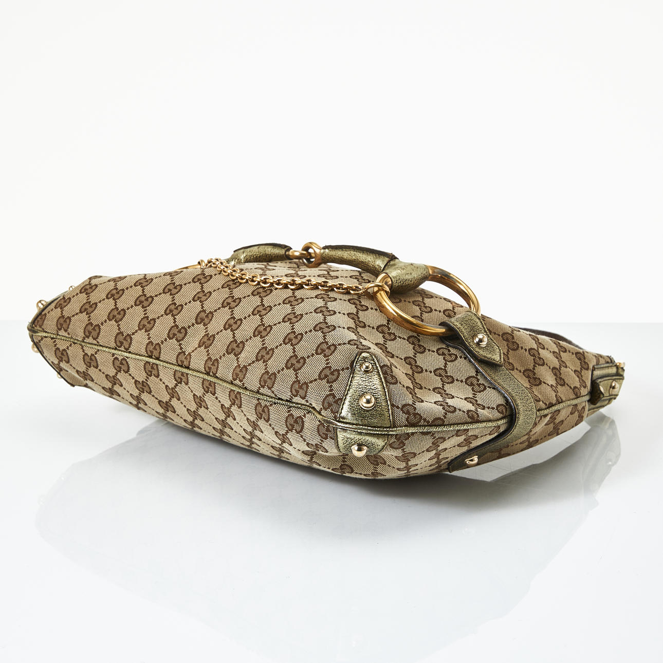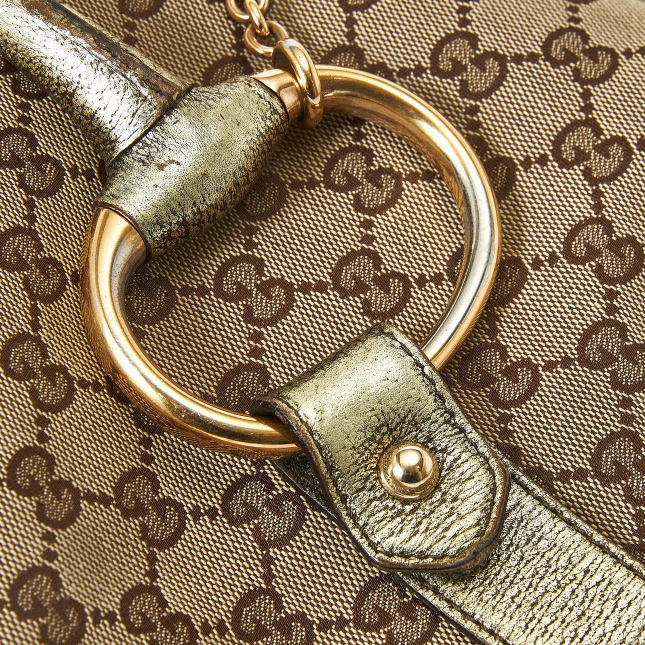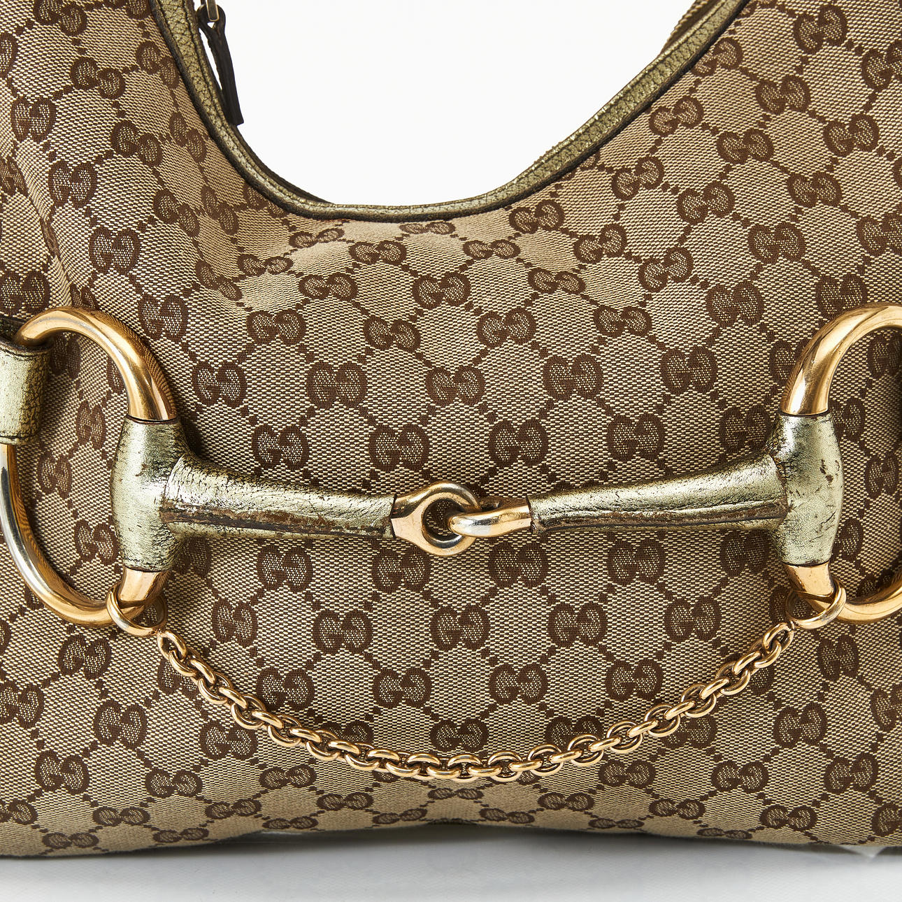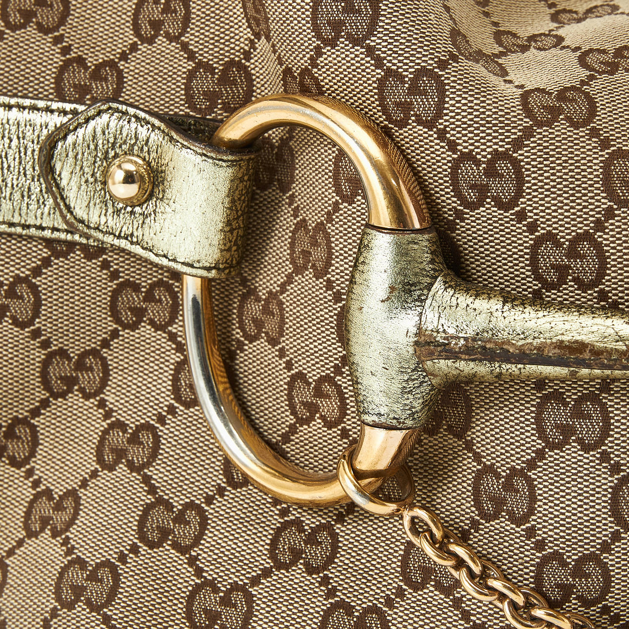 Monogram canvas, leather details in metallic, front with horsebit with chain, lined in brown textile, inside with a zip pocket, marked “Gucci made in Italy”, dimensions approx. 42 x 26 x 6, handle drop measured flat 18 cm.