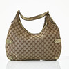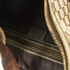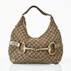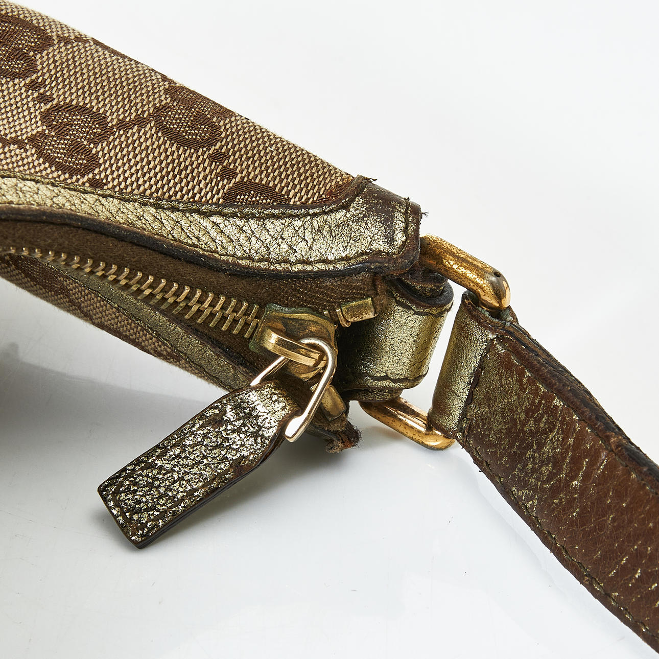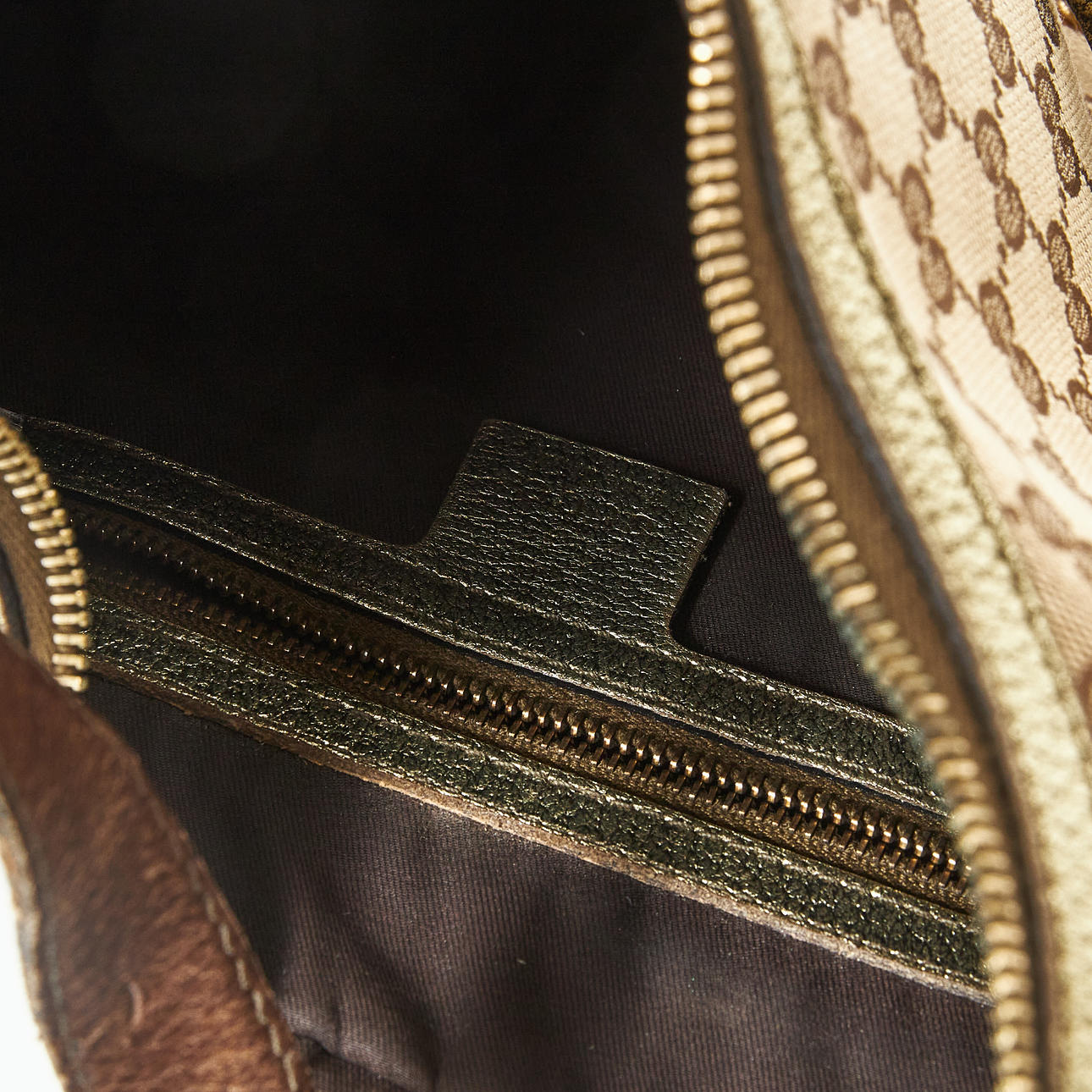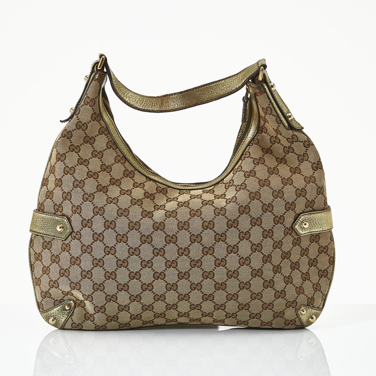 Monogram canvas, leather details in metallic, front with horsebit with chain, lined in brown textile, inside with a zip pocket, marked “Gucci made in Italy”, dimensions approx. 42 x 26 x 6, handle drop measured flat 18 cm.